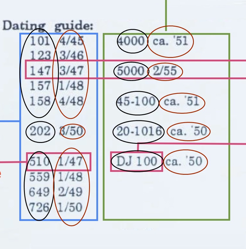 It also had a 500 series, with number snapshot points working exactly as did for the 100 series; there were also a 4000, 5000, 45-100, 20-1016 (more likely 20-1000 series, but the only entry known to the authors was 20-1016), and DJ 100 series, each of which has only a single entry shown in the guide. That may or may not mean that only one record appeared with a number of that sort.
