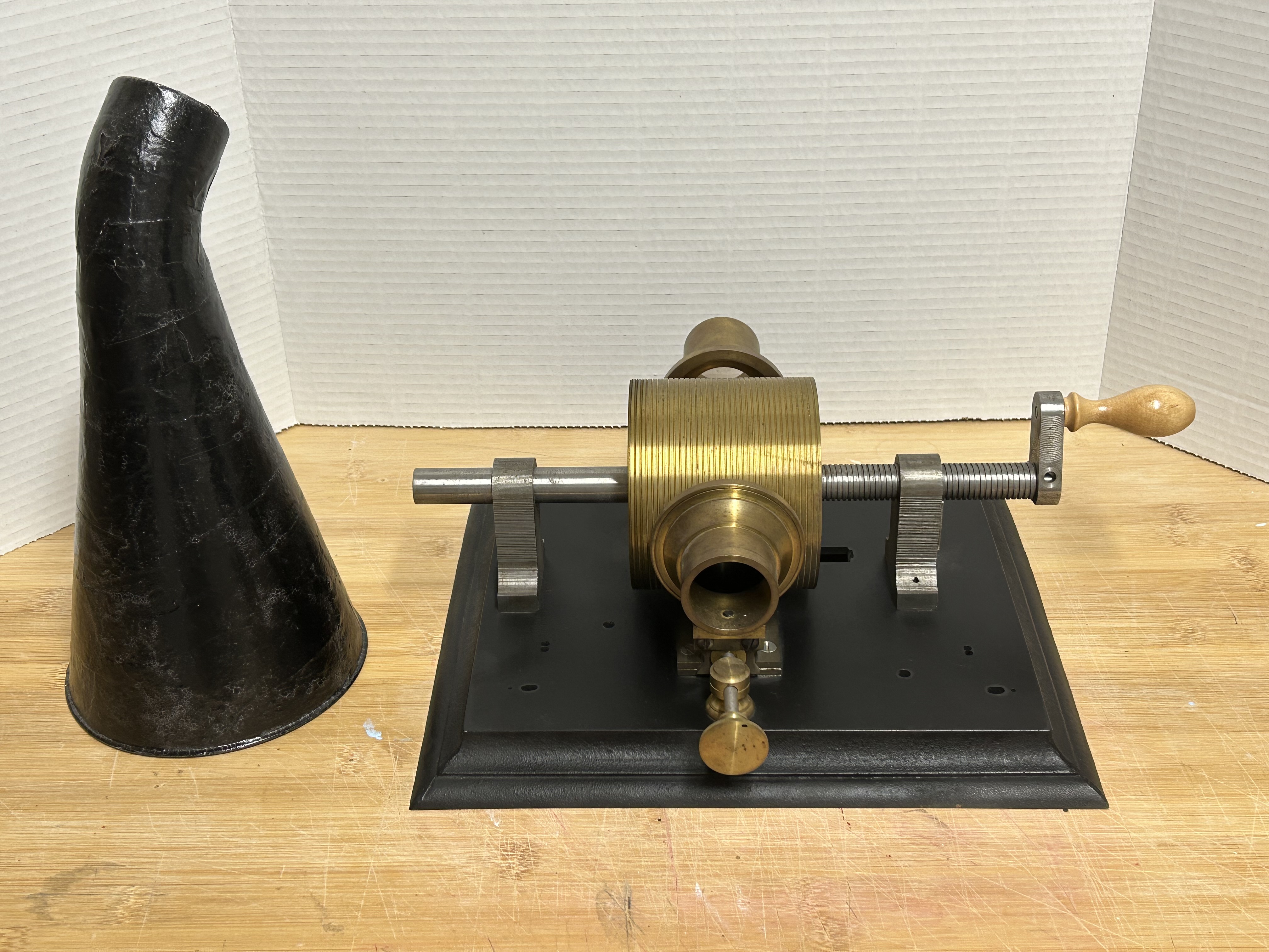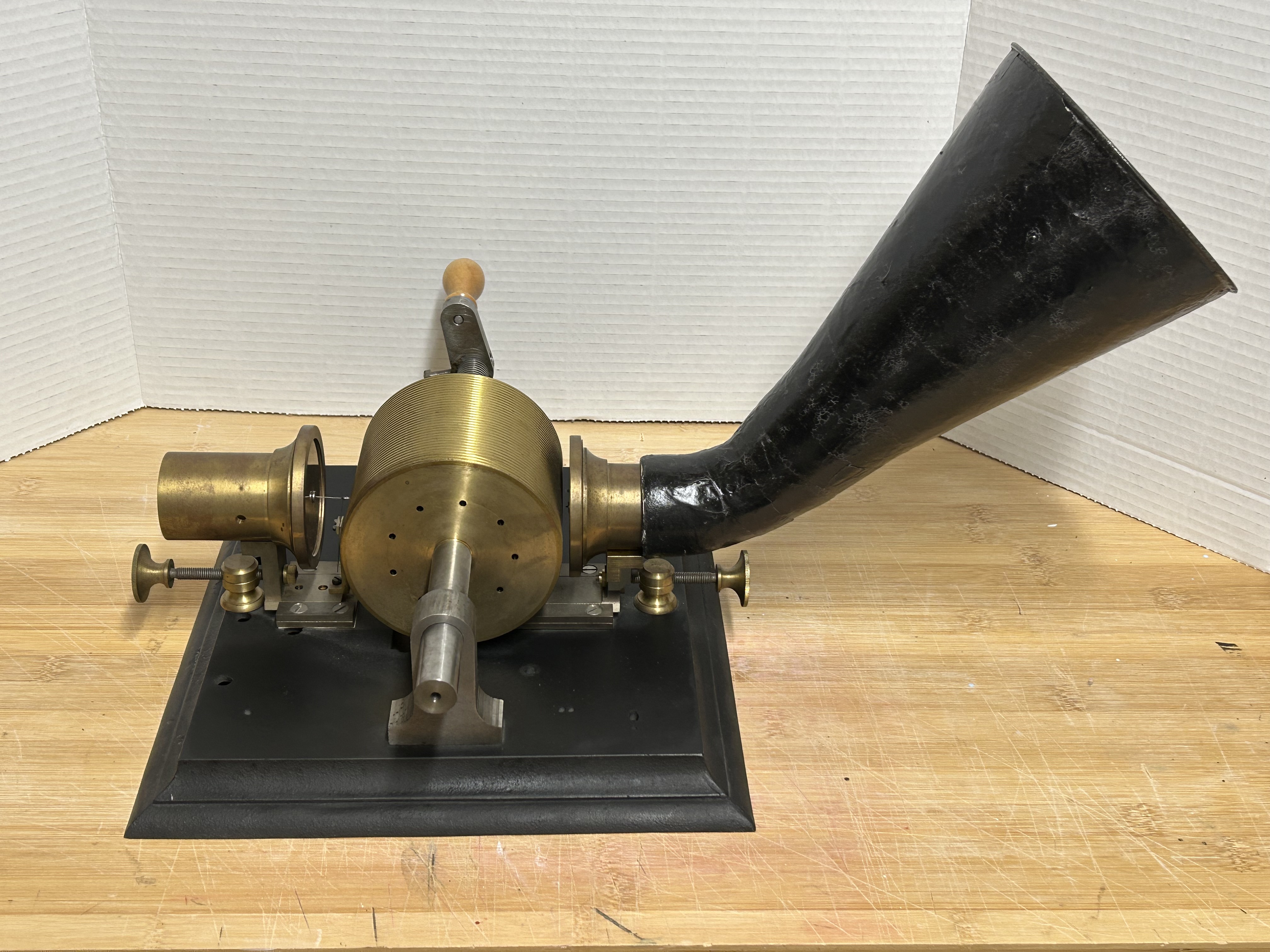 Phonograph was made by Bill Miller in 2011. He did a limited run of 20 machines. This is number 13. These replicas deemed to be the most accurate made to date, down to every original detail and imperfection. I am offering it for sale at considerable less than I paid for it 10 years ago. Price $2700 US plus shipping.