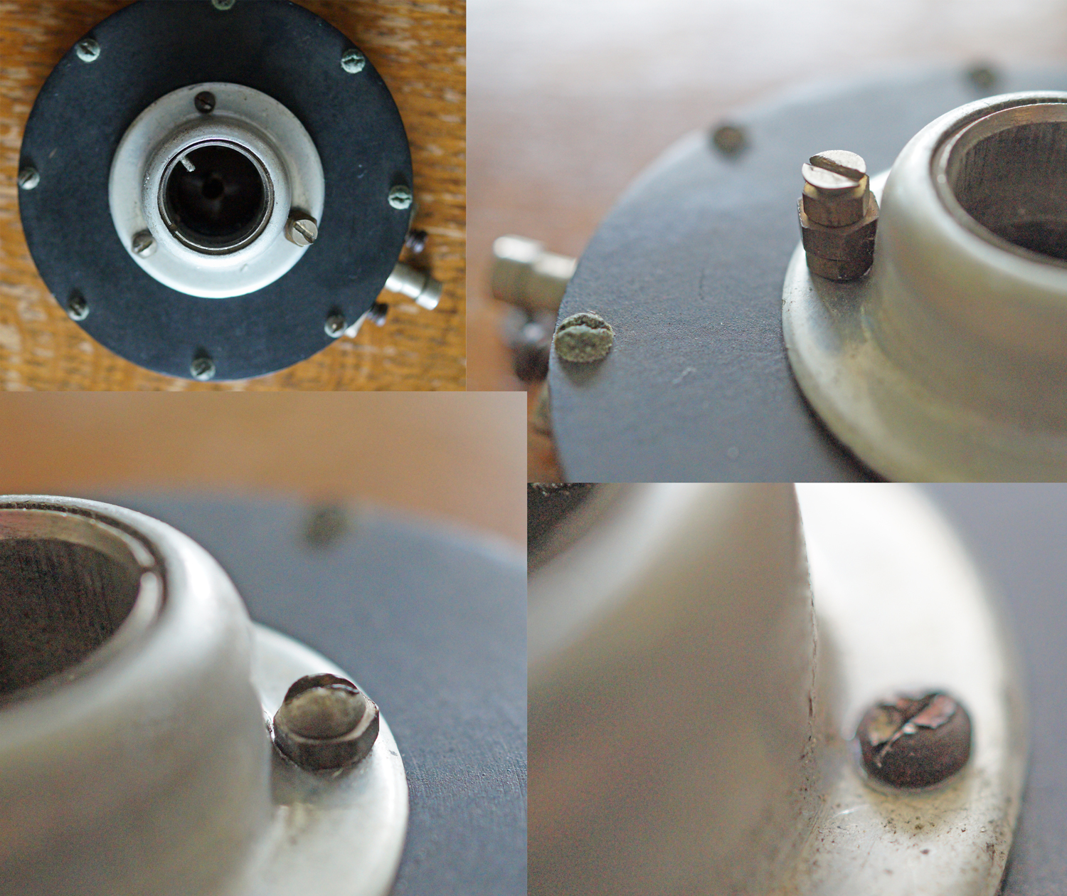 As you can see from my photograph below, the three screws near the centre seem to have been replaced. One has three 'nuts' one has on nut' and the other has none. It seems that the person who did it didnt have the correct screw-driver so some of the screws have been badly damaged. However, as I say, this does sound very good so maybe s/he did something right ha ha ! It is really great to see yours though and how it was originally made.