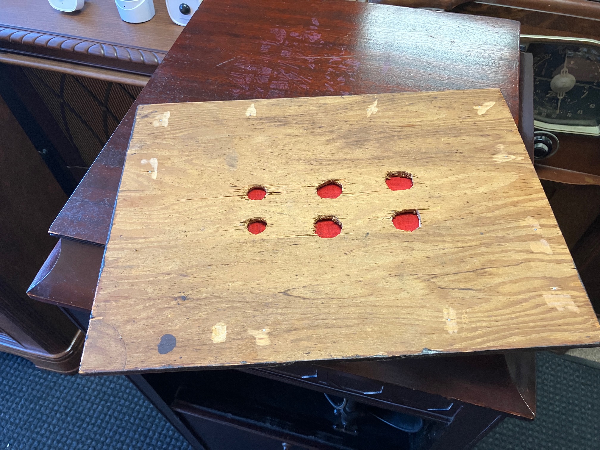 This is a very rare Edison S-19 Sheraton grill that is not mentioned in the Frow book. Note the precise linear hole diameter reduction when going from right to left.....the large holes let the large notes out, the medium holes let the medium notes out and the small holes let the small notes out. This linear reduction in hole diameter from right to left is a breathtaking invention that utilized a differential equation that contains one or more terms (the multiple sized holes) and the derivatives of other variables (i.e. the small holes) with respect to the another variable (i.e. the medium holes).