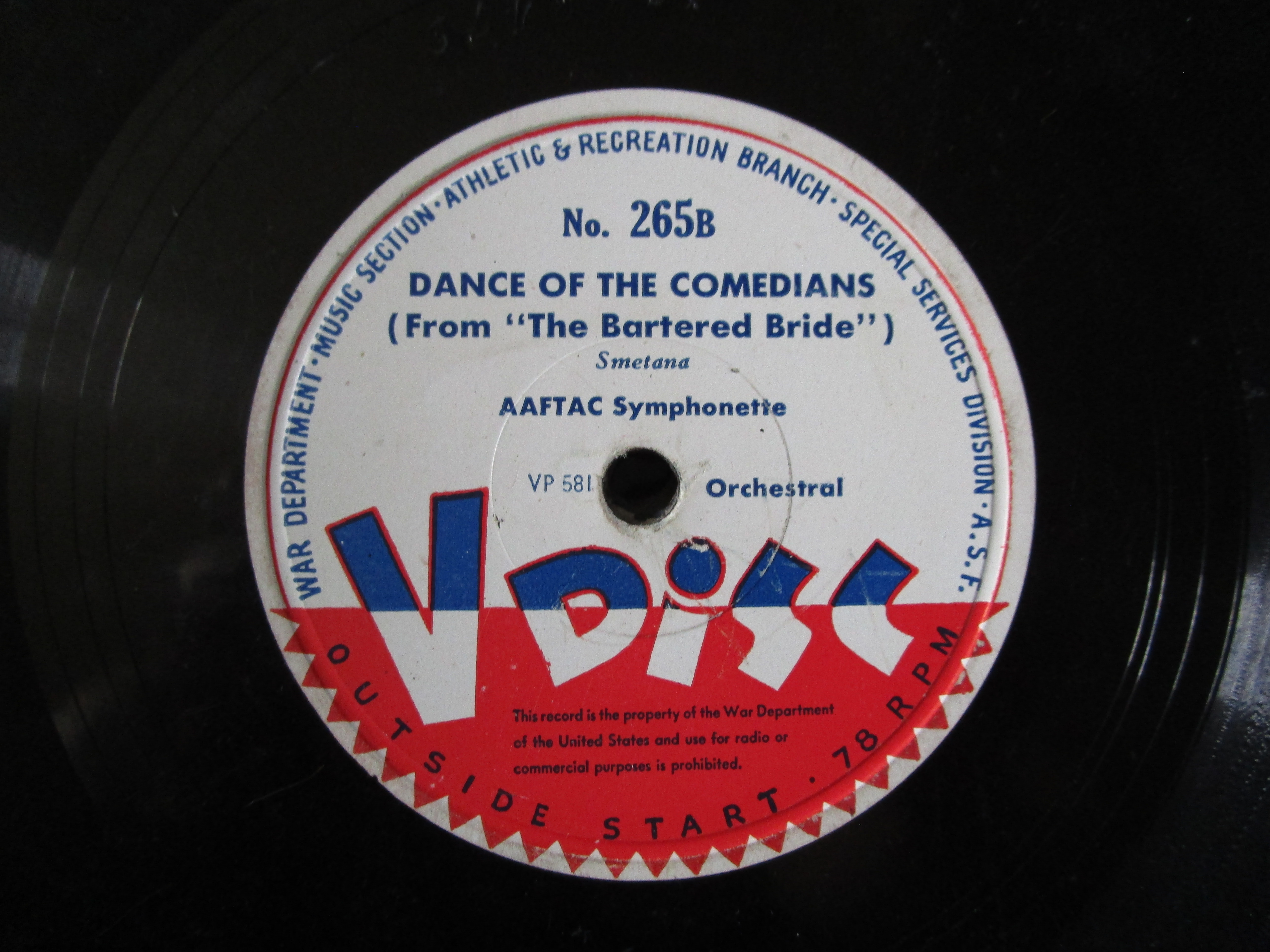 All are in good playable condition. Expect scattered light scratches and light scuffs typical of V-Discs played occasionally by WWII soldiers. Please see label pictures of both sides below. Send a PM with interest, PayPal Friends payment or Venmo or mailed check or money order. Packed securely, shipped promptly, USPS tracking sent to buyer.