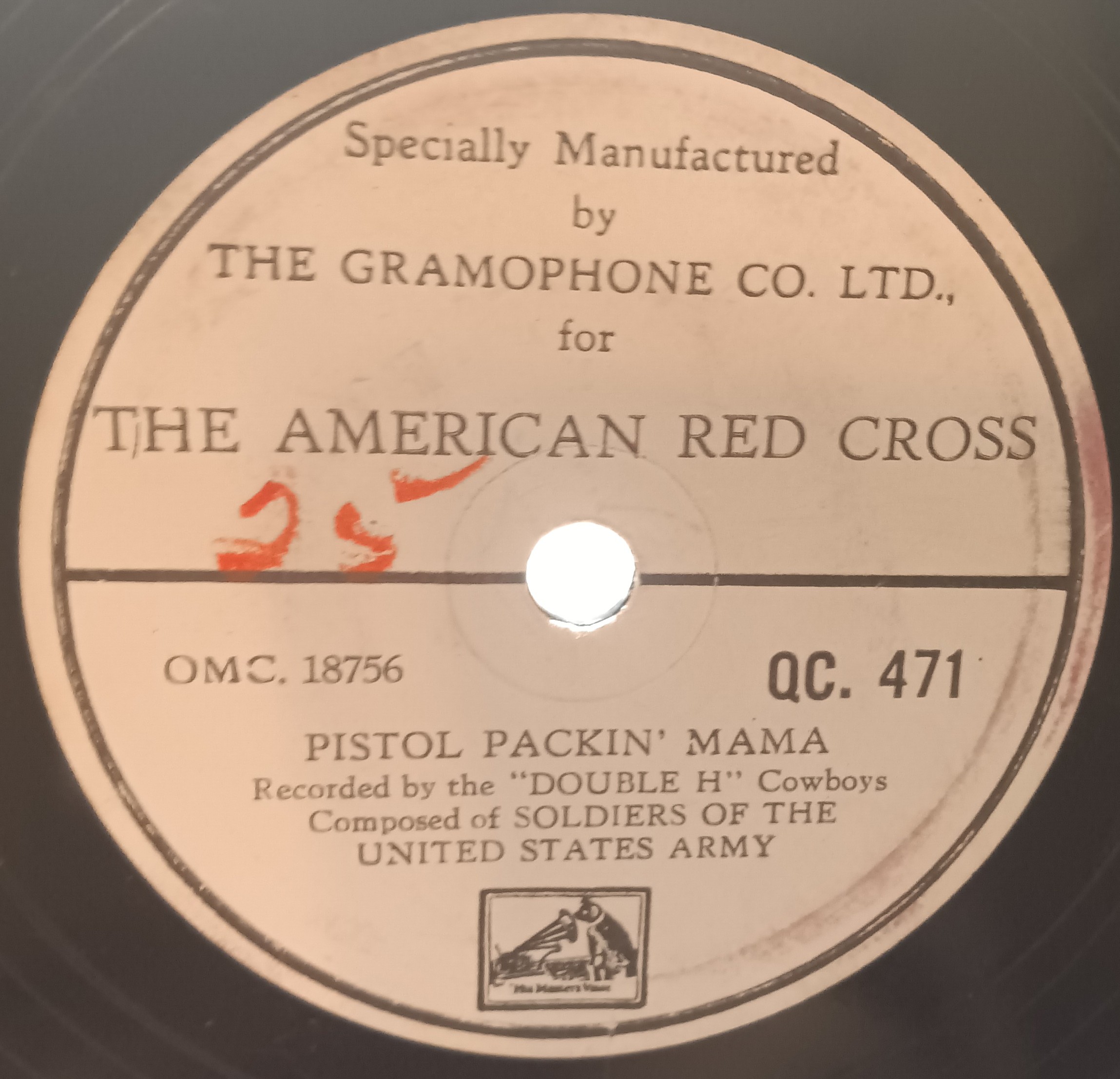 I recently acquired a Gramophone/HMV record (10-inch, 78 RPM) produced for the American Red Cross. The group is the Double HH Cowboys and the label says they are soldiers of the US Army. One of the tunes - Pistol Packin' Mama - dates the record to 1943 at the earliest. And that is about all I know about this record! My guess is this was produced in England during WW2, or shortly thereafter, by the Red Cross for entertainment of Allied troops.