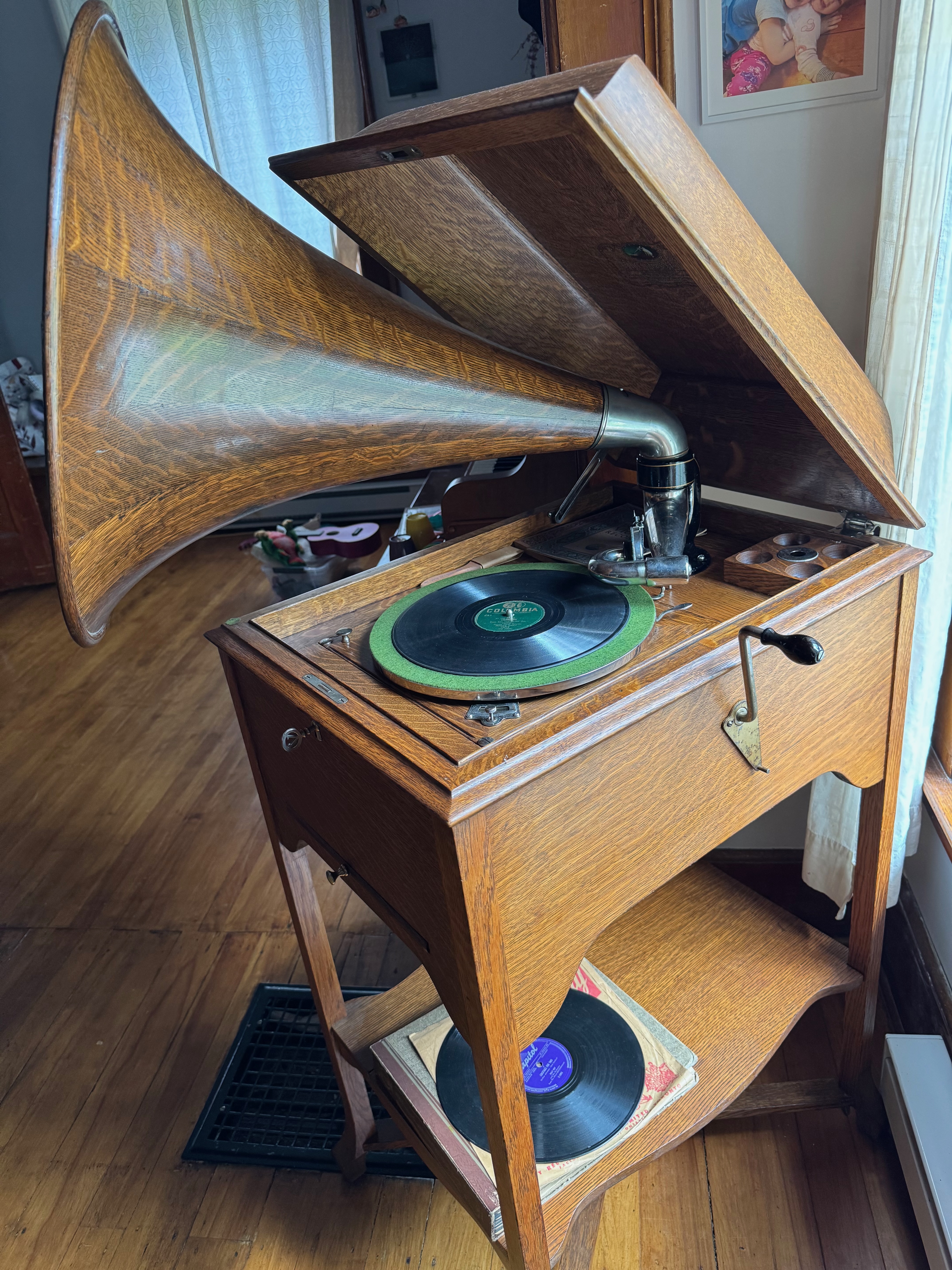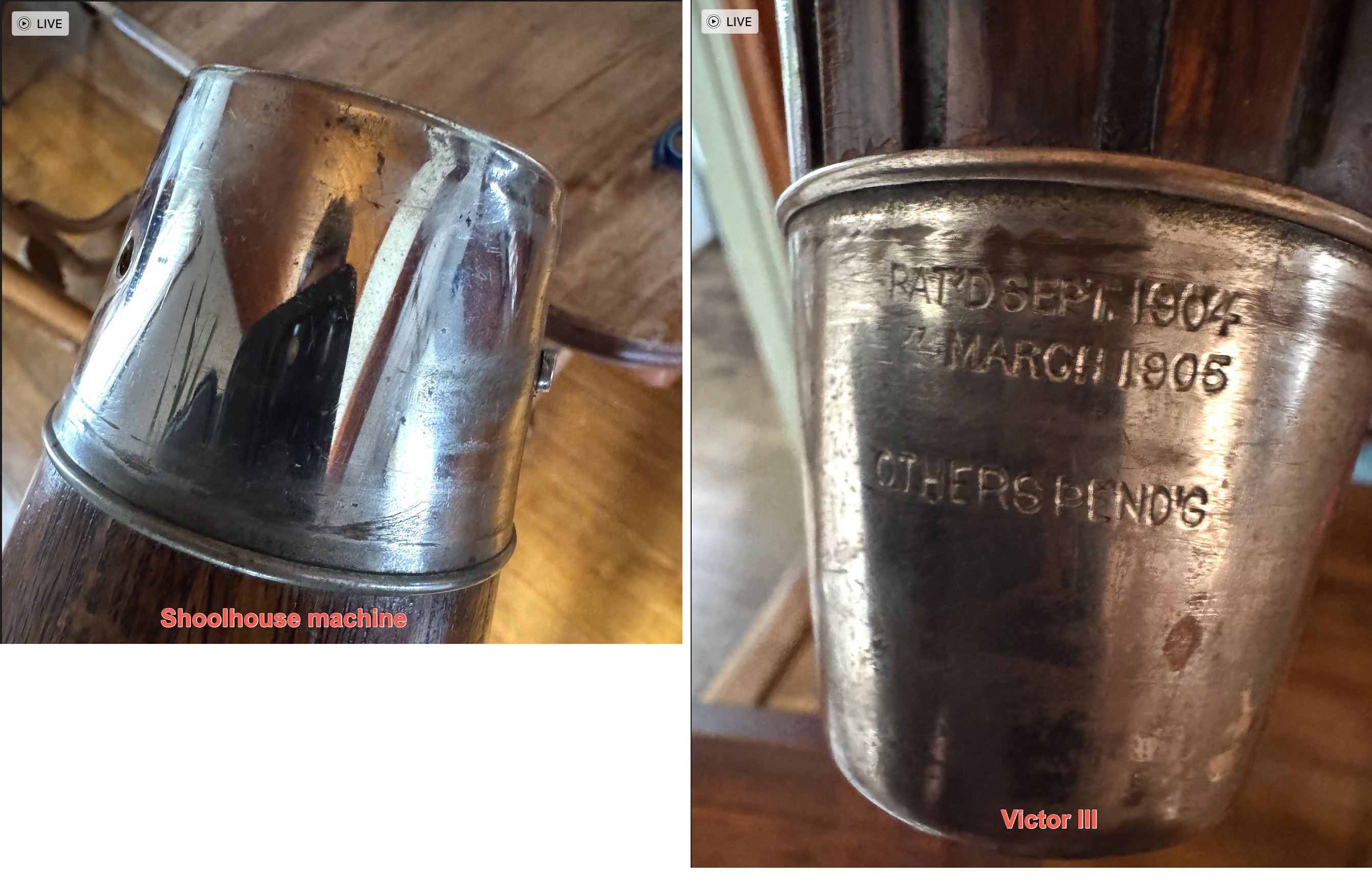 I bought a Schoolhouse Victrola last month, and I have 2 interrogations. Why nothing is written as Pattent 1905 as On my Victors III and V? What is supposed to be the small anchor? I never see it on other Shoolhouse machines. Thank you for your help