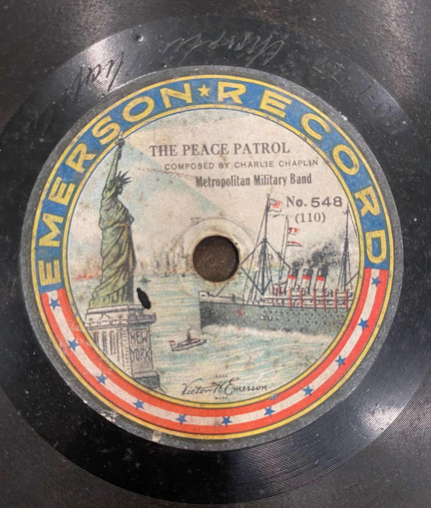 FOR SALE- Charlie Chaplin Emerson Record. A recording composed by Charlie Chaplin and signed by him as well. It has a slight crack which doesn't affect the play. First reasonable offer will own this rarity.