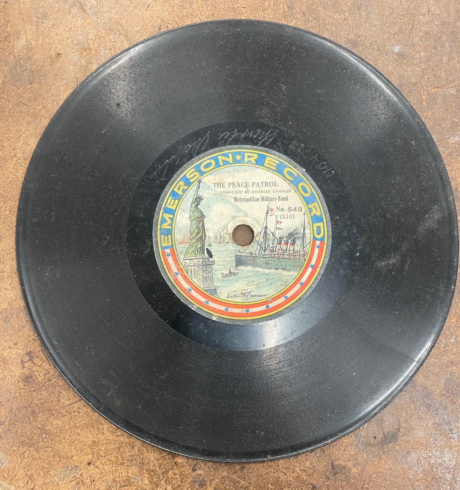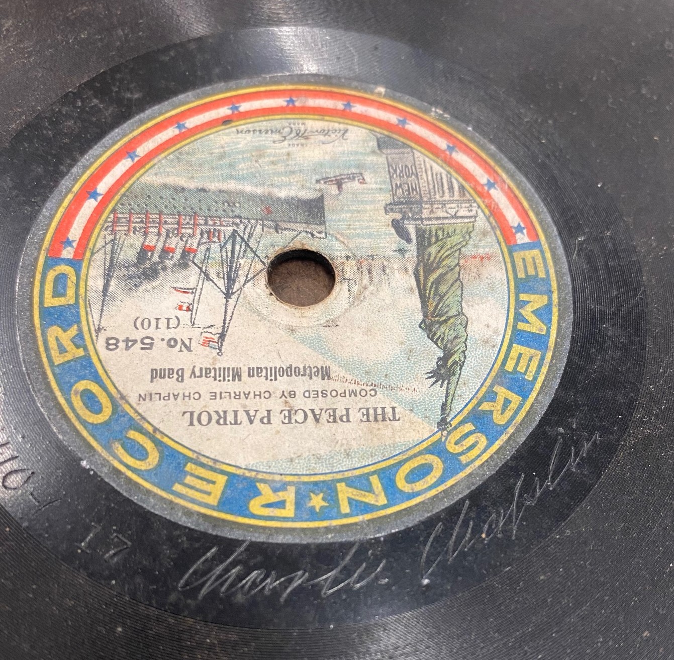 FOR SALE- Charlie Chaplin Emerson Record. A recording composed by Charlie Chaplin and signed by him as well. It has a slight crack which doesn't affect the play. First reasonable offer will own this rarity.