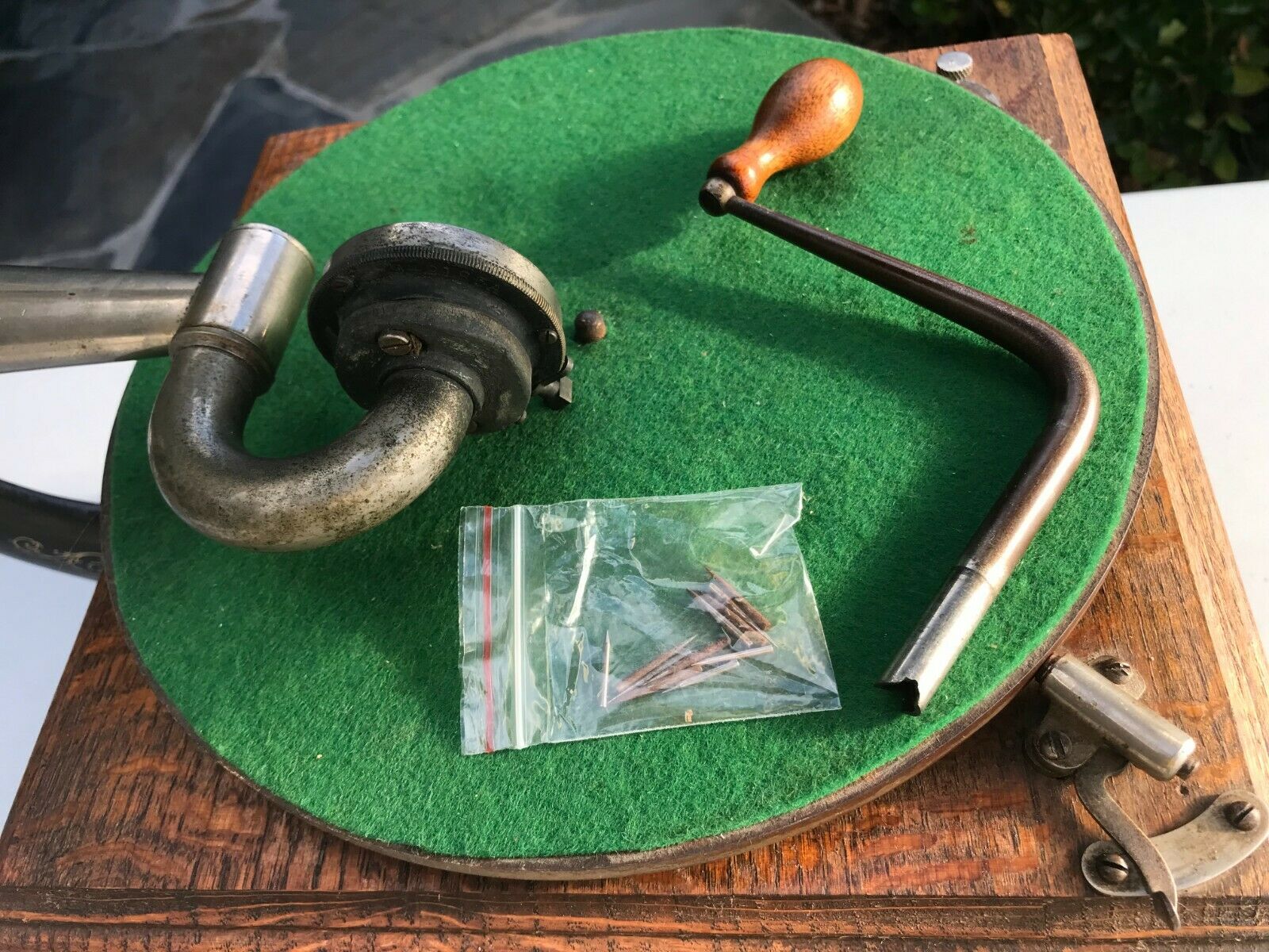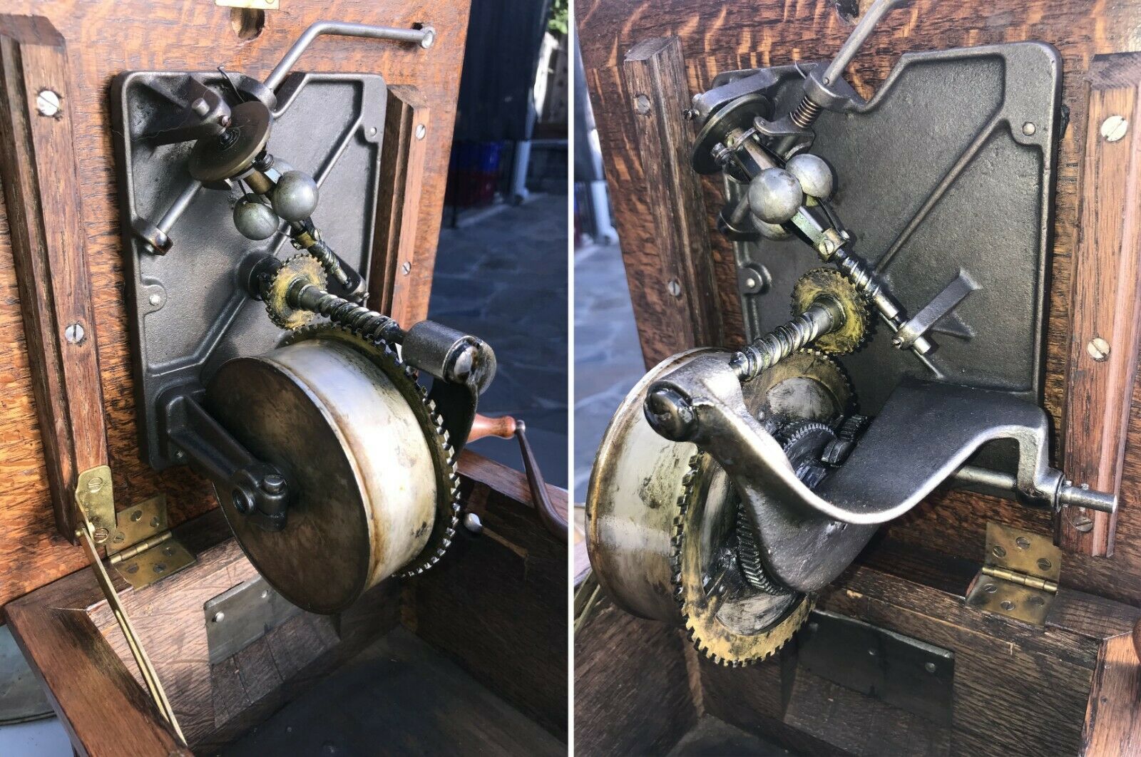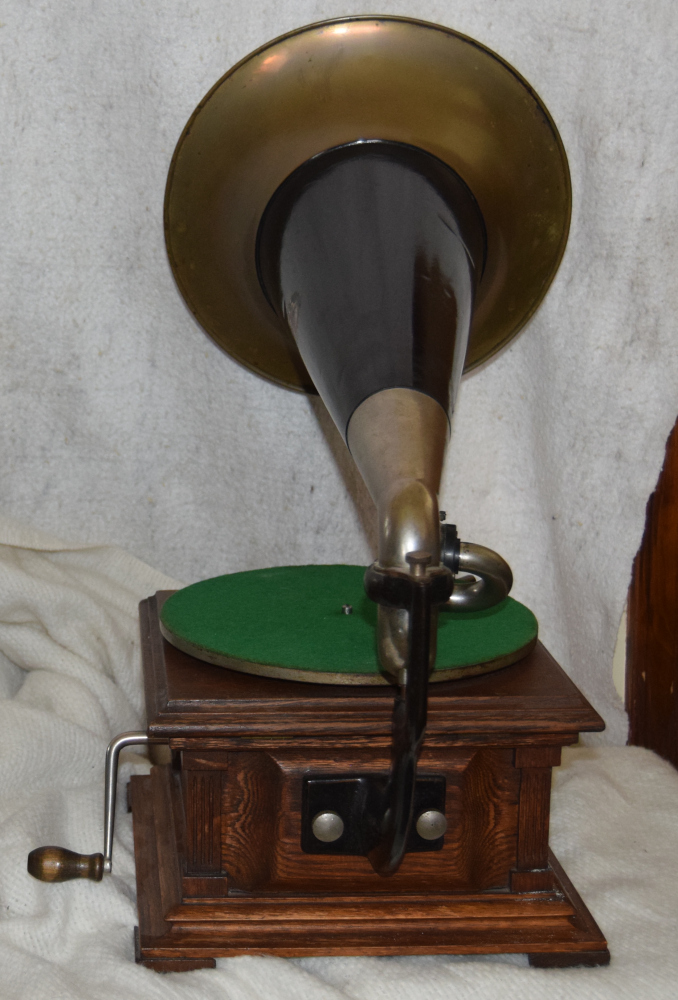 The cap that holds the bearing looks altered, (JB Weld, welded? It is hard to know without in person inspection. I can only compare it to mine and something does not appear correct, although it may function fine. It may be possible that this part was cast as a single piece, but it still looks altered. That is supposed to be a threaded cap that holds a single ball bearing). The crank is not factory slotted. My guess is that it is a threaded crank that has been crudely notched to engage the pin on the winding shaft. I am just pointing these concerns out to any forum member that may be considering this machine. The crank is definitely not correct. The serial number is fairly low, but this is not a real early example . The early variant had an 8” turntable. This particular machine is also missing it’s feet, (unless the early machines did not have them). I am not trying to pick the machine apart. I just wanted to draw attention to what I see as negatives. My opinion that it is a bit overpriced is just that. It is of course worth different amounts to different collectors.