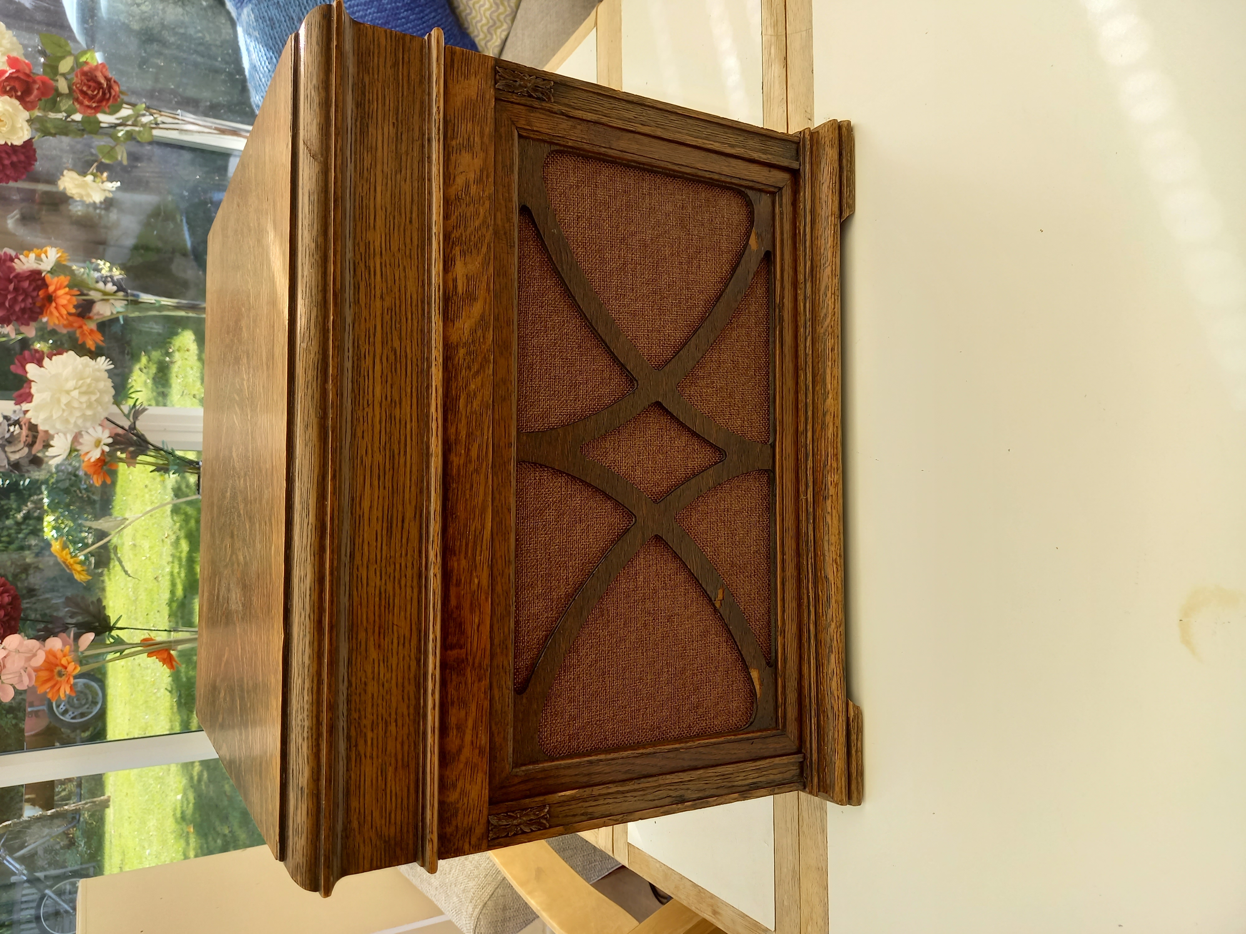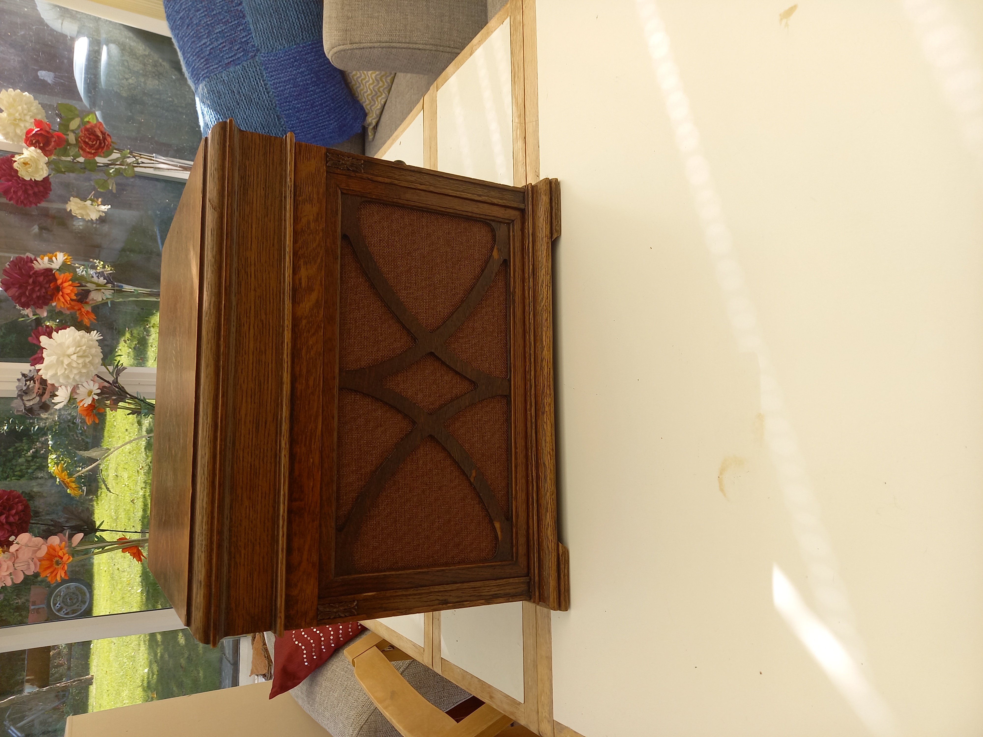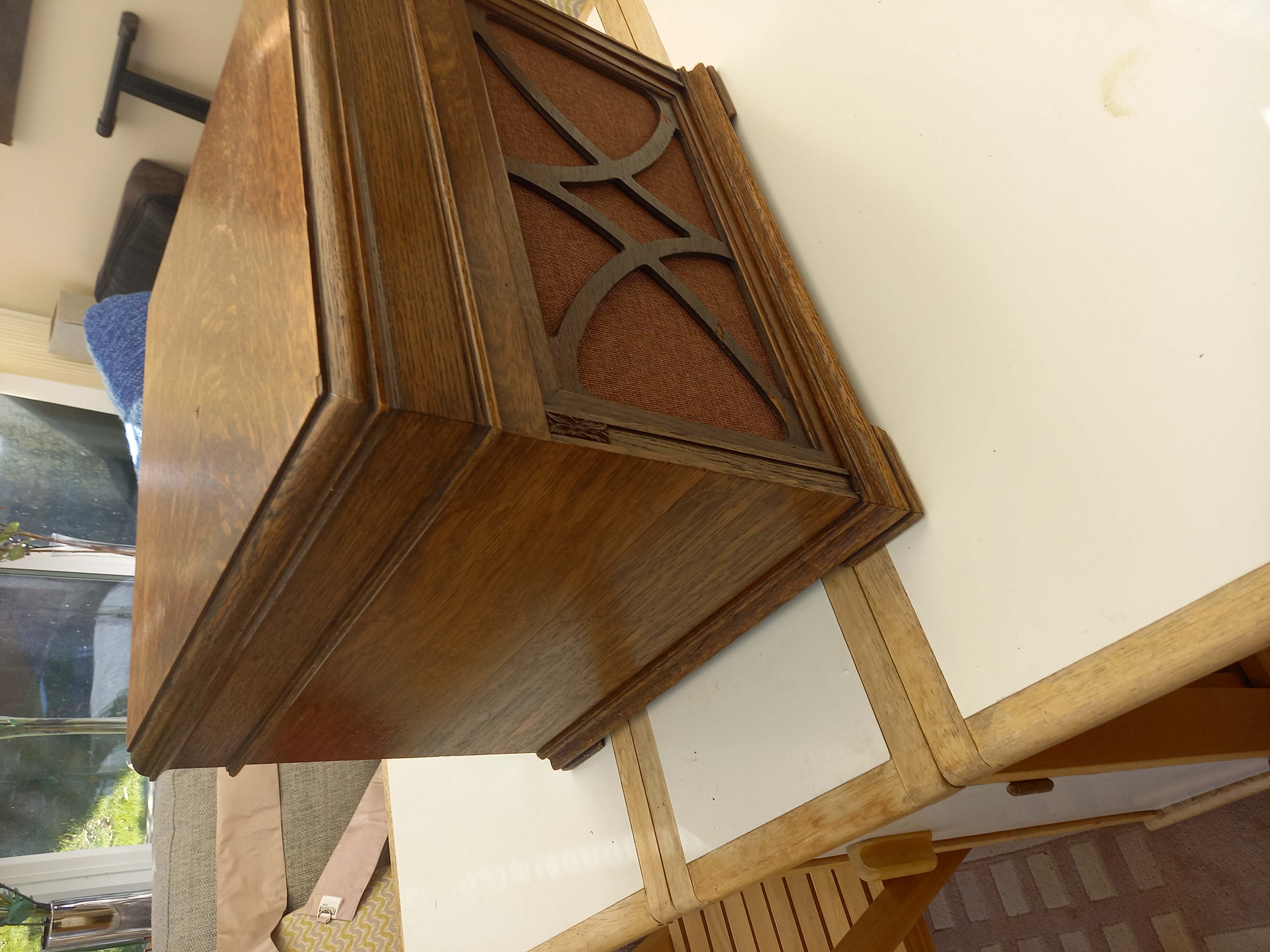 The reason I think it has been refinished is because the grille is much darker than the rest of the case (which wouldn't normally be tackled by an amateur restorer for obvious reasons) and you can see where the veneer has chipped off. With the replaced grille clothe I personally don't see this making more than £50-75 so if you do not wish to follow Roger's advice with regard to offering postage on Ebay, I would suggest putting it into a local auction where buyers are typically looking for odd and unusual items (to them anyway) which are cheap. I think it might raise £50 on a good day and you won't be responsible for anything if it gets lost in shipment.