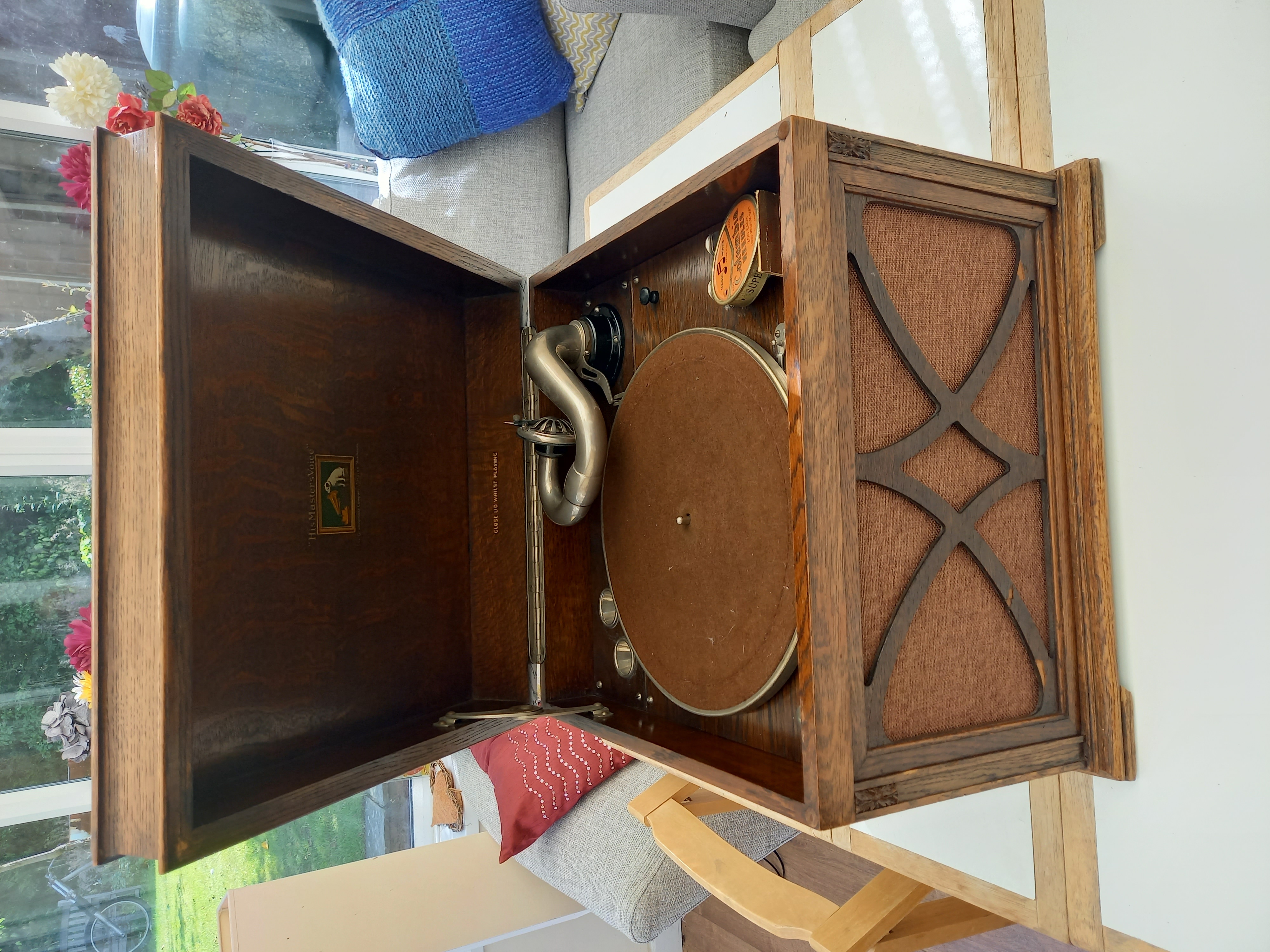 I inherited an HMV 130 gramophone from my Dad, who I think in his turn had inherited it from his parents. It was in a slightly sorry state when I got it with the speaker cloth mostly disintegrated, cracks in the speaker grille, and the mechanics pretty well gummed up when I lifted out the deck and took a look.