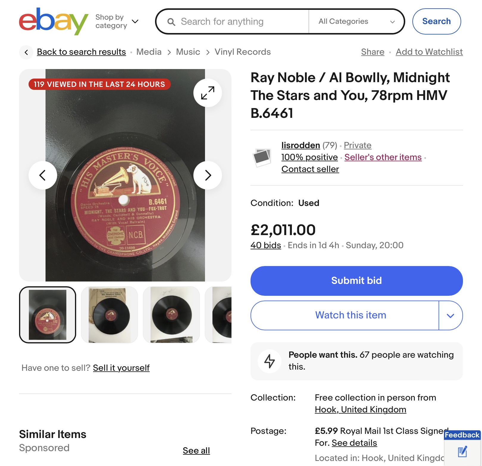 £411 is far more reasonable... Was an instrumental version of this ever released? Something I've wondered for a while, because while it is a beautiful song, I don't really care much at all for Al Bowlly's voice. A hot take, yes, and I mean zero offense to all of the Al Bowlly fans of this talented vocalist, but he always sounds to me like he is on the cusp of a yawn.