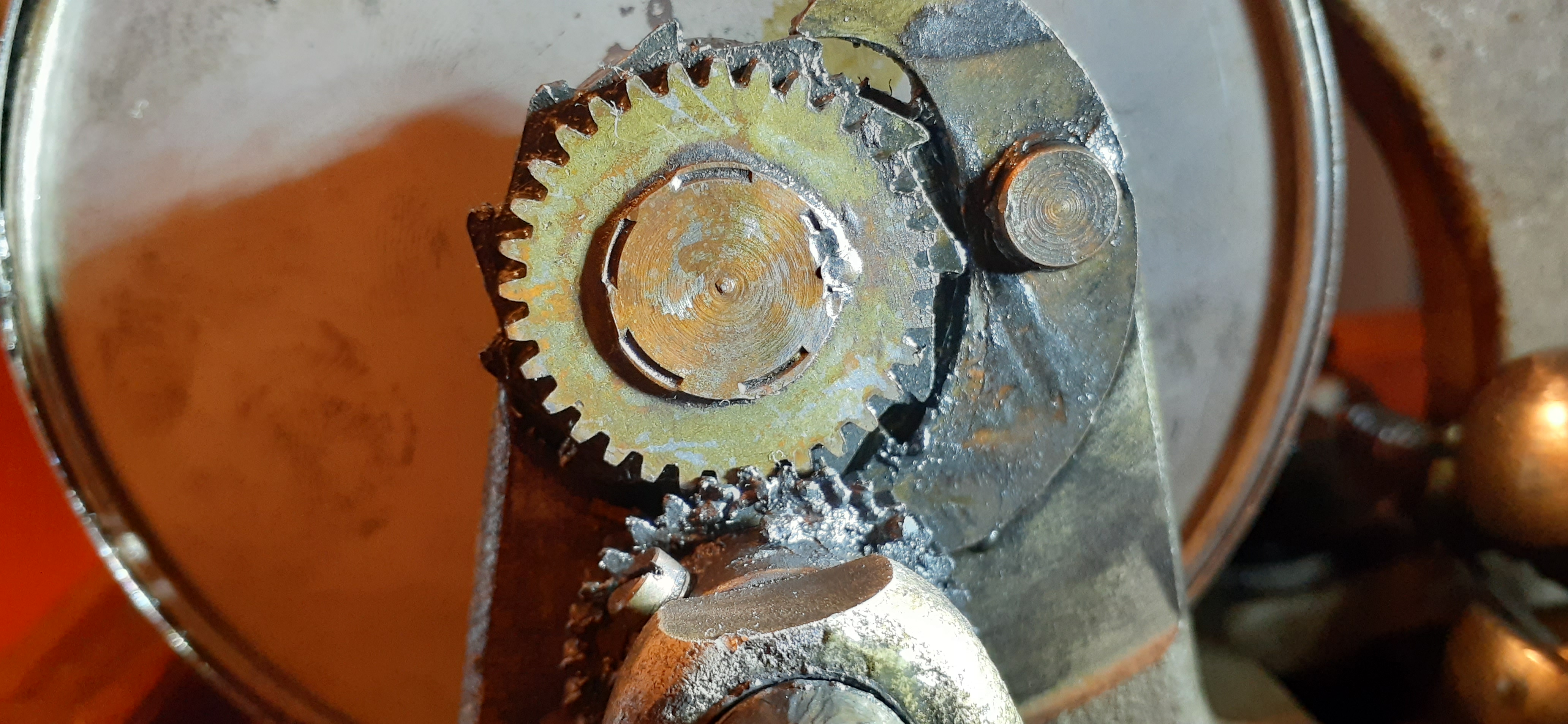 *Meaning, the gear that's on the shaft where the crank threads in, not the gear on the barrel arbor. Or, in other words, the gear that held on with the setscrew.