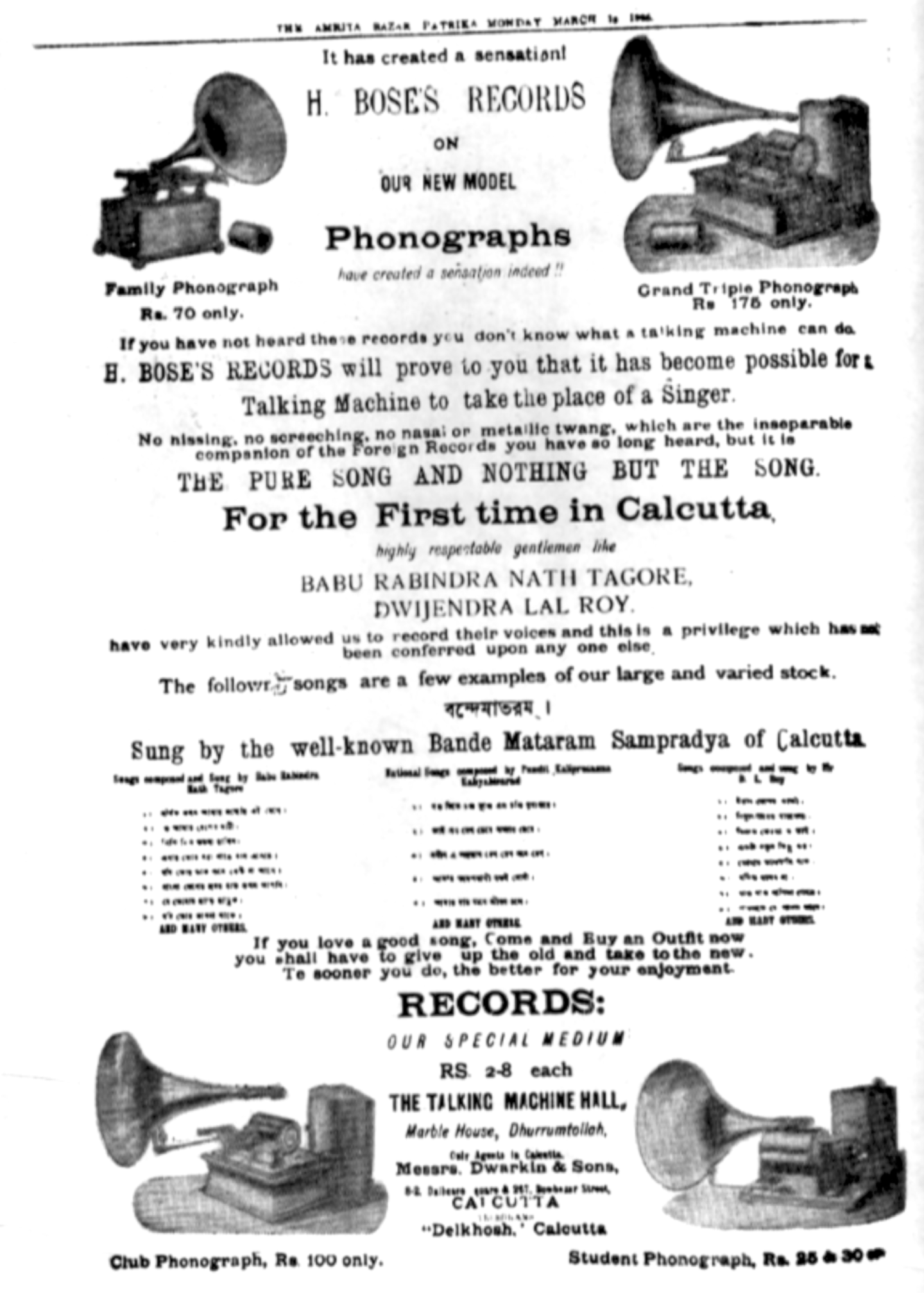 The other day I found an advert, promoting four different models of expensive phonographs, published in Bengali Language Newspaper Amrit Bazar Patrika circa 1906. Sharing for those interested in the history of talking machines. Someone may like to explain the models in the picture and their origin.