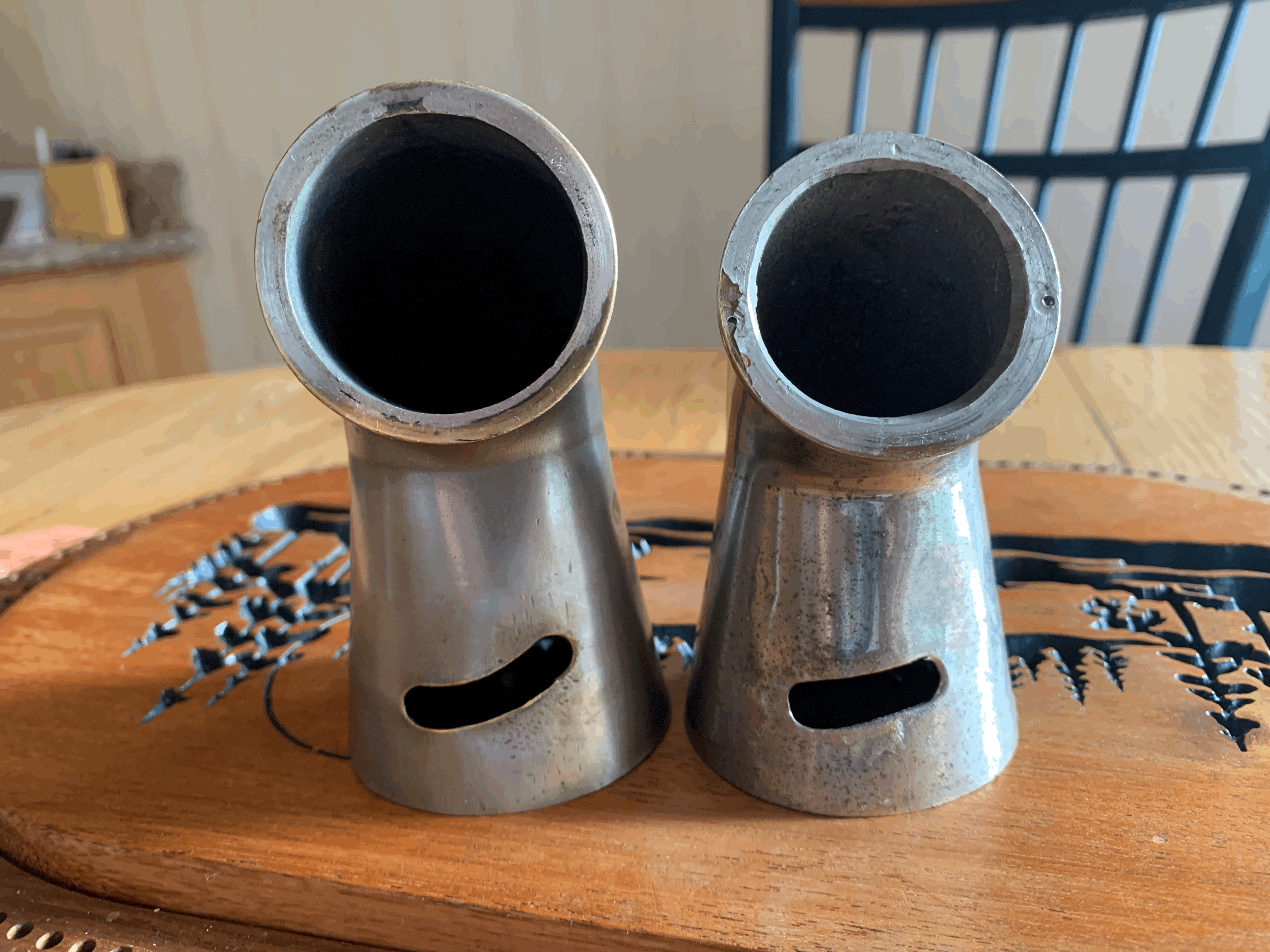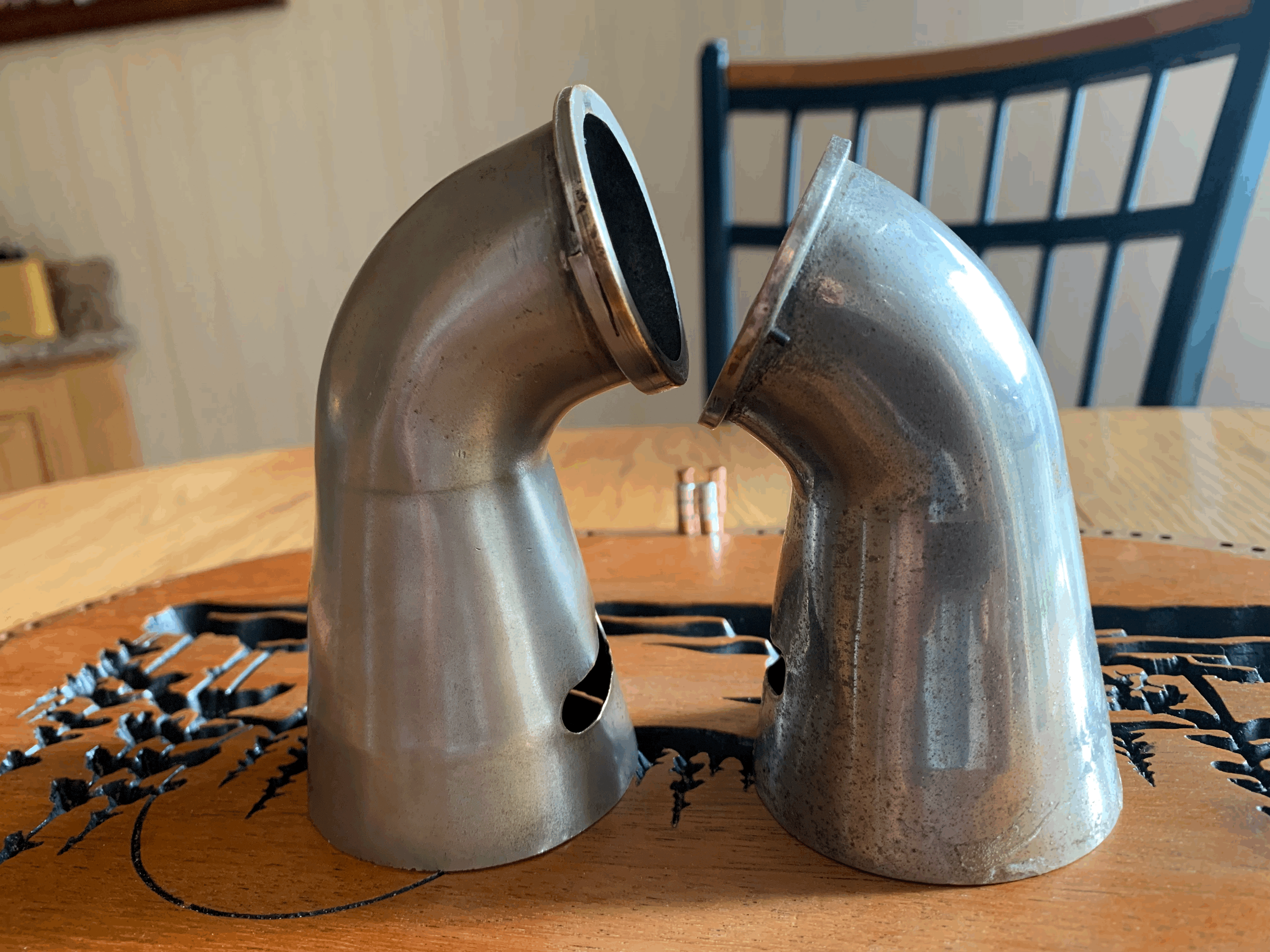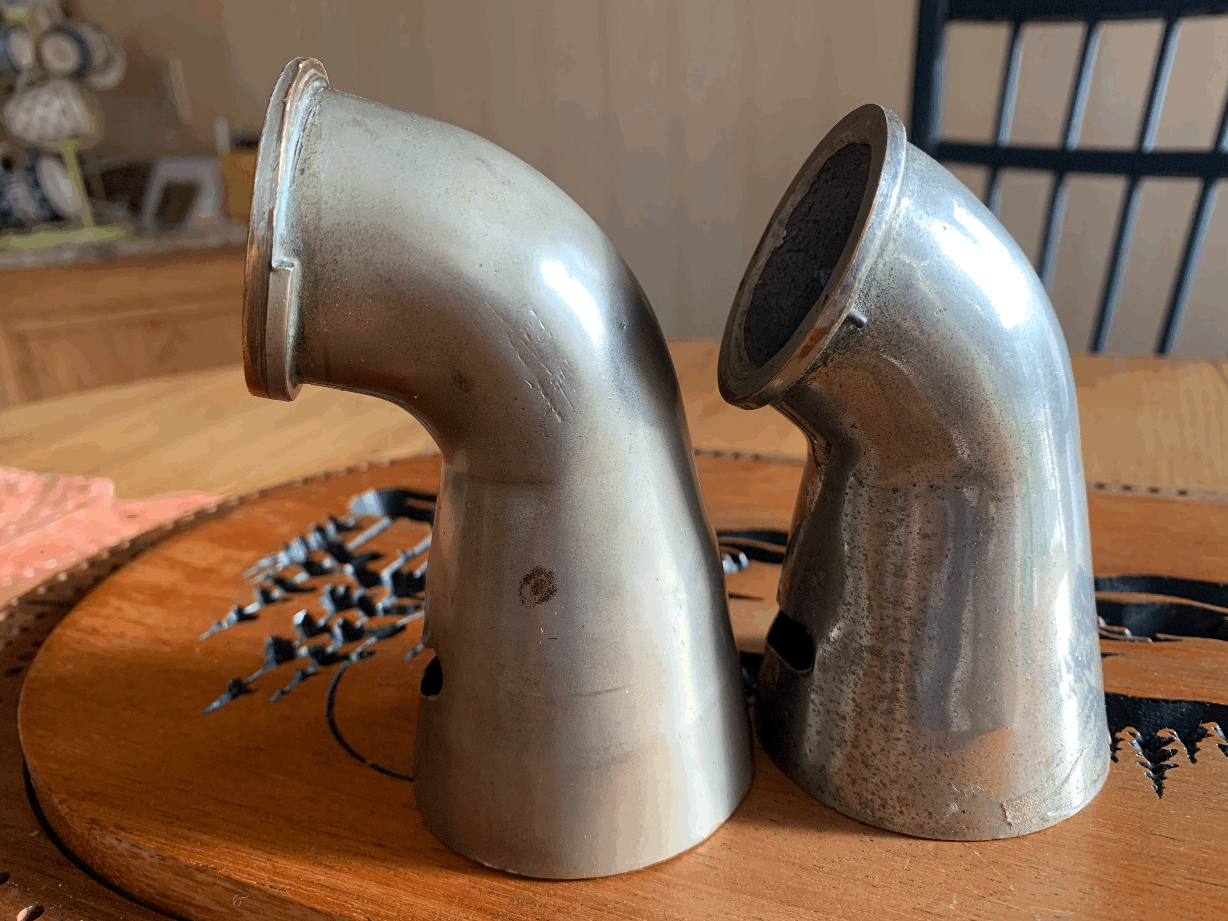 I bought a Victor III size elbow that's shorter than another Victor III elbow. The short one has pins to limit the movement while the other has a raised portion of the elbow to limit movement. I've always believed the pins were for early rear mount machines. When Victor realized their shortcomings they beefed up the back side of the elbow to limit movement. My question is more about the length of the elbow. The distance from the opening to the slot is the same on both elbows. Your thoughts would be appreciated.