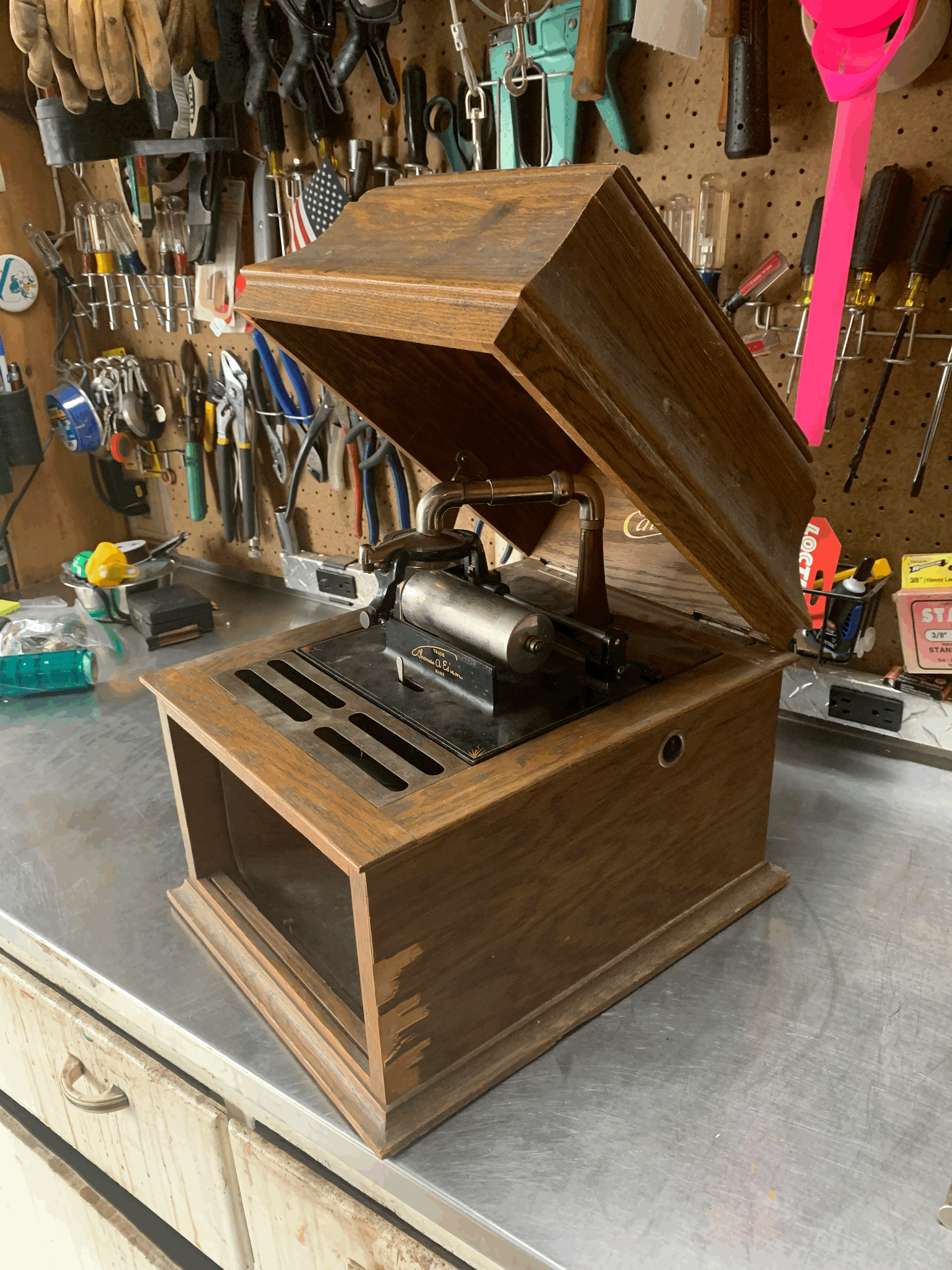 I have a nearly complete Amberola DX parts machine. It's missing the crank and front grill. What do you need for your machine? This Amberola was built basically from a Fireside mechanism. The motor is clean and complete and the deck is clean. When I tried winding there was no resistance so I suspect a broken or disconnected spring near the center of the spring barrel. From the photos you can see the inside grills, the Fireside type mechanism, the untested Diamond Model B reproducer, the horn, and much more.