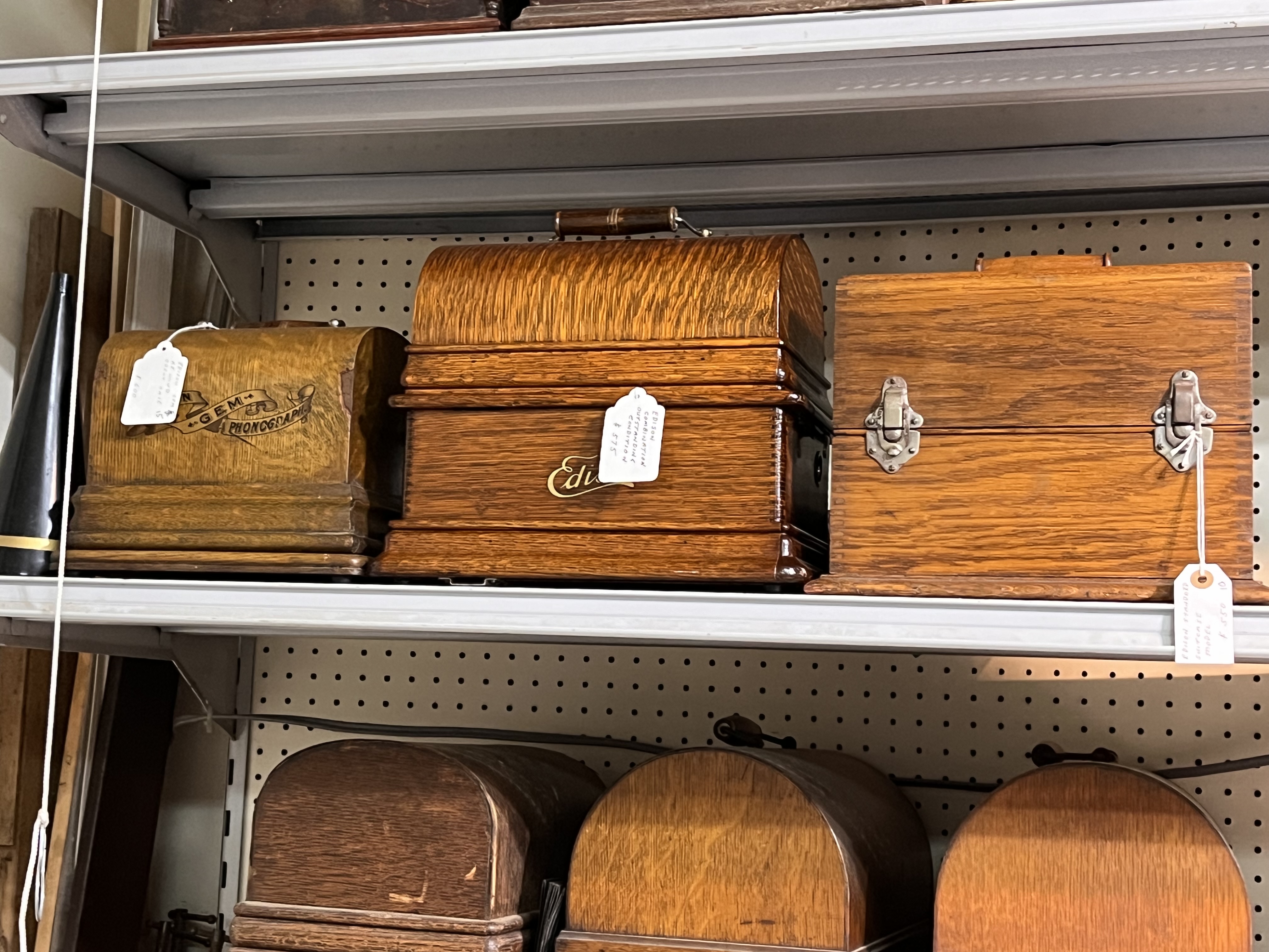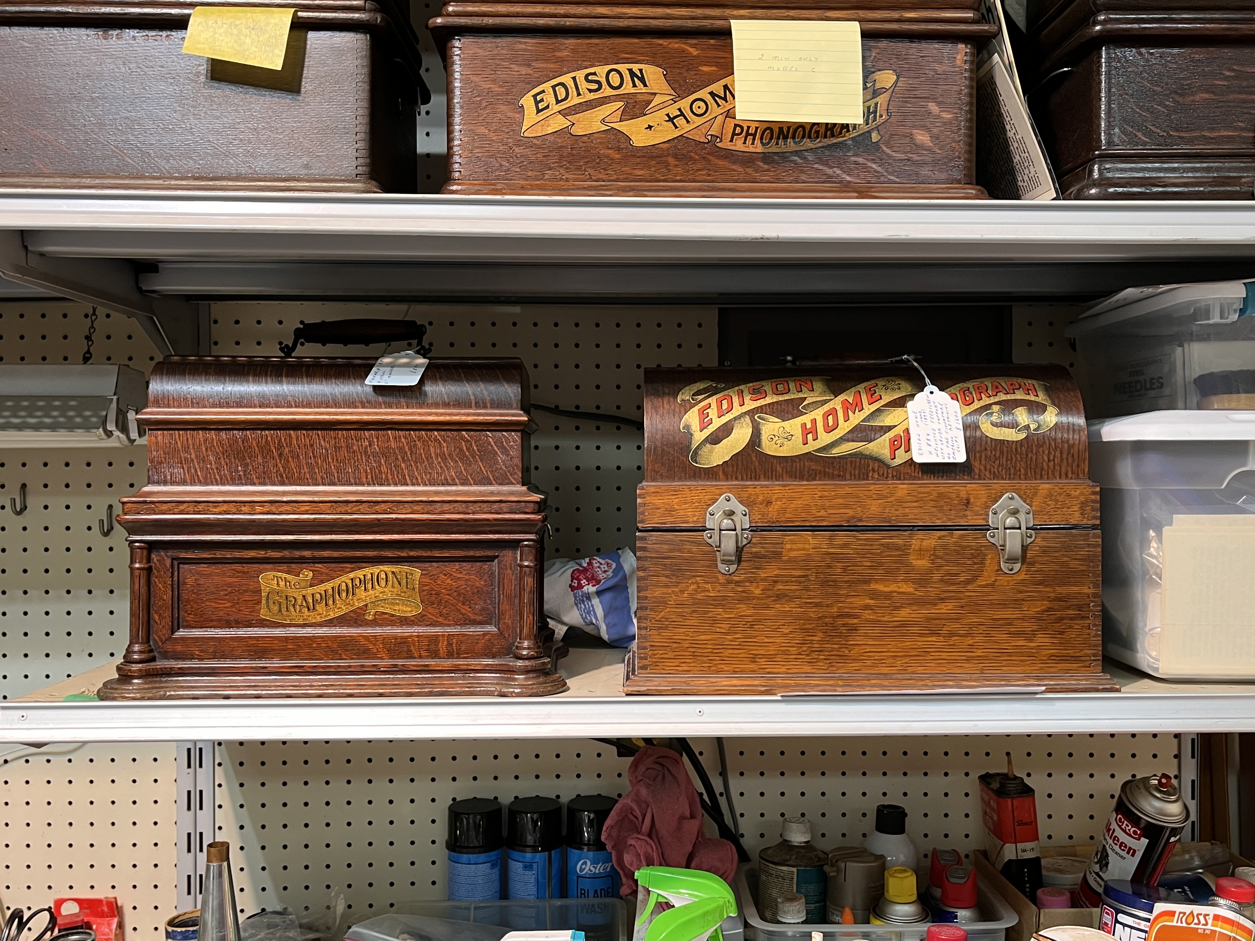 Some of these are quite rare. There is a very early Home sn. 884 with carriage rest and weighted feedscrew, an Edison Ajax, a treadle Columbia shaver, a Columbia AB McDonald, an Edison Concert with both concert and standard mandrels, carriages and reproducers, an excellent Victor VI, a bow front cylinder cabinet, and others.