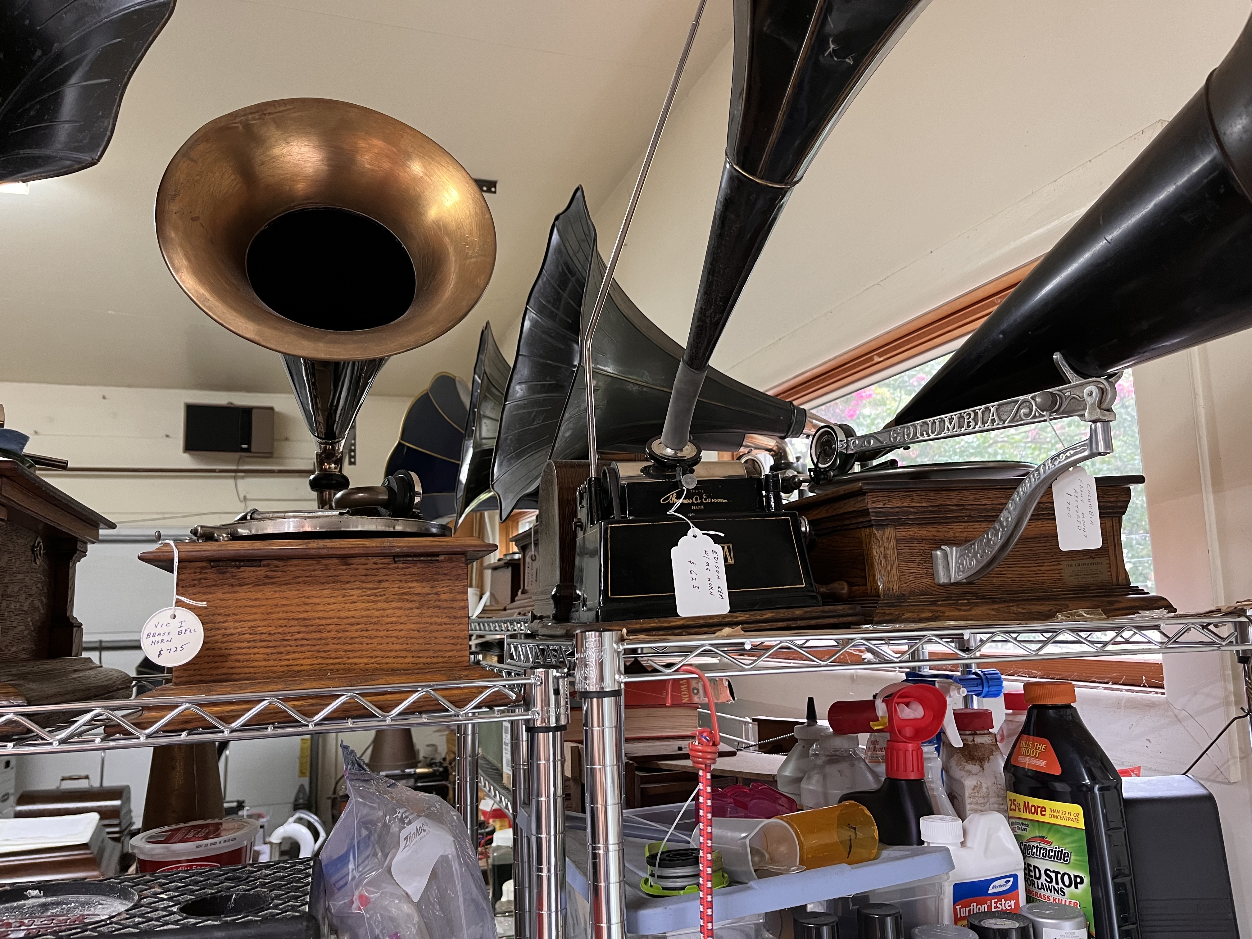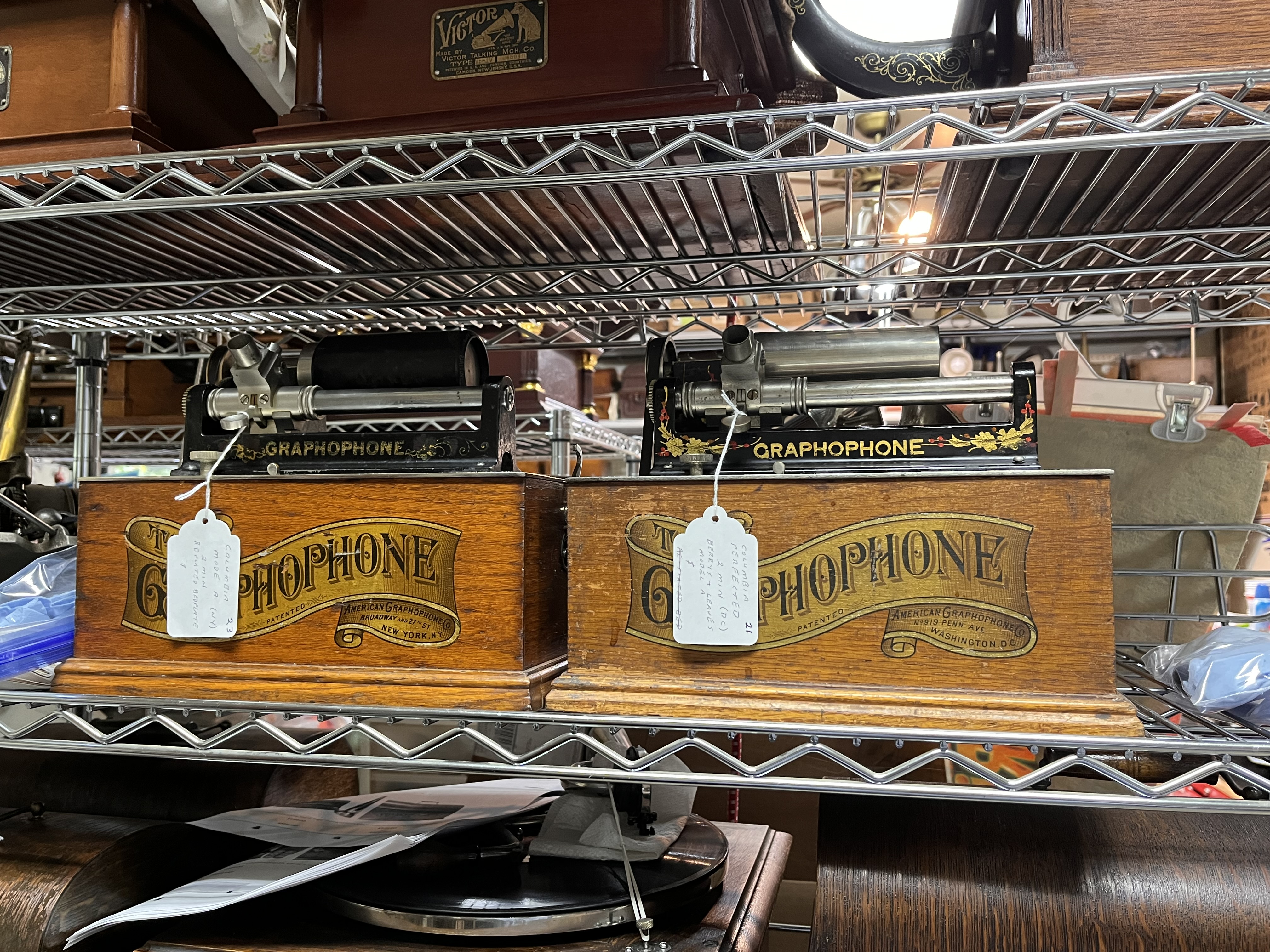 Some of these are quite rare. There is a very early Home sn. 884 with carriage rest and weighted feedscrew, an Edison Ajax, a treadle Columbia shaver, a Columbia AB McDonald, an Edison Concert with both concert and standard mandrels, carriages and reproducers, an excellent Victor VI, a bow front cylinder cabinet, and others.