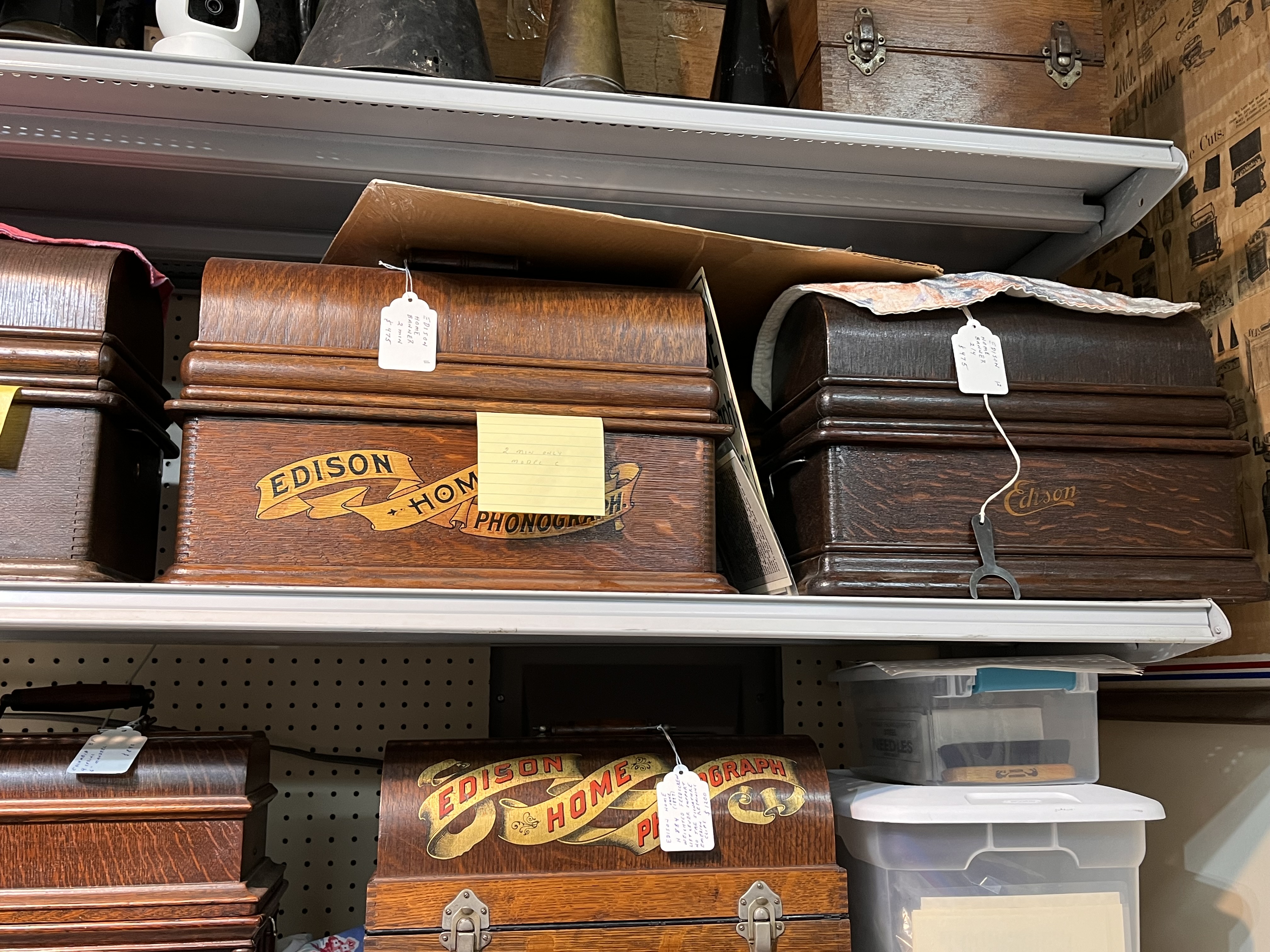 Some of these are quite rare. There is a very early Home sn. 884 with carriage rest and weighted feedscrew, an Edison Ajax, a treadle Columbia shaver, a Columbia AB McDonald, an Edison Concert with both concert and standard mandrels, carriages and reproducers, an excellent Victor VI, a bow front cylinder cabinet, and others.
