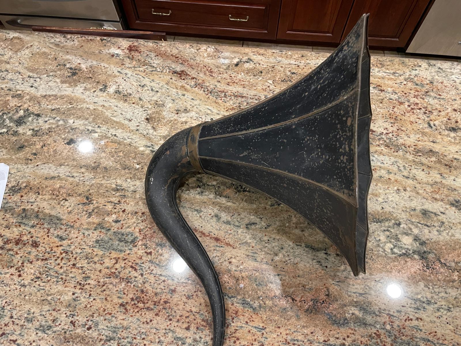 The question of horn is complex. Do you want a straight black & brass or all brass horn? If so, don't exceed about 30 inches in length. Do you want a flower horn similar to that shown in the picture above? If so, you'll need a relatively small one, since the typical 31-inch flower horn will tip over your machine. 26 inches or less will be required for a flower horn. You might want to consider one of the laminated paper horns such as the "Mega" or "Linenoid" horns. They're lightweight and often interesting in design and/or color. The downside of laminated paper horns is condition. Don't buy one sight unseen unless you know and trust the seller. In any event, shipping horns is expensive, so attending a show would give you an opportunity to check out the types and sizes available - and you could take it home with you.