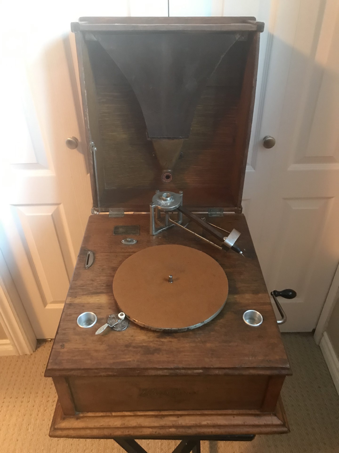 This is a complete machine. An early version with the plunger style brake. The turntable felt has been replaced and the record hold down is a reproduction. Crank appears to be original. Has an all black horn and anodized bracket. Horn has some bumps and bruises as seen in the pictures but overall not bad. Case is in good condition with the odd scratch. Has the early bevel drive 2 spring motor. The motor is strong and will play thru a record with plenty to spare. I don't have any old 7" records to get a good sound on it and bigger 10" records rub on the brake and speed control. I did play a 7" little wonder record on it and it played fine with no issues. The motor has the typical governor sound from these older motors otherwise all else is good. Long throat reproducer appears good with the rubber gasket still soft. Brake and speed control work fine. Overall a nice early machine for your collection.
