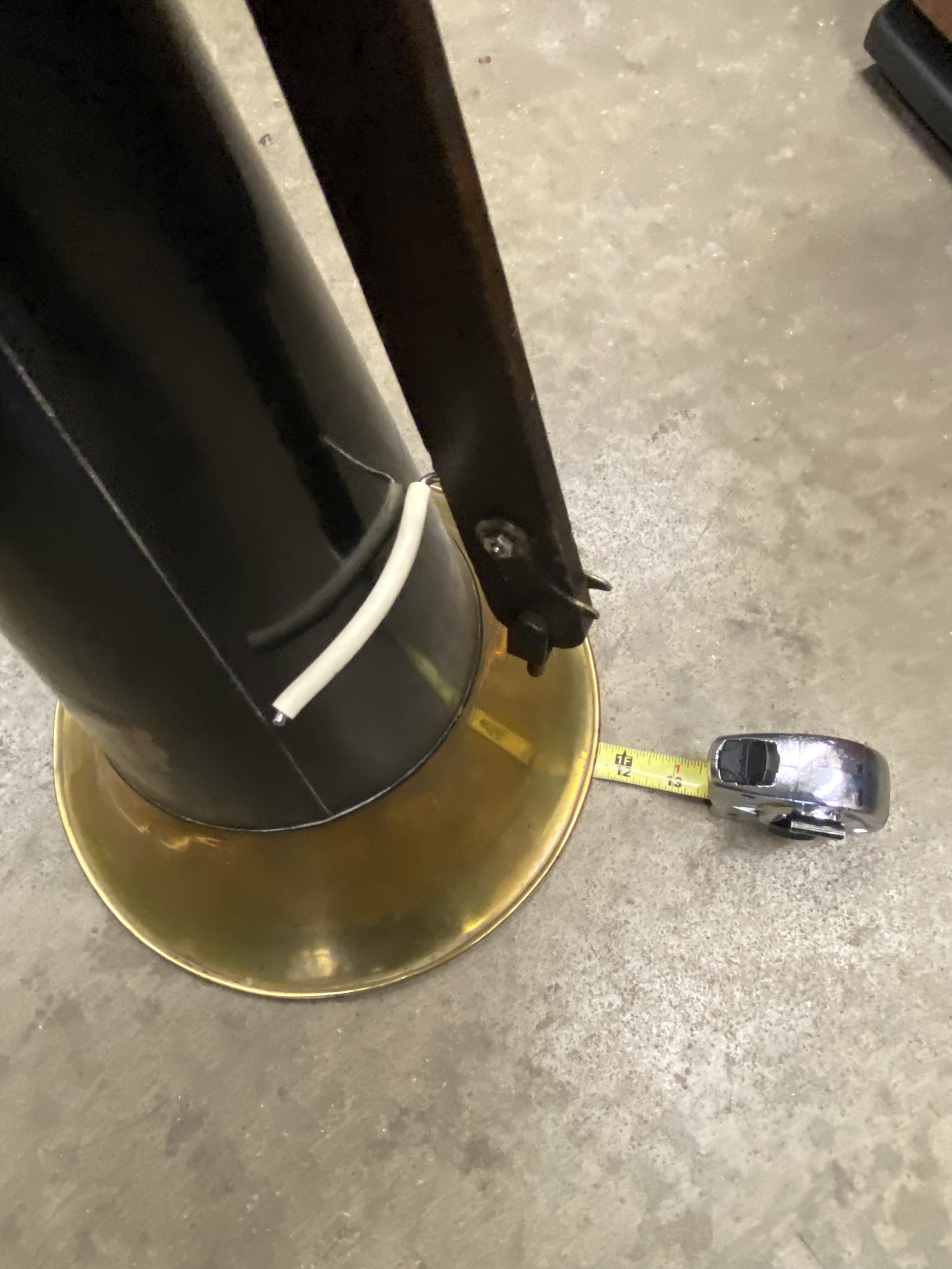 I have a horn with the same measurements as Darren's-- 11.5" bell-- 18.5 long with measuring tape though the small end to table below.. Threaded for elbow. It was painted over (flat black) at some point in it's life, so I can't determine decal location-- It's been in a stack of extra horns for awhile.