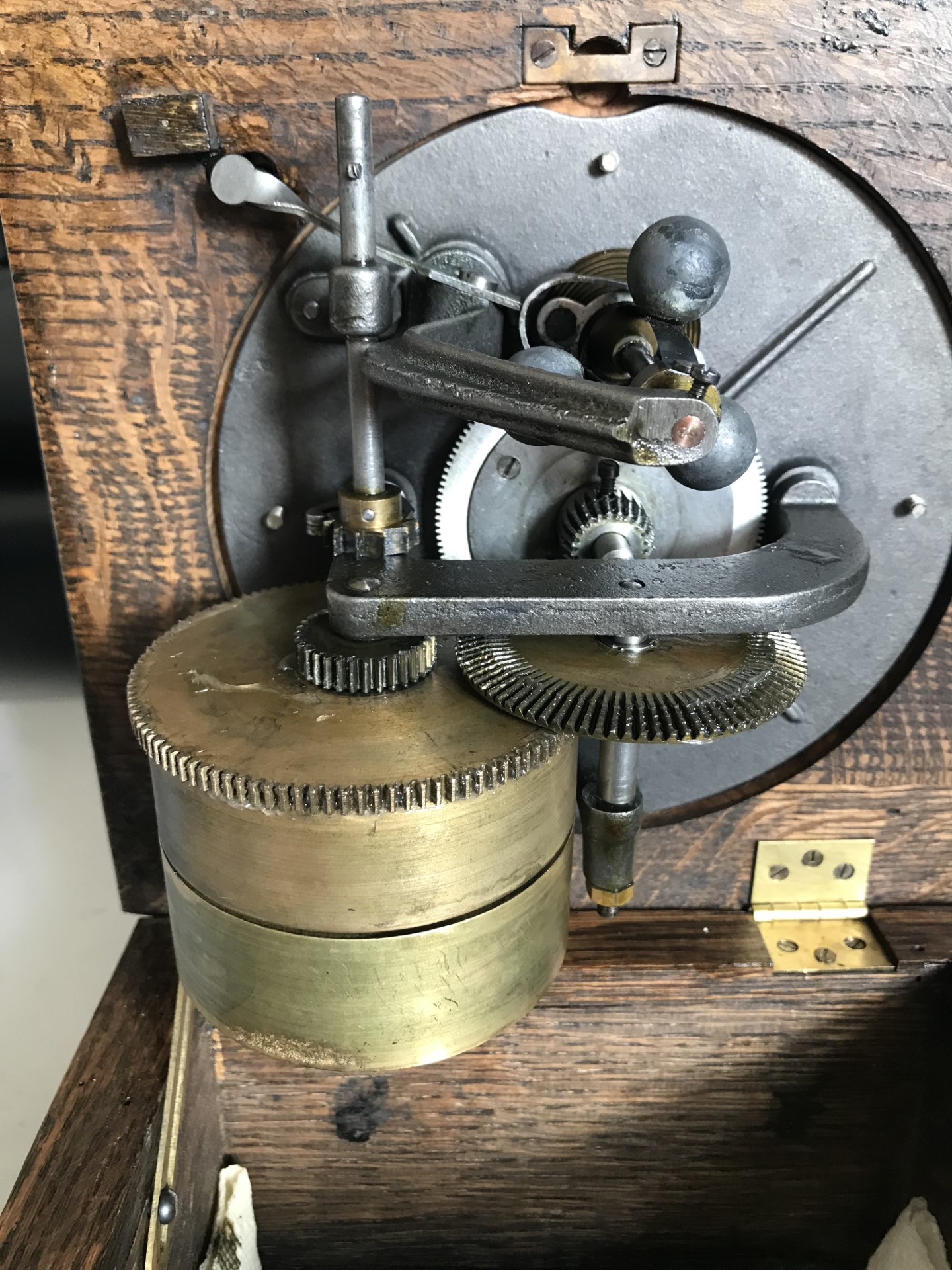 This is a complete machine. An early version with the plunger style brake. The turntable felt has been replaced and the record hold down is a reproduction. Crank appears to be original. Has an all black horn and anodized bracket. Horn has some bumps and bruises as seen in the pictures but overall not bad. Case is in good condition with the odd scratch. Has the early bevel drive 2 spring motor. The motor is strong and will play thru a record with plenty to spare. I don't have any old 7" records to get a good sound on it and bigger 10" records rub on the brake and speed control. I did play a 7" little wonder record on it and it played fine with no issues and sounded good. The motor has the typical small governor sound from these older motors otherwise all else is good. Long throat reproducer appears good with the rubber gasket still soft. Brake and speed control work fine. Overall a nice early machine for your collection.