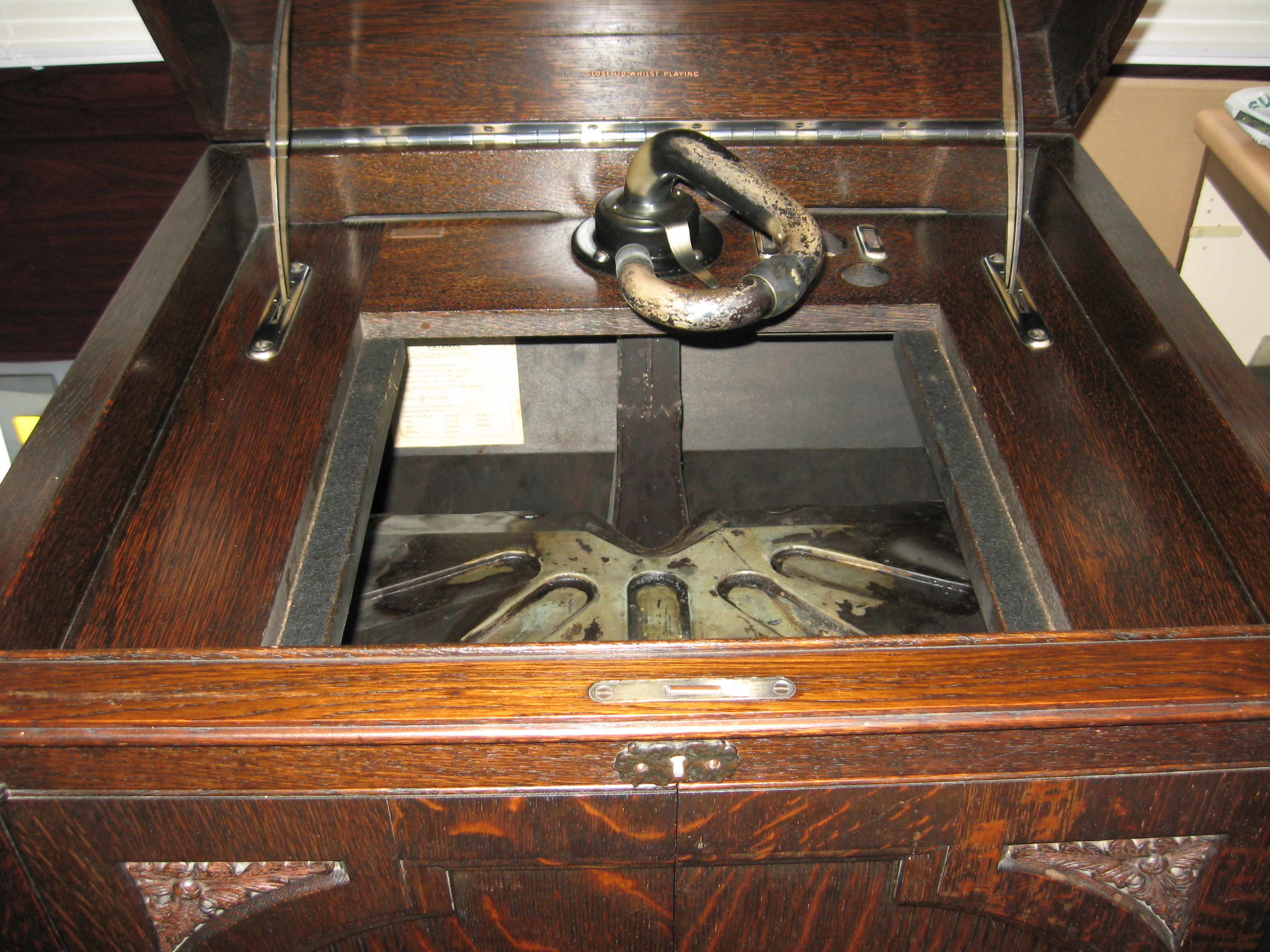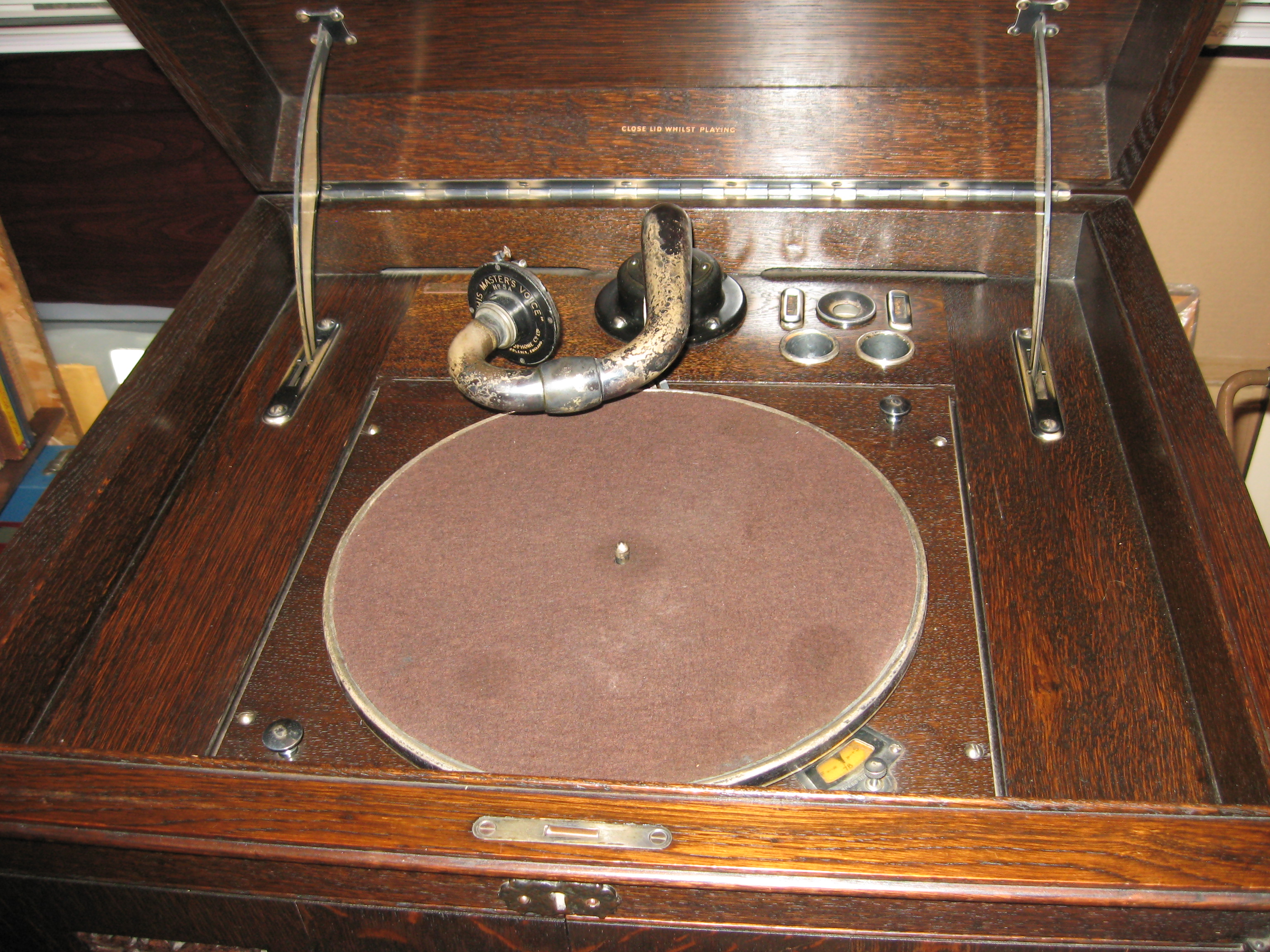 Bearing Serial Number 604 and a brass dealer's plaque for Hickie & Hickie of Reading, it has two lid stays and the No.34 quadruple spring motor. My guess is that it dates to 1928, as anything later would probably have the oil bath motor.