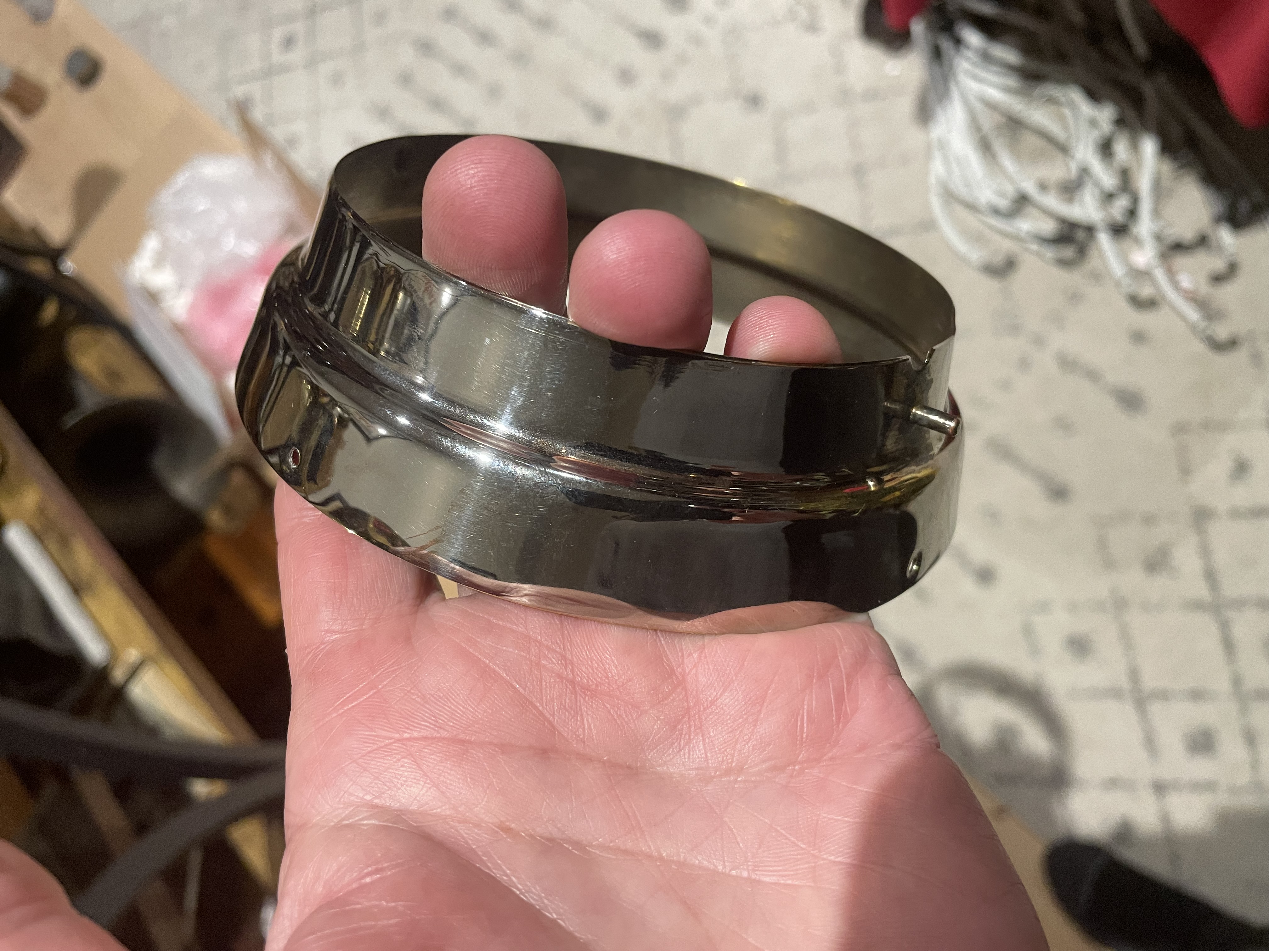 For Sale: Reproduction music master horn collar made by Eduardo in Peru. Nickel. Can include 4 good screws but will need the tips slightly ground to not penetrate the horn. $75 plus shipping.