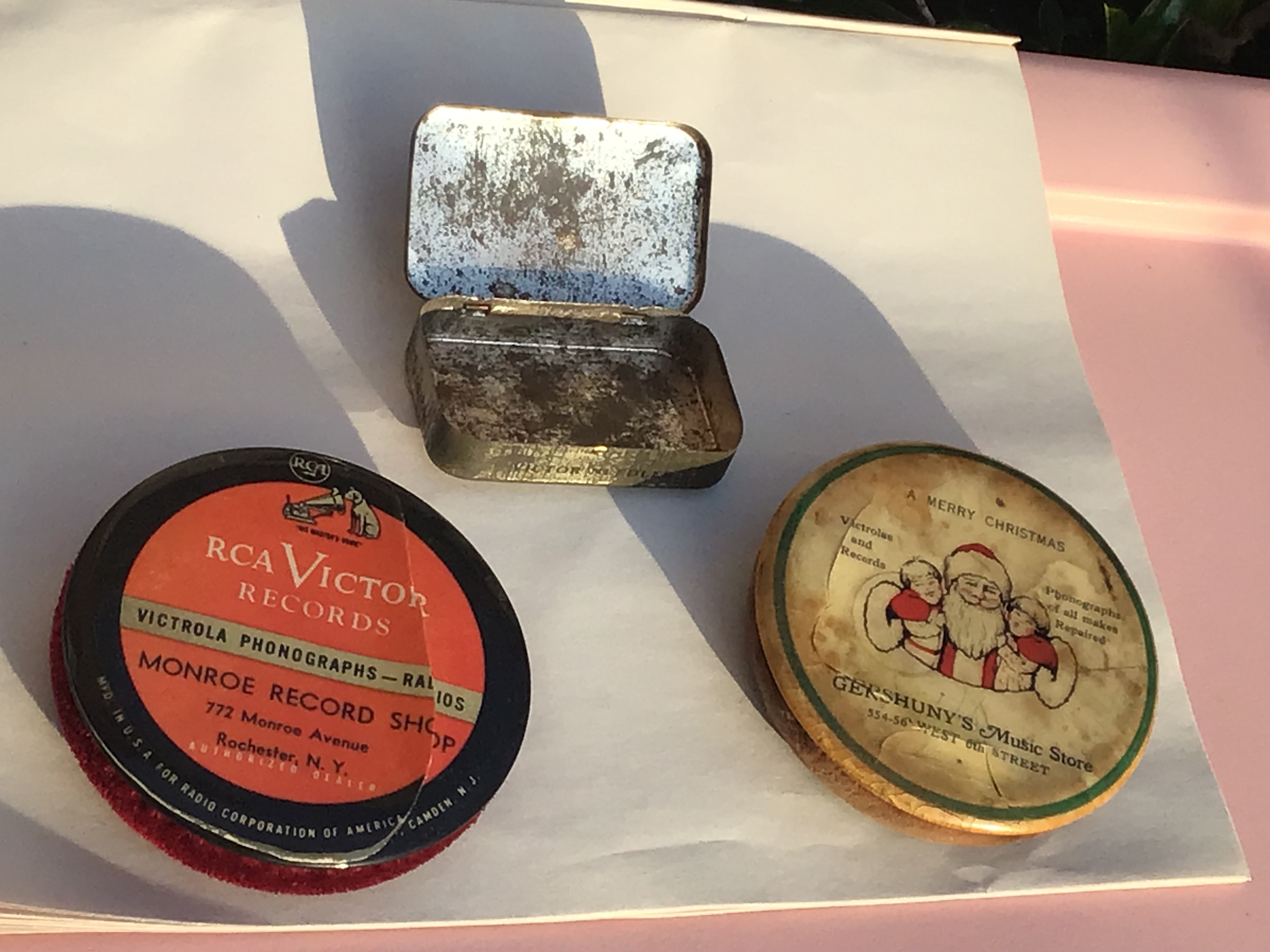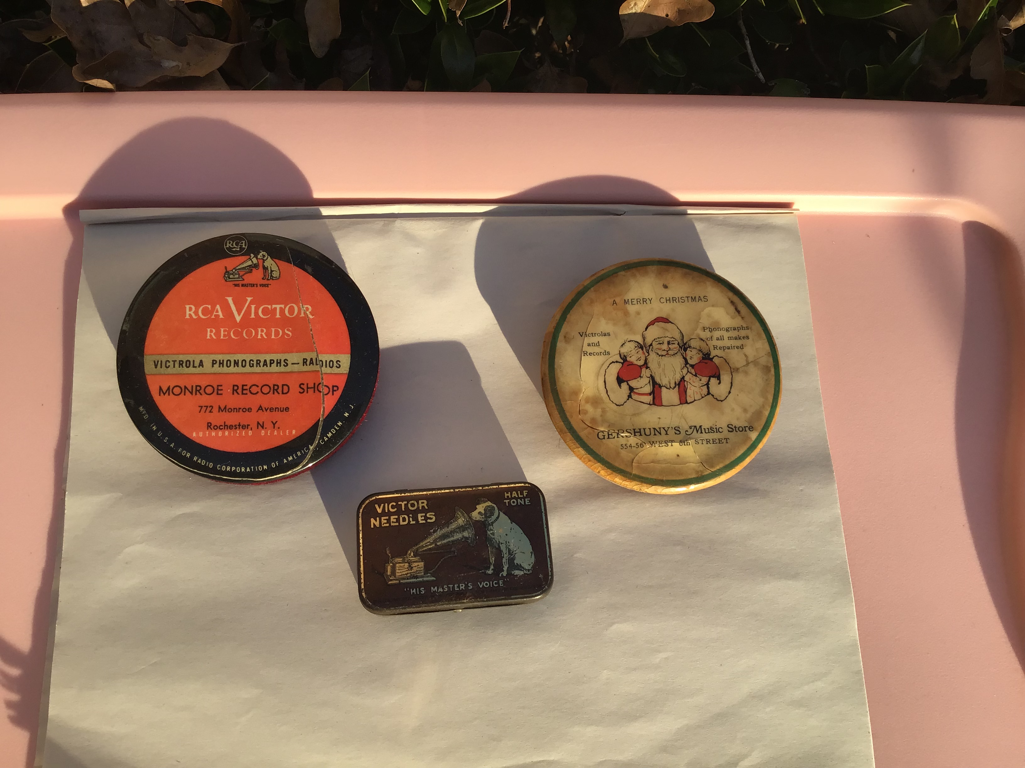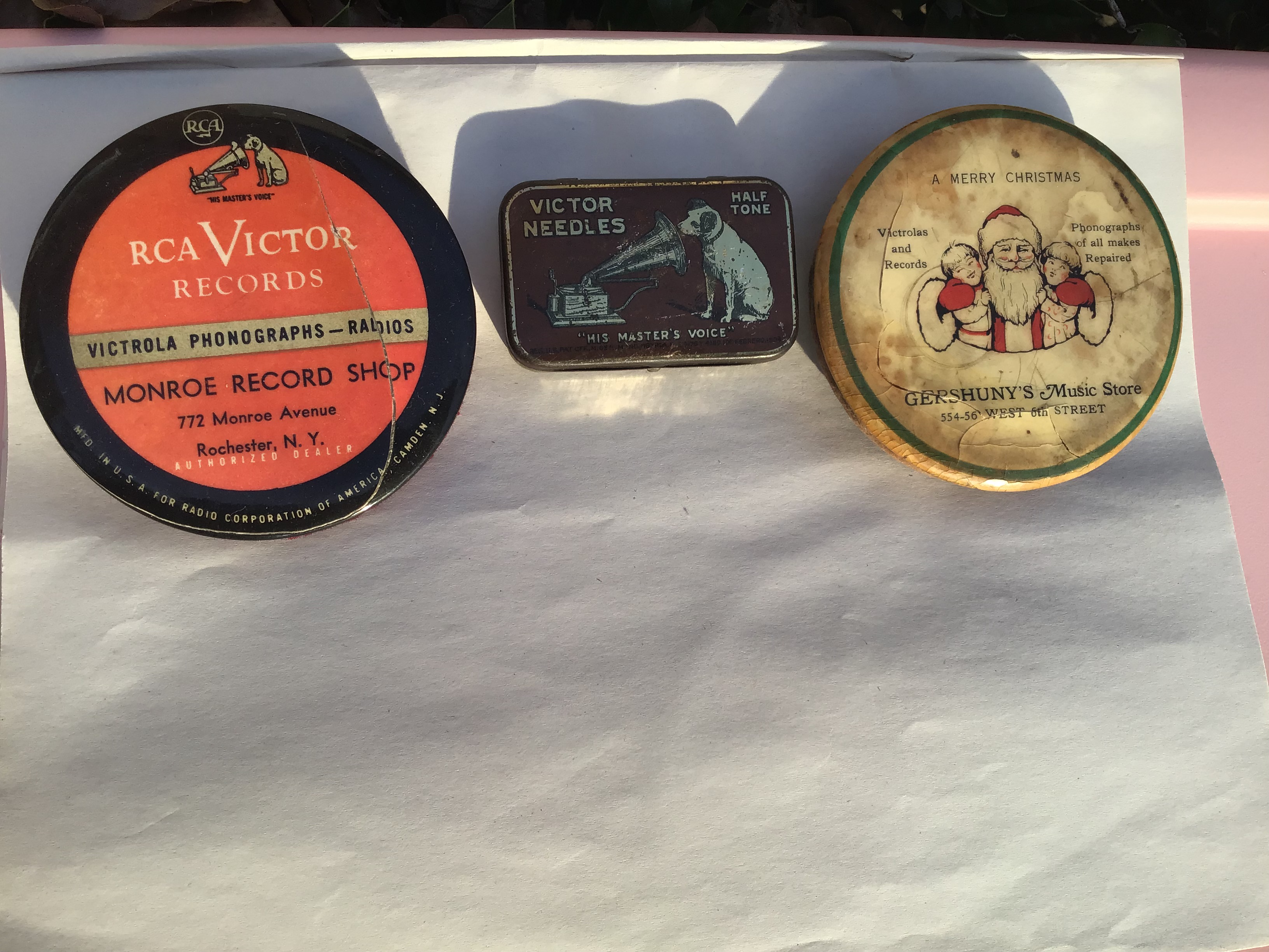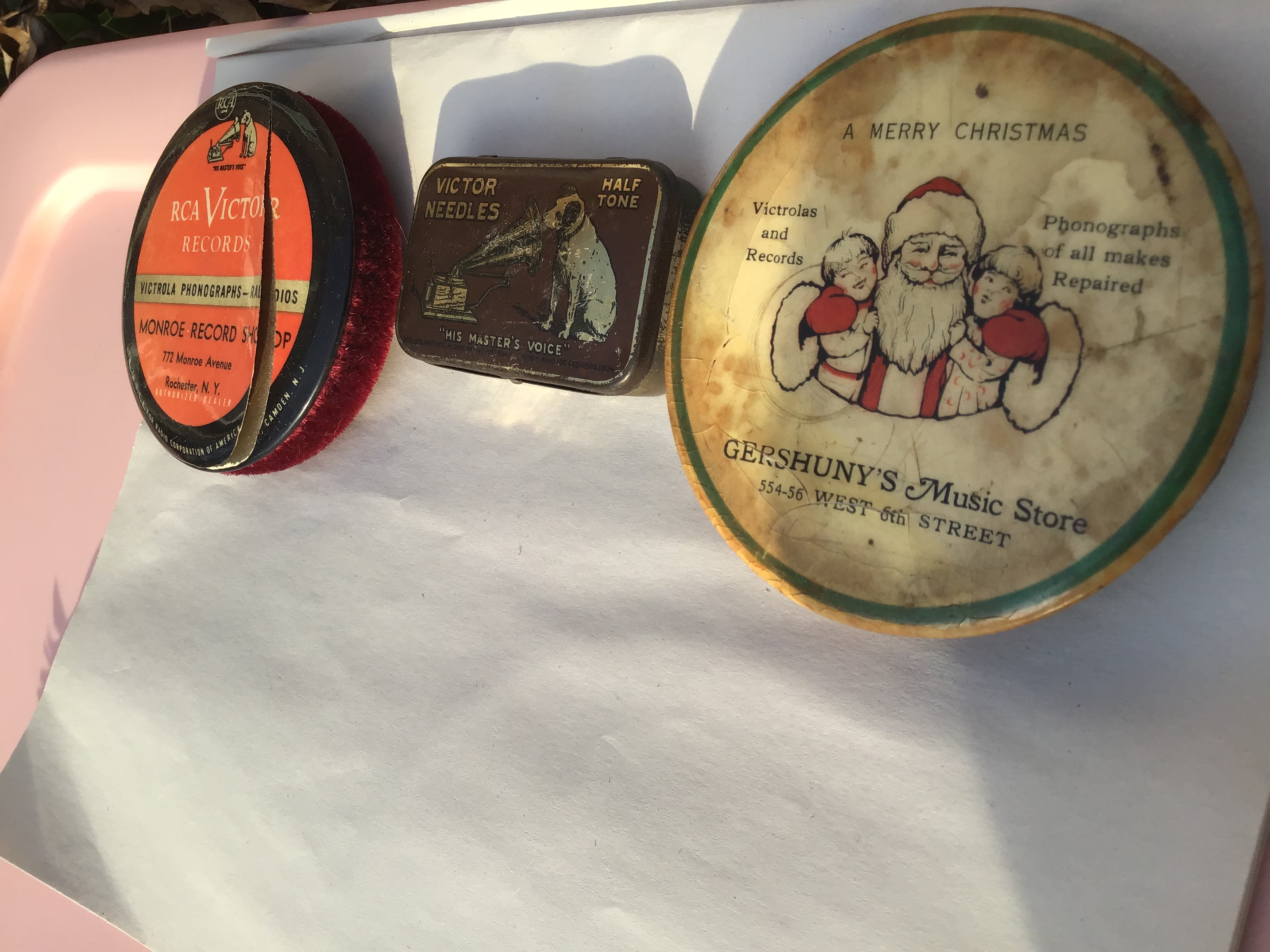 I have for sale a Christmas record duster (it does have cracks in the plastic cover that need to be glued). I also have a RCA Victor Records duster that has a crack in the plastic shell as well. Third is a Victor Half Tone needle tin that is brown in color and came with 375 needles when new.