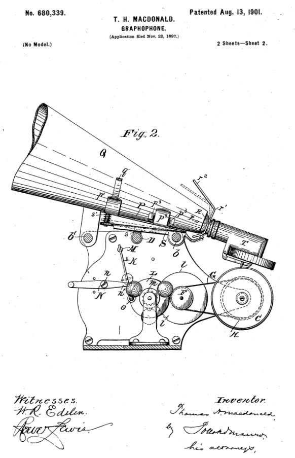 November 22, 1897: Thomas Macdonald filed for a U.S. patent for a “Graphophone.” This would become the extraordinarily successful Type Q, which was probably the best-selling cylinder talking machine in the world.