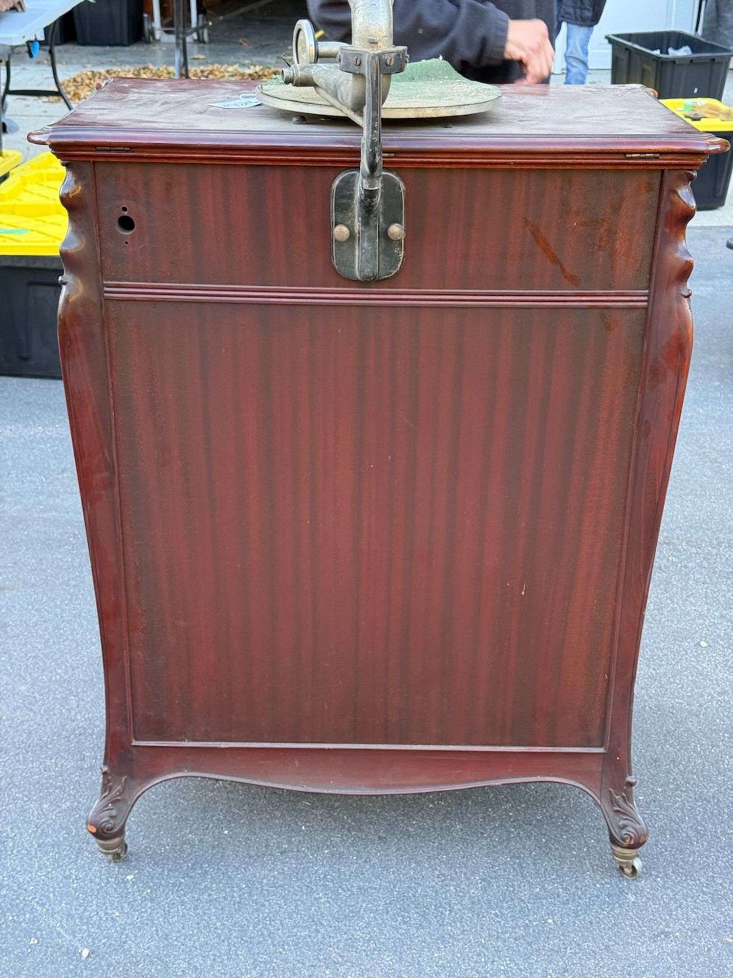 I was fortunate enough to bring home this Victor Auxetophone from the recent Stanton auction. I was a bucket list machine for me. It is mostly complete. It is missing the second U-tube for the reproducer and the front door pull. The original motor and air pump are there but seized up. I am hoping to keep it all original. It even came with the original owner's manual. I have the correct reproducer and very large brass bell Victor horn for it. The case looks like it will clean up very nicely.