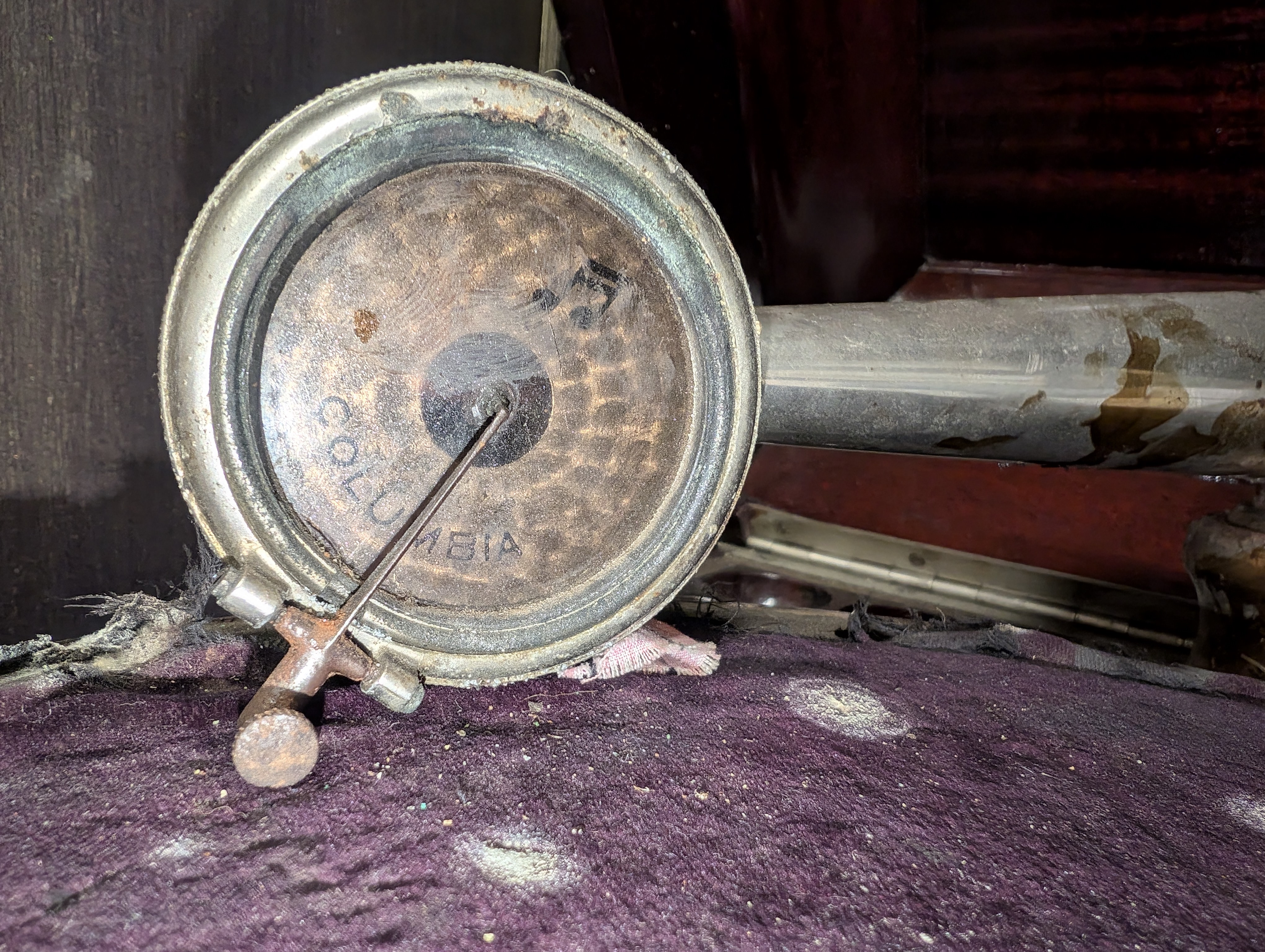 I came across this little upright a couple of weeks ago and don't know much about it, but I'm really intrigued by it. (I loaned out my copy of Baumbach's Columbia book a while ago and haven't seen it since.) I had heard of the Nonpareil but have never seen another one in person, and I'm looking for any information I can get about it, starting with when it would have been made and where it fit into Columbia's lineup at the time. I assume it's an early inside horn machine for them, as it has doors instead of louvers (a violation of Victor's patents?), but I don't know how early, what it sold for originally, its dimensions according to the catalog, how large the motor is, etc. Of particular concern right now is the reproducer -- it looks like it may be later than what the machine would have come with, originally -- and the tone arm, which only pivots a few degrees at present. (Pot metal? I don't know.) The turntable felt appears to be purple velvet, in which case I don't know how I would replace it. Would it have had a needle cup in the flat-bottomed (upper right) hole? And the crank is missing -- does anyone know what its specs should be? Any and all information would be most welcome and appreciated. Thanks!