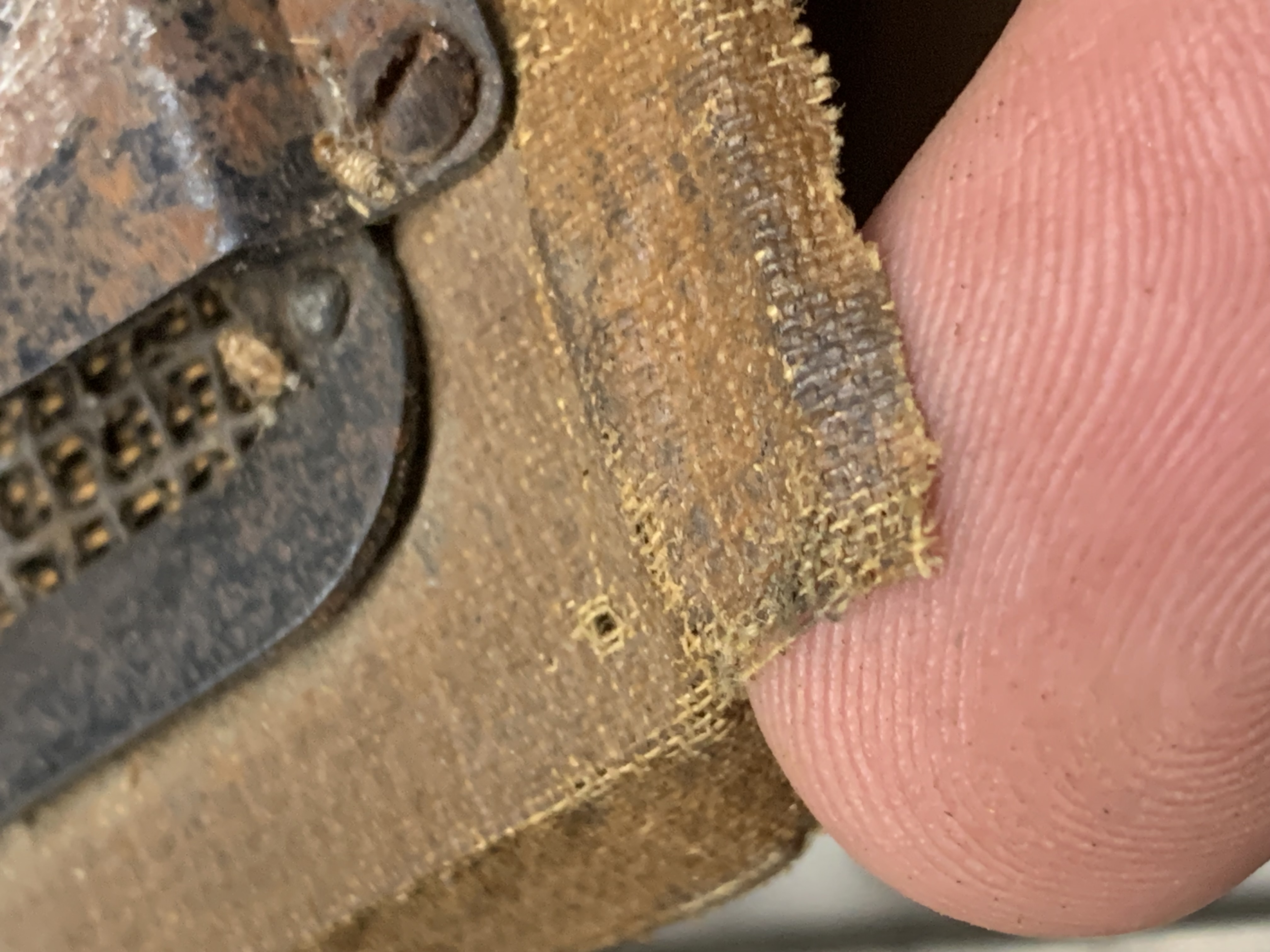 Often hide glue was used for attaching fabric. Hide glue is a hot glue. It needs to be heated to use it. This means that things held together with hide glue can be disassembled using heat. And if you are lucky, things can sometimes be reattached by using heat. I have had some minor success in removing bubbles from and reattaching Rexine by using a terry towel and a hot dry clothes iron. I have also had some minor success in reattaching platter mats using the same process.