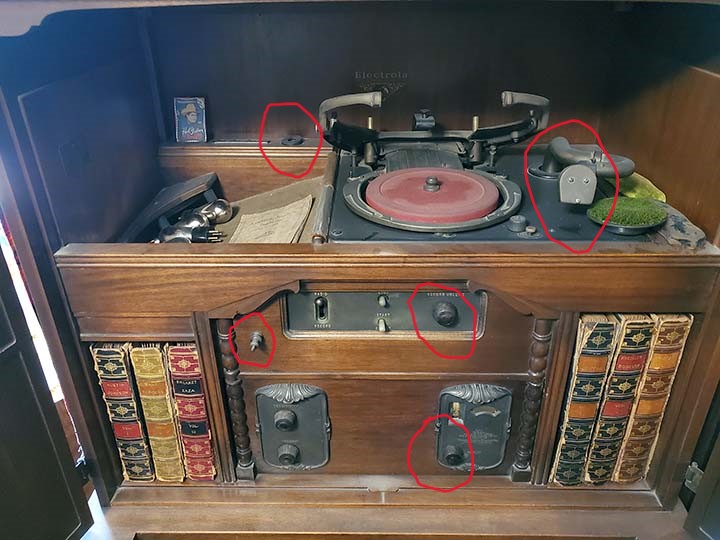 I recently picked up a Victor 9-54 and the Electric Horseshoe Pickup, Light Switch Embellishment Mount and Needle Cup were removed, stolen actually. Also, I need to replace a couple of the Radiola Knobs. The Needle Cup and knobs should be somewhat easy to find.