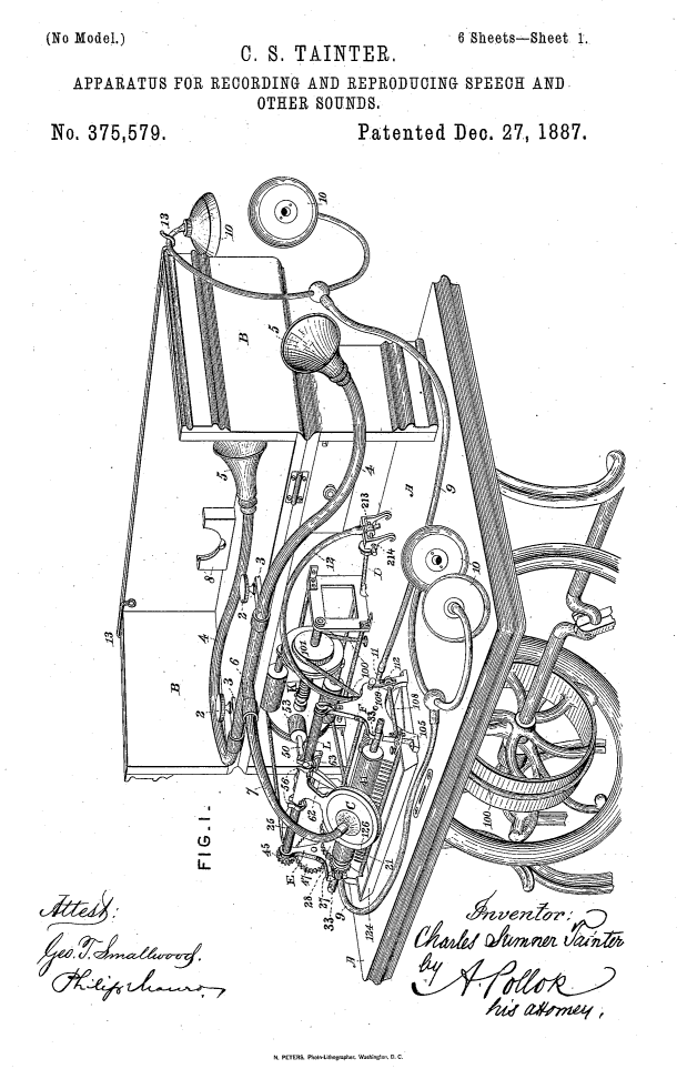 December 27, 1887: Charles Sumner Tainter was granted a U.S. patent (No.375,579) for “Apparatus for Recording and Reproducing Speech and Other Sounds.” The treadle-powered machines illustrated would be short-lived, but the upper works design would persist on Graphophones through the mid-1890s. For more: https://forum.antiquephono.org/topic/62 ... mment-2999