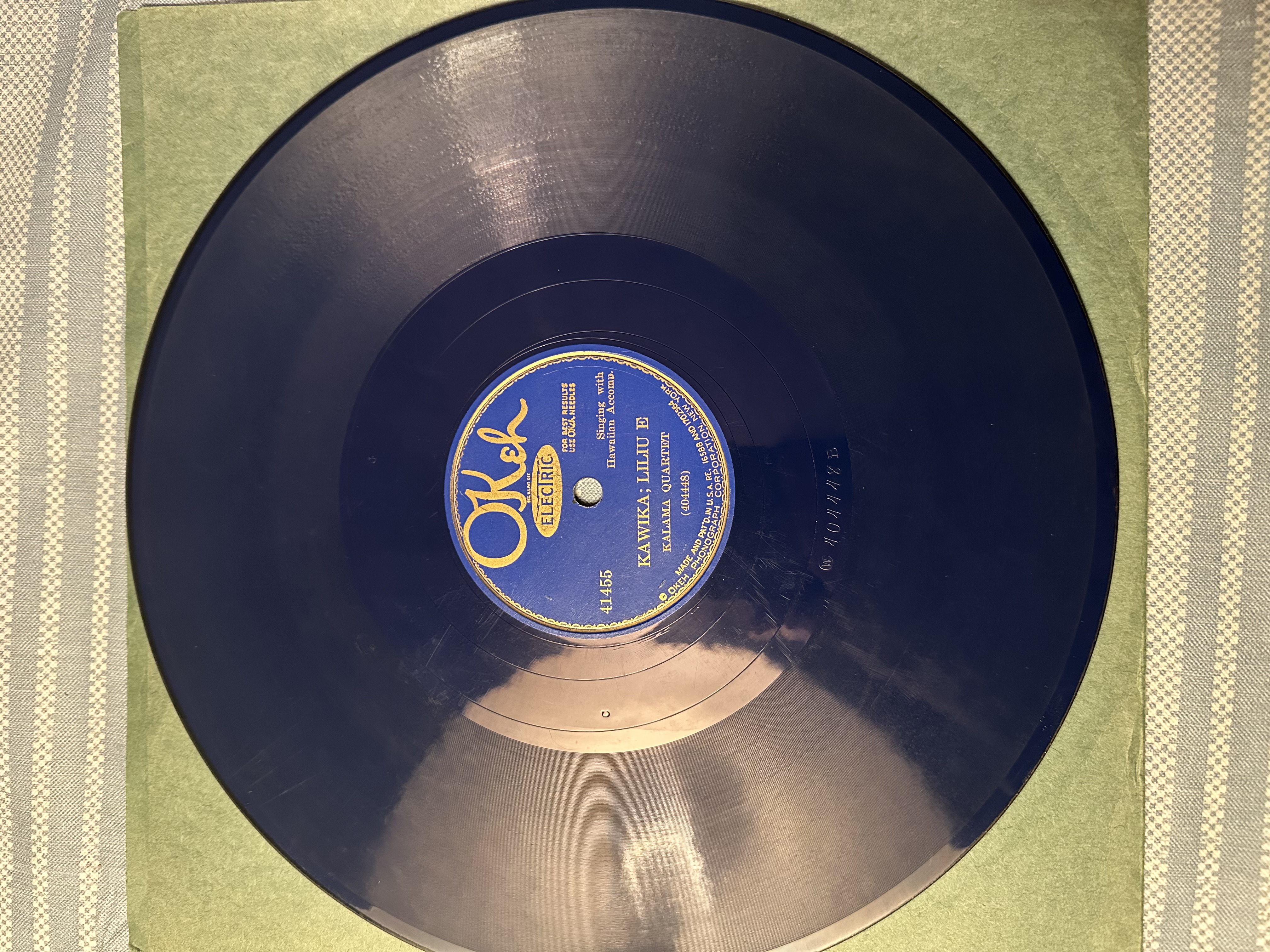 2. OKeh Electric Blue Label/ BLUE SHELLAC 41155. "Kawika- Liliu E" / "Lei Loke O Kawika". Hawaiian music. I have never, ever seen a ROYAL BLUE OKeh like this. If it was anything I would listen to, I'd keep it. Still likely a desirable oddity. Visual E- to V+ with sort of a "rumbly" looking surface and small lam cracks that to not affect play on my 331 Duo. A ROYAL BLUE blue label OKeh? What's it worth? $50? SOLD!
