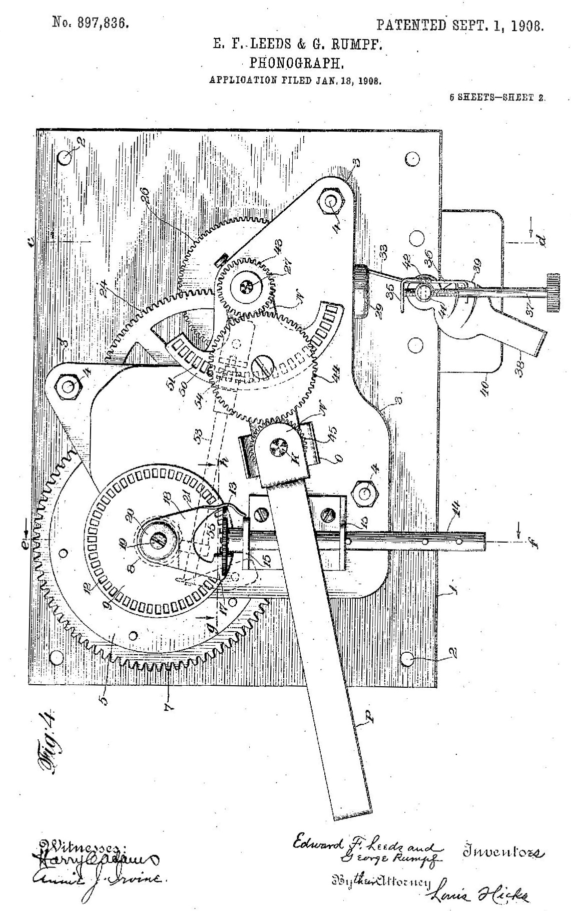 January 18, 1908: Edward F. Leeds and George Rumpf filed a U.S. Patent application (later granted as #897,836) for a disc talking machine whose sound box remained stationary while the turntable traversed beneath it. Designed to avoid infringement of Berliner’s U.S. Patent that controlled any talking machine whose needle/stylus was propelled by a record’s groove, the machine was briefly marketed as an Aretino in 1908/09, and bears the distinction of being the first true mechanical feed disc talking machine known to have reached the marketplace. For much more: https://forum.antiquephono.org/topic/66 ... mment-3090