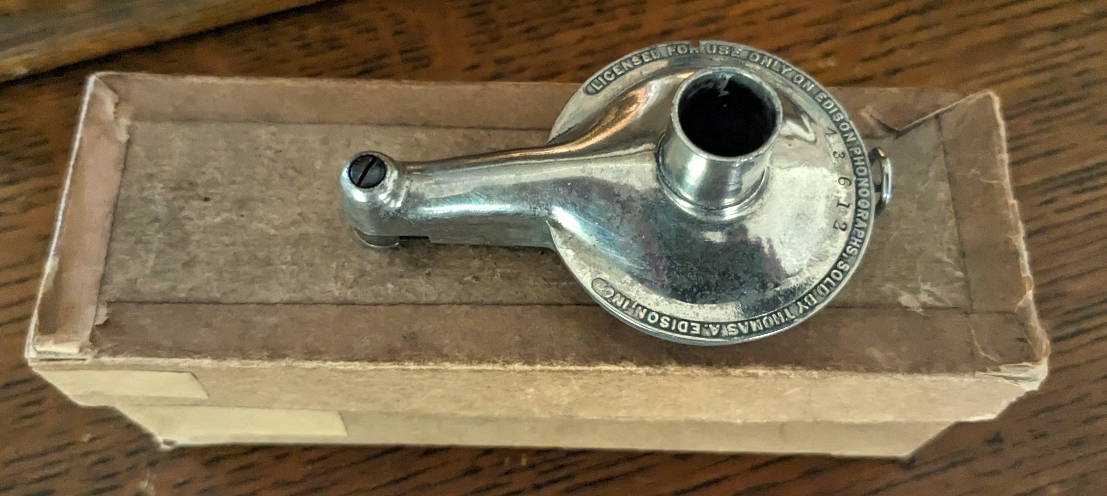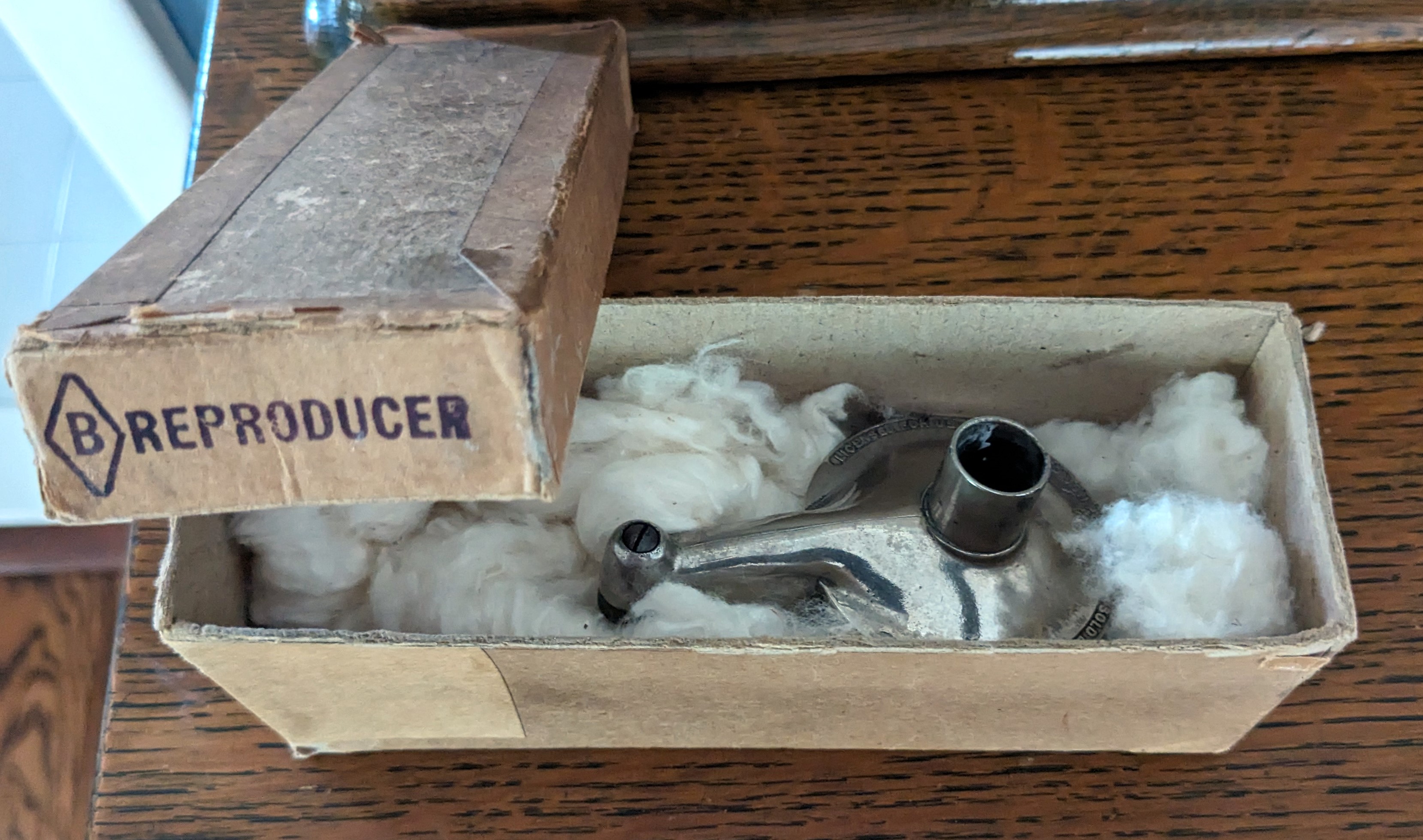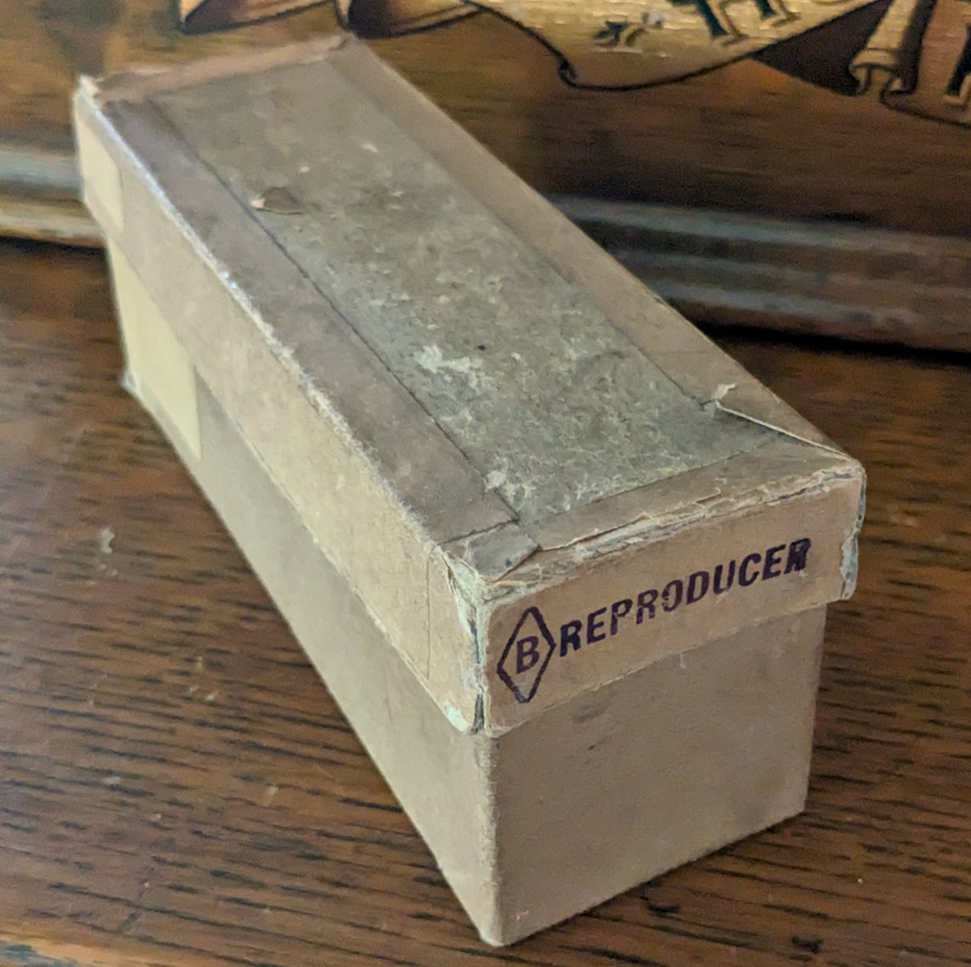 Wonderfully sounding Diamond B reproducer in a rarely found, original box. The box is actually the best part of this set, as its really hard to find. The Diamond B has a great diamond on the reproducer, plays really well. Solid nickel plating! This one is not pot metal. A wonderful set for the price of the reproducer alone!