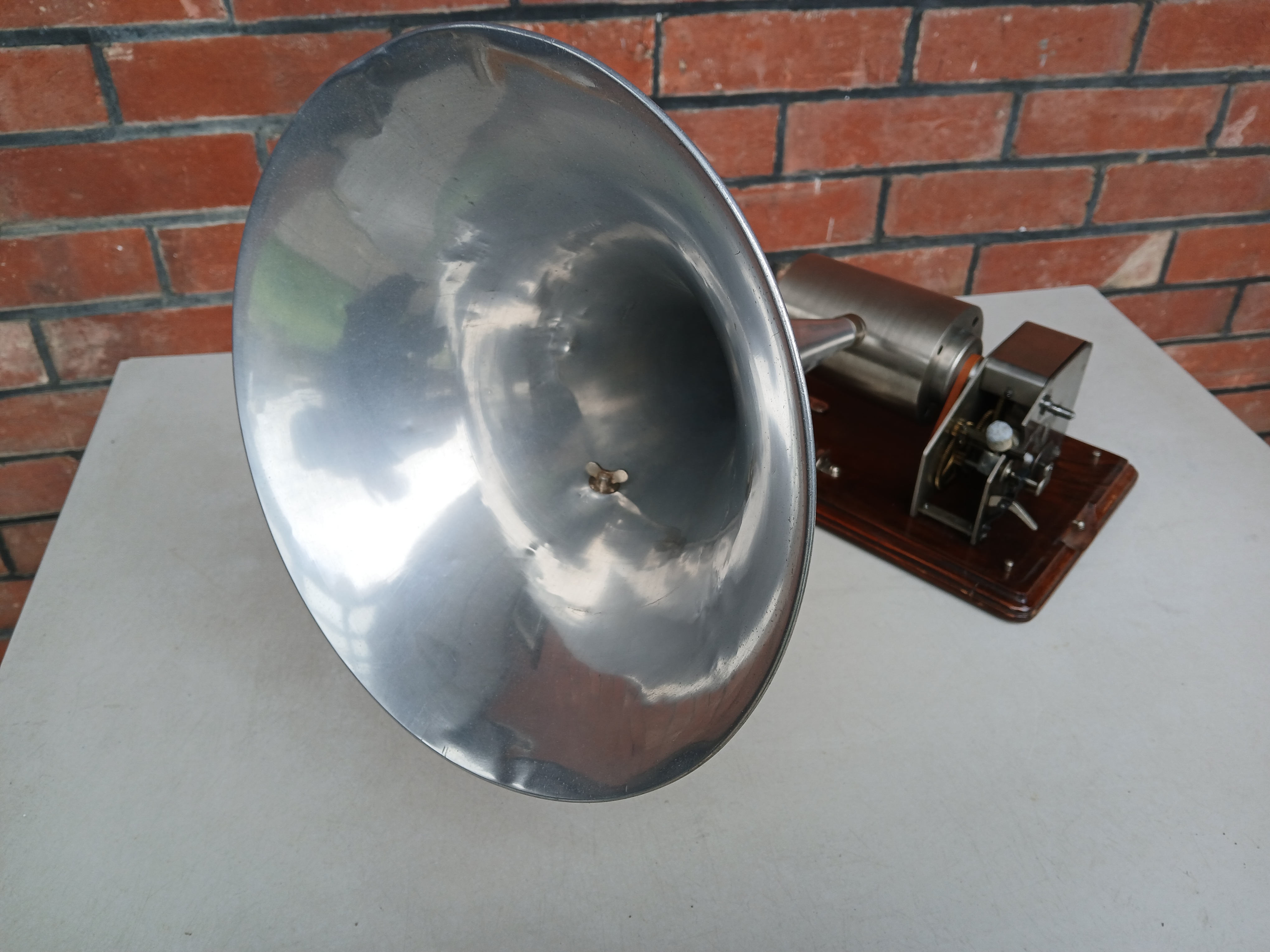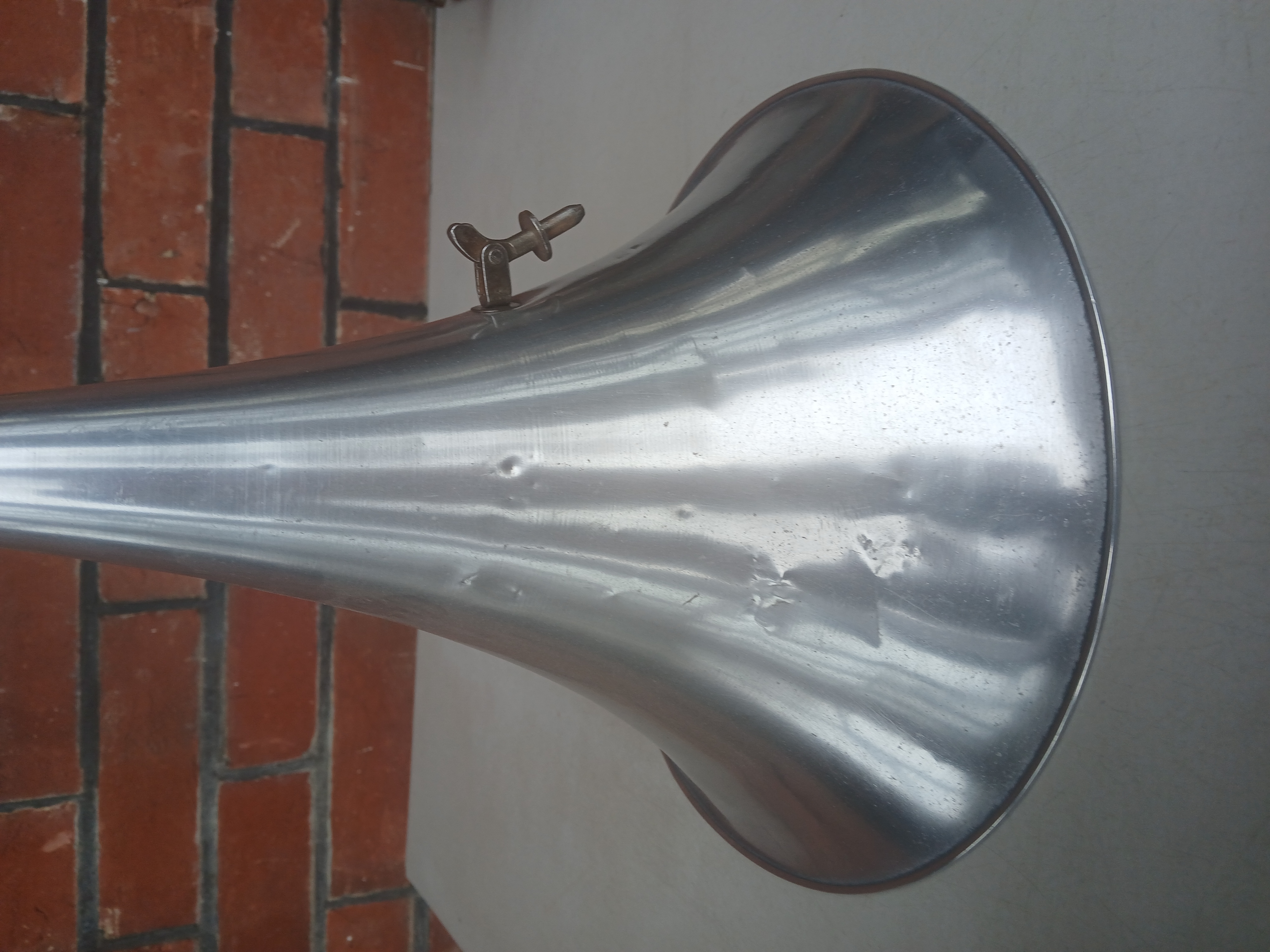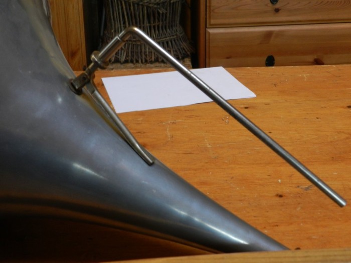 Hi, the horn measures approx. 12 inches long by 10 inches across the bell . The picture posted by drh pretty much shows the setup. You will notice a short "arm" on which the horn rests when not playing a record. My own example does not have that arm and relies solely on the horn fitting to support the horn which it seems to do ok , so maybe there were two patterns of the horn fitting --' my example does not look as if it has been altered in any way. Incidentally I may have a spare horn support rod --' bear with me. Regards Dulcetto