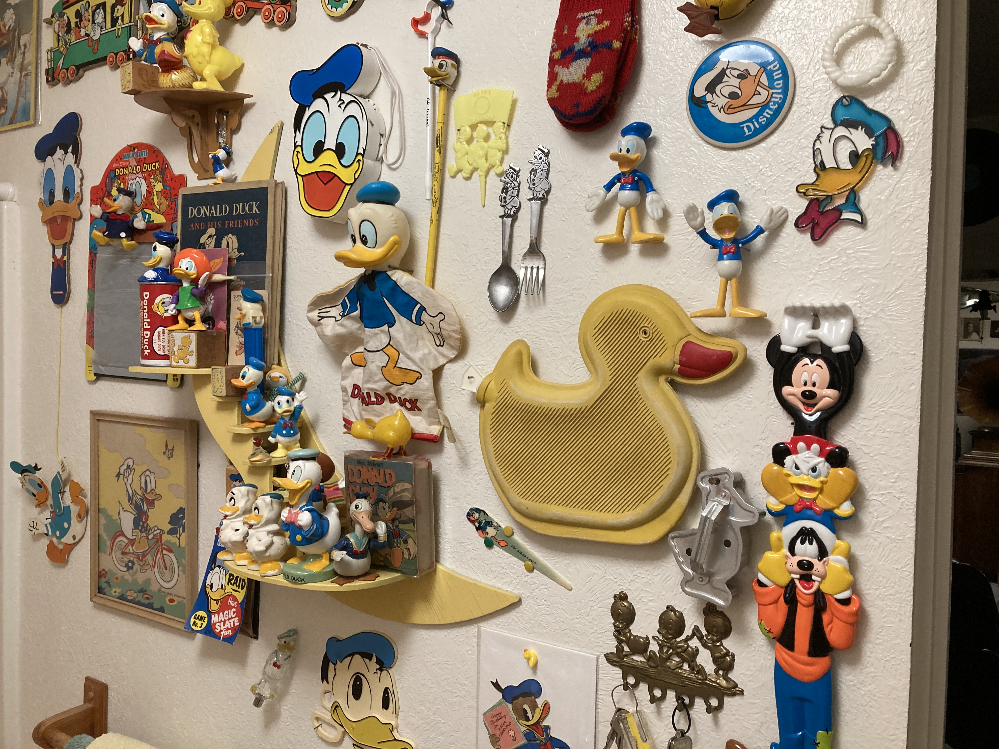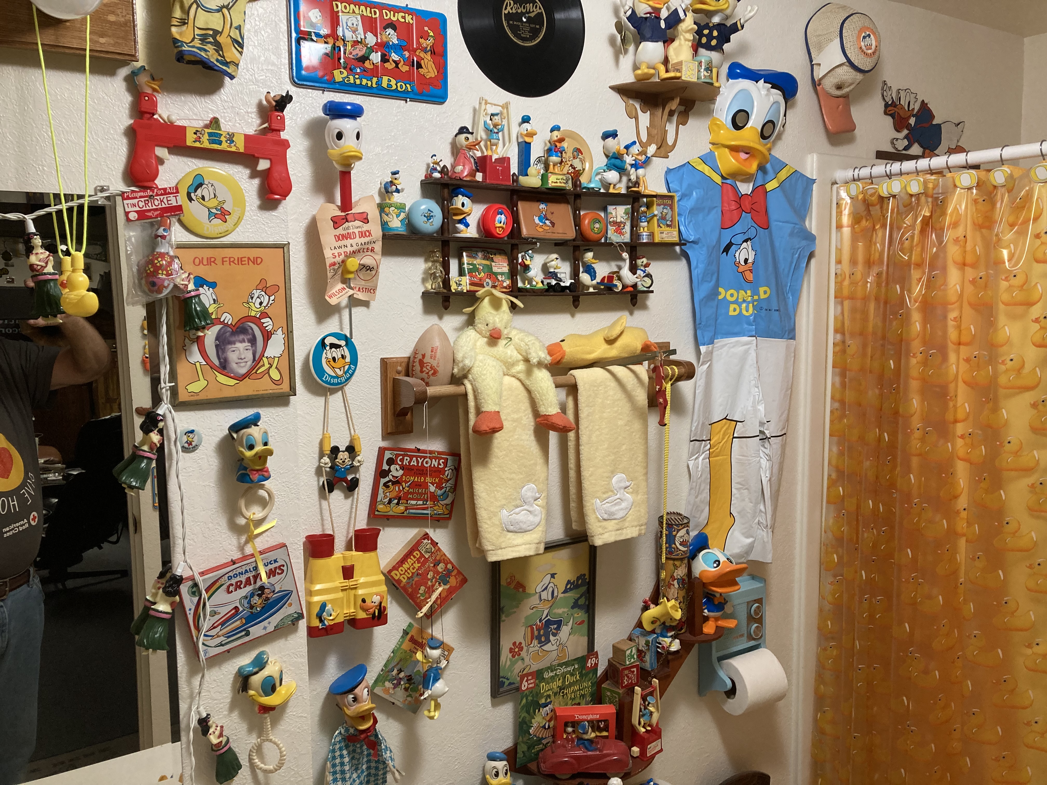No phonos in my basement bathroom but there's a plethora of Donald Duck items. You ask why? It's possible to spend all day hitting antique shops and not finding anything phono related. I'm an Oregon Duck fan and since the mid 50's the University of Oregon had a verbal agreement with Walt Disney to use Donald on athletic apparel, window decals, etc. I hate to go antiquing and getting skunked so I started my Donald Duck collection. With few exceptions it's a cheap collectable so I rarely skunked. :D I don't mean to take this thread off topic. When we return home I'll look around that bathroom. If I find something I submit a retraction. :shock: