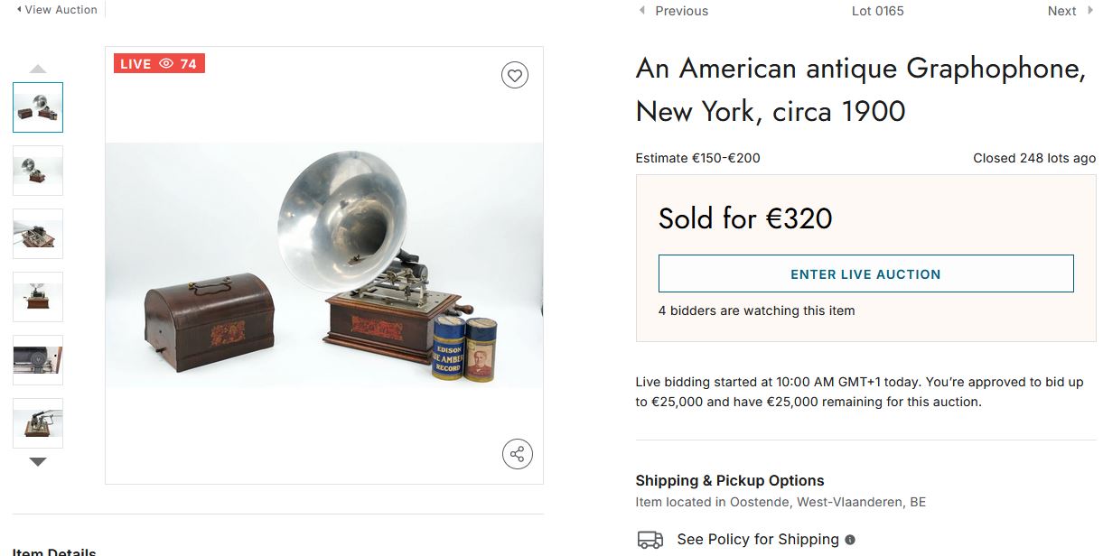 A lot of non original disc machines, many described as "HMV early 1900's". Strange that the only original HMV base achieved only a fraction of the crapophone. One would think that a person spending 1300 euro on a machine would do some due diligence. (commissions were 25 to 30%). Photo quality was also wanting. A few common cylinder phonographs were reasonably priced.