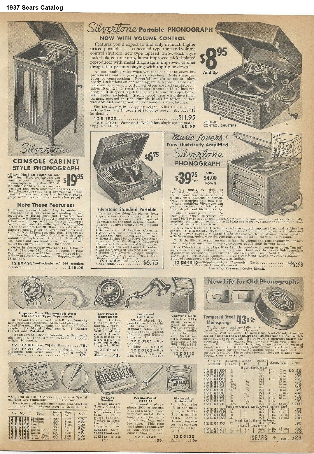 The "New Silvertone" phonograph featured is, based on what I have been able to find, the last cabinet model acoustic phonograph sold by Sears. (It does not appear in the 1938 catalog.)