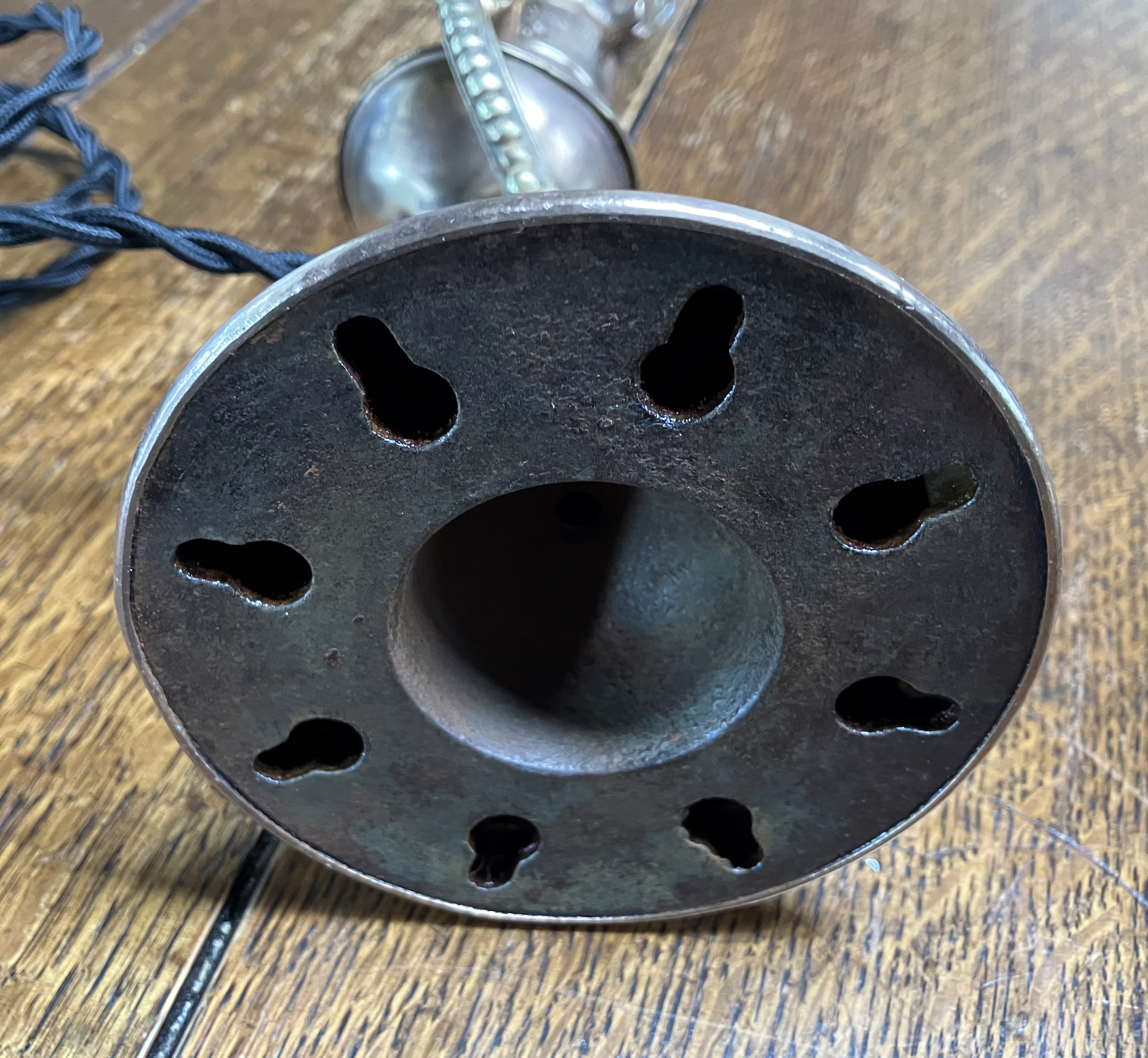 It is made of brass, but this example has a slightly coppery color which I have never encountered before. It makes it particularly attractive. The socket is original, and is stamped "EDISON'S PATENTS." The paddle is embossed "GECo," meaning General Electric Company (which started life as the Edison General Electric Company).