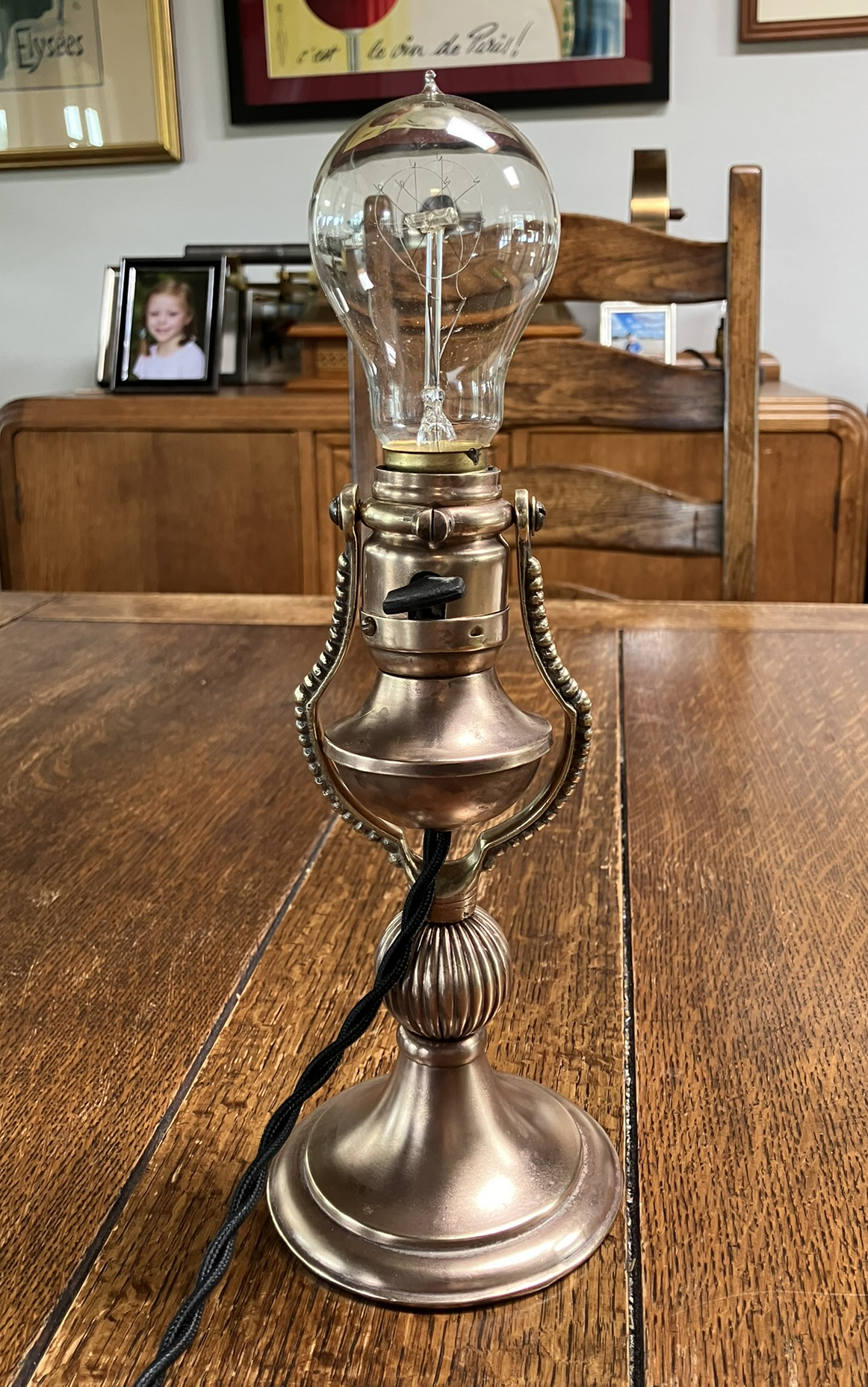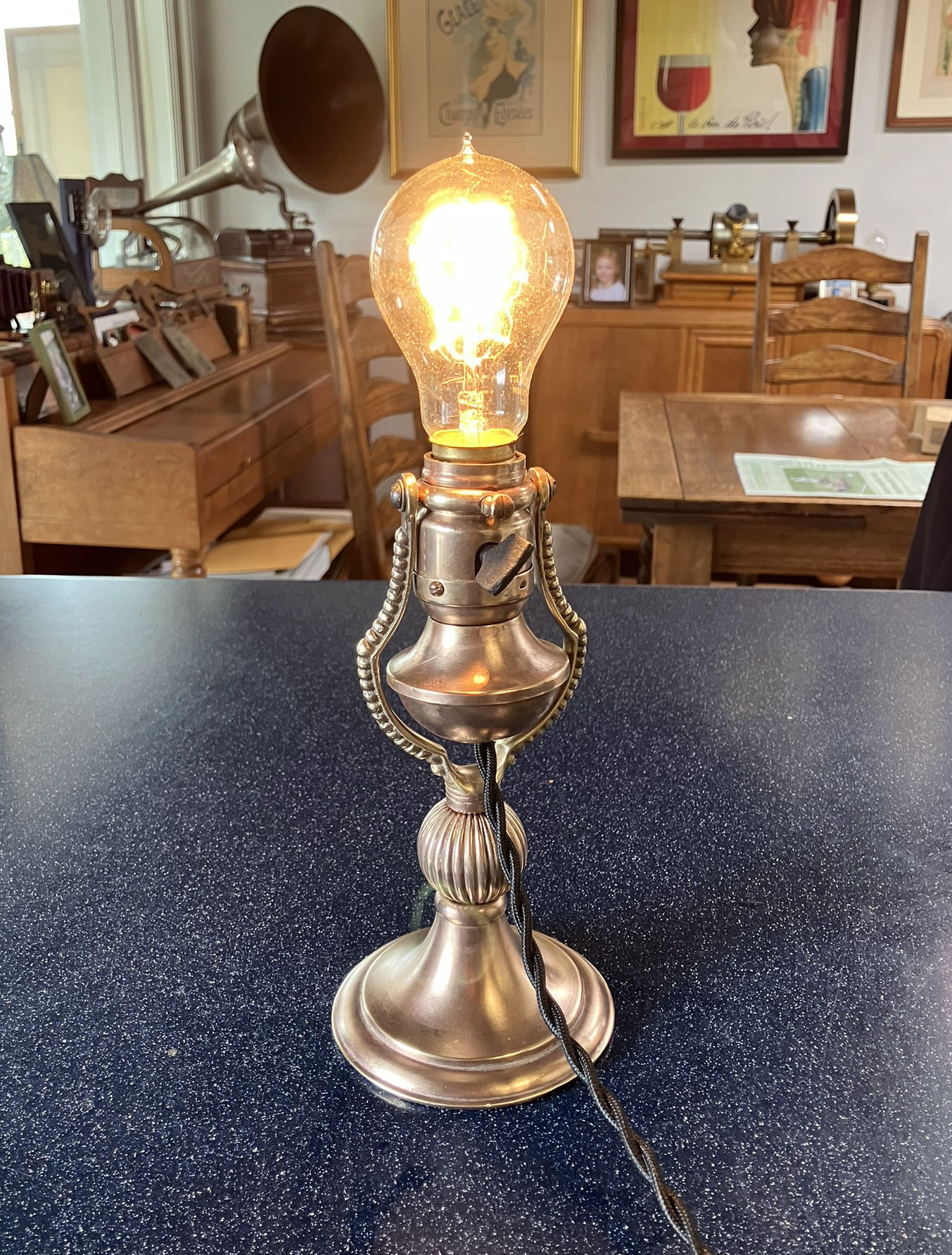 It is rewired with modern cloth-covered twisted wire, and a new plug made to resemble a vintage bakelite original. I will include a new replica filament incandescent bulb for display, complete with its 'evacuation tip' as on early originals.