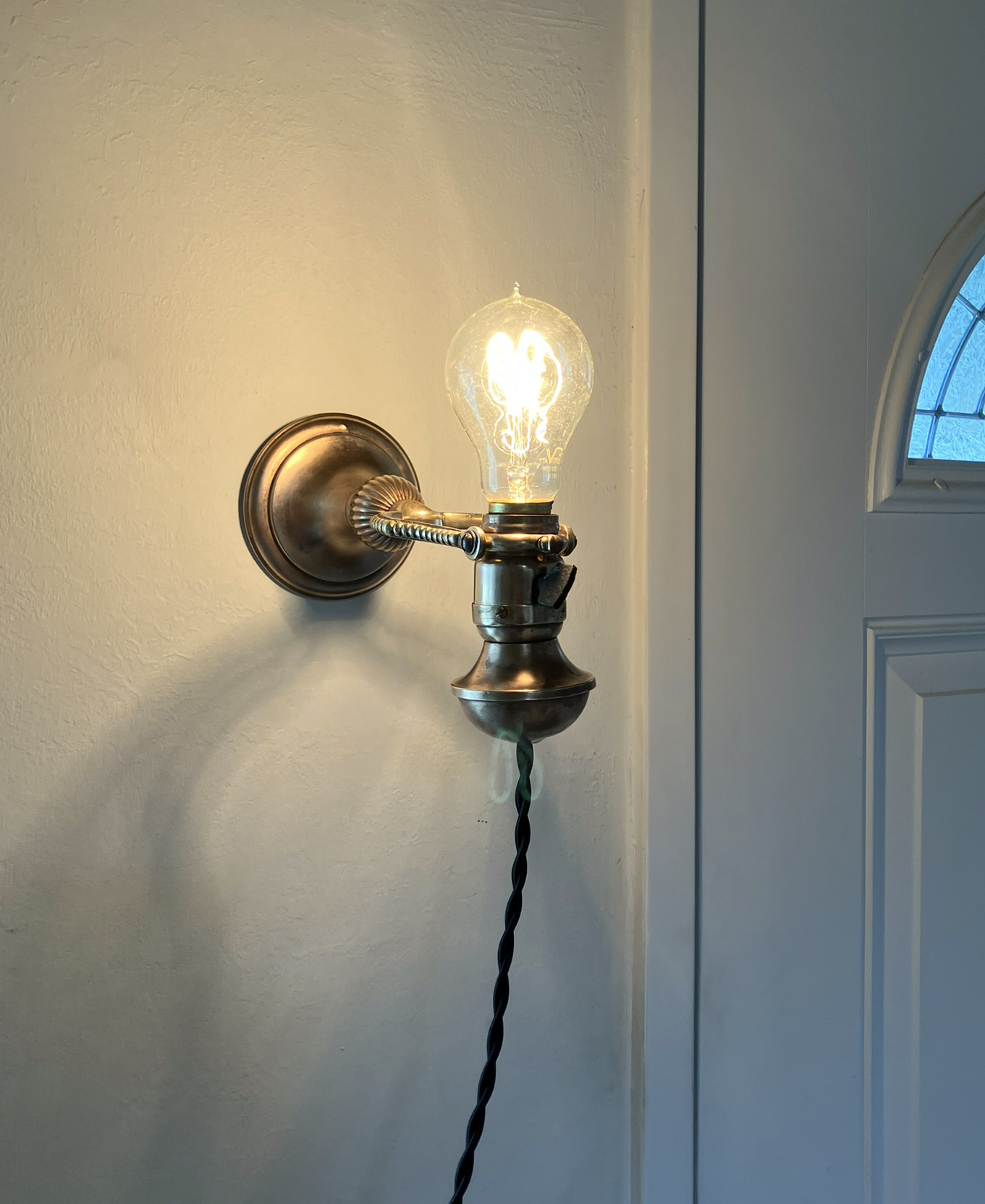 This is a very early (Patented 1895) lamp which can be used as a desk lamp or hung on a wall. The socket has a weighted bottom and swivels within brass arms. A very cool display piece.