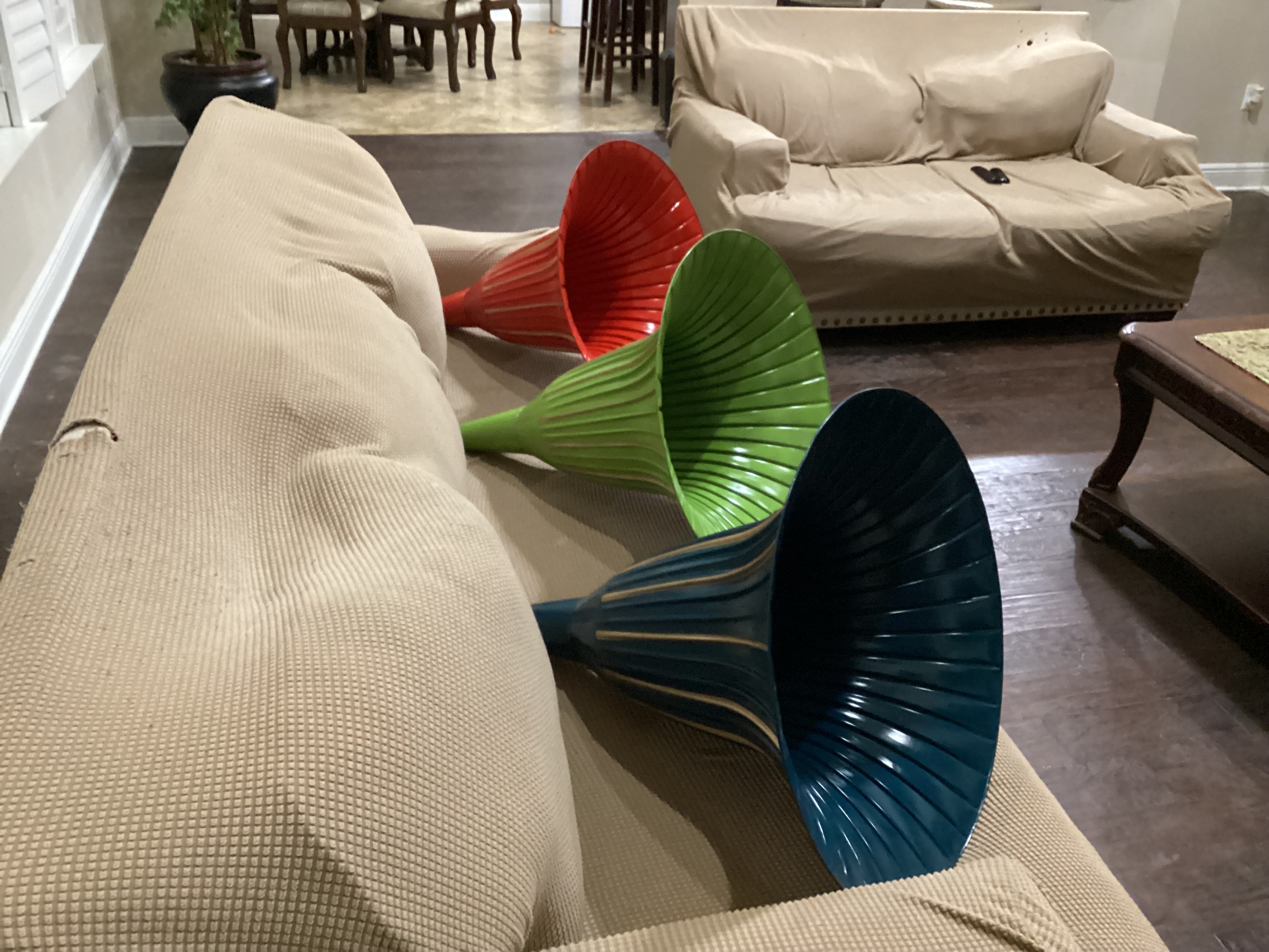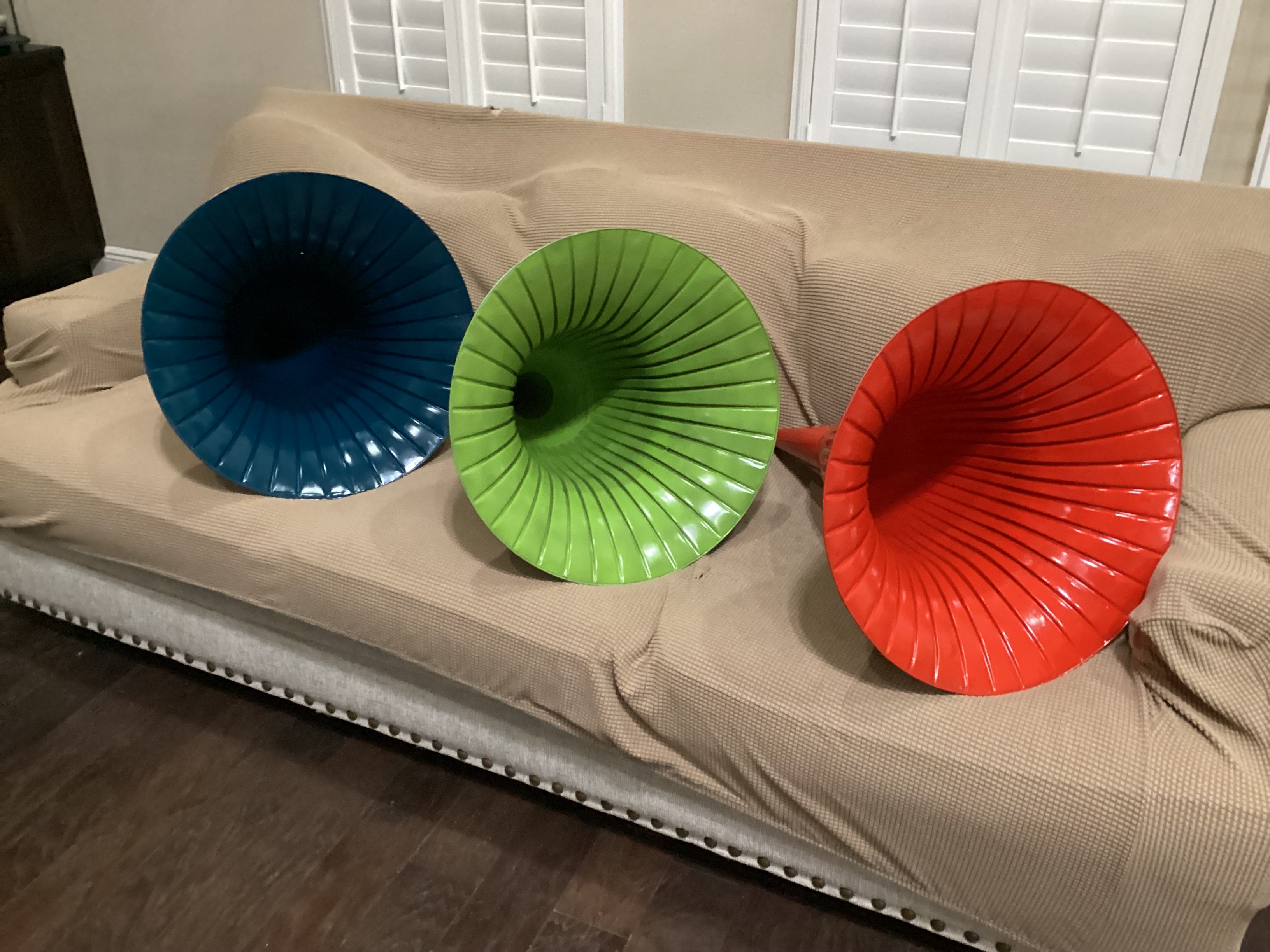 I thought that I would show a few searchlight horns that I had restored…Original paint is awful on these horns..These have been repainted and striped..I think that they turned out very nice.. Now to get some machines for them….