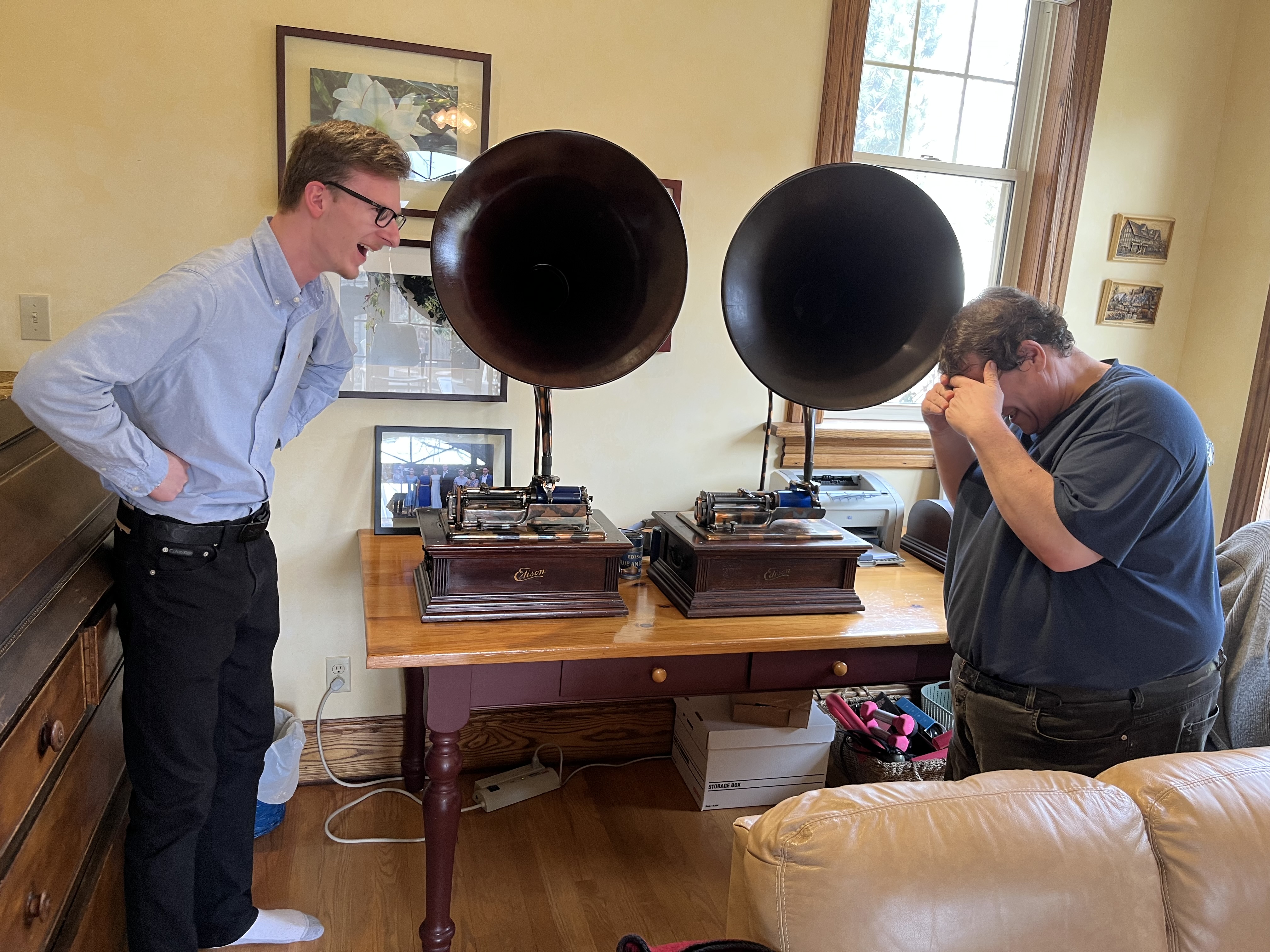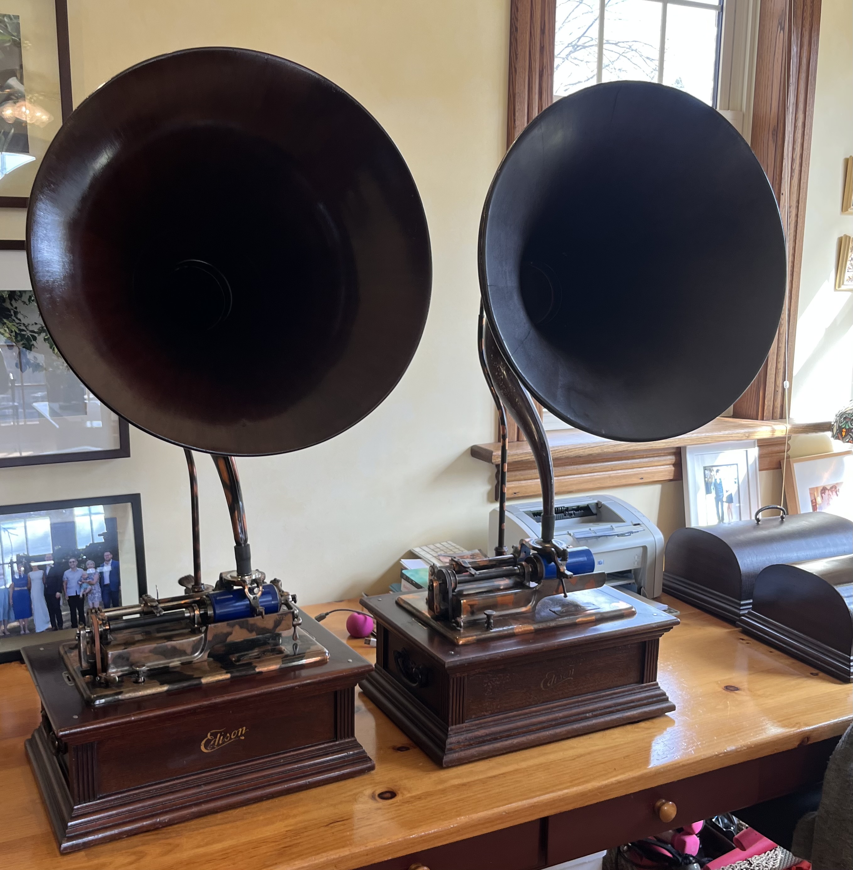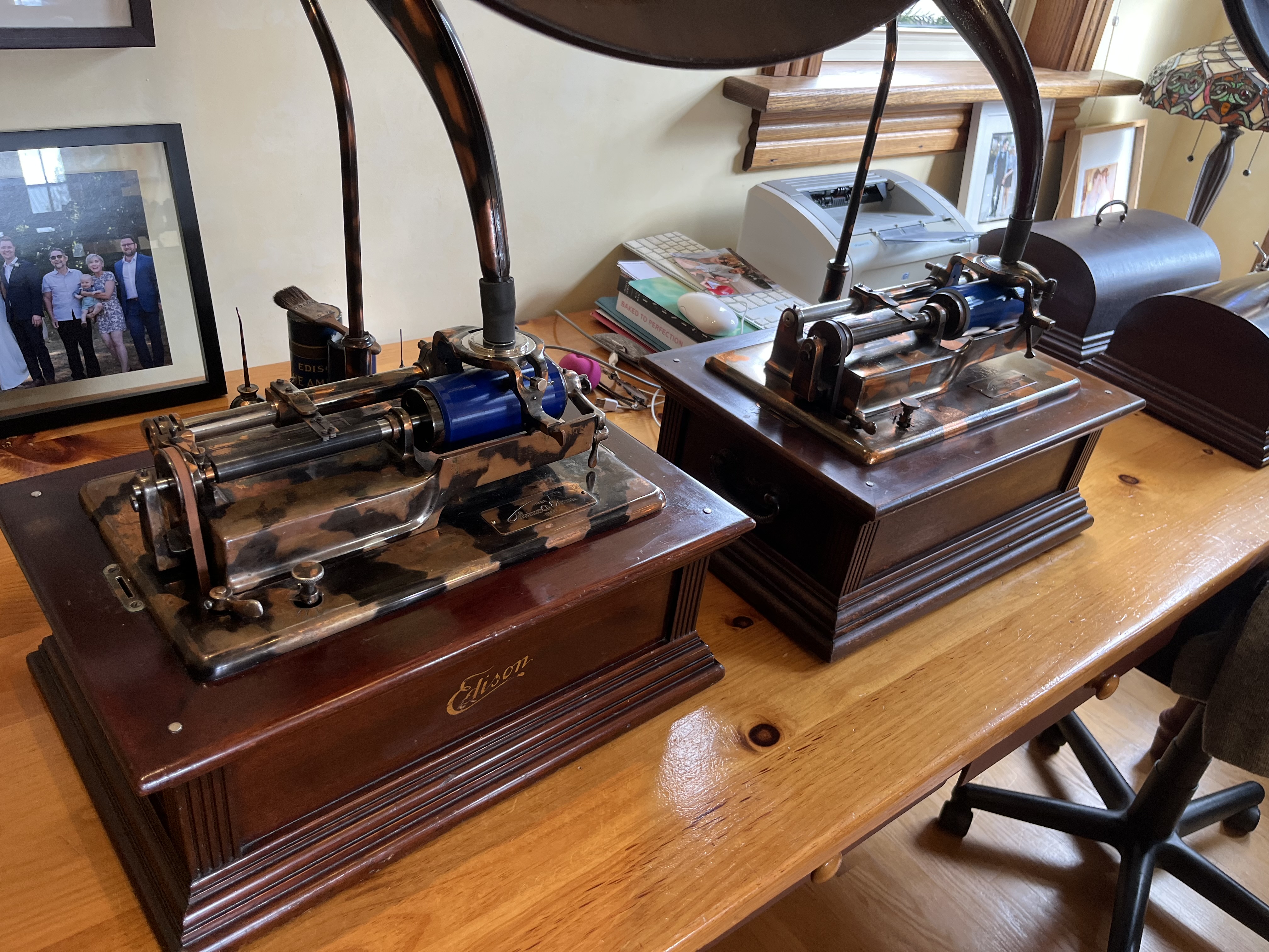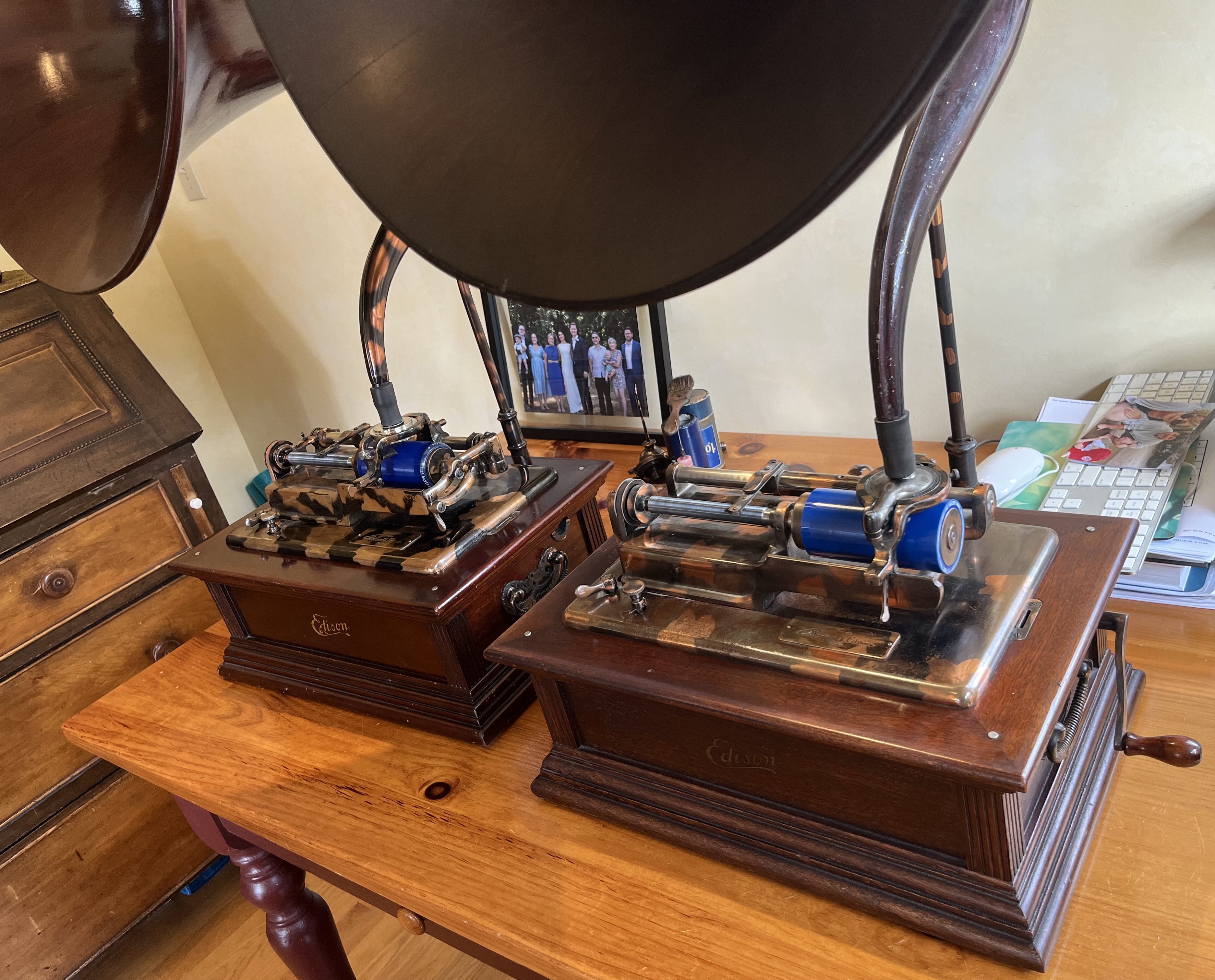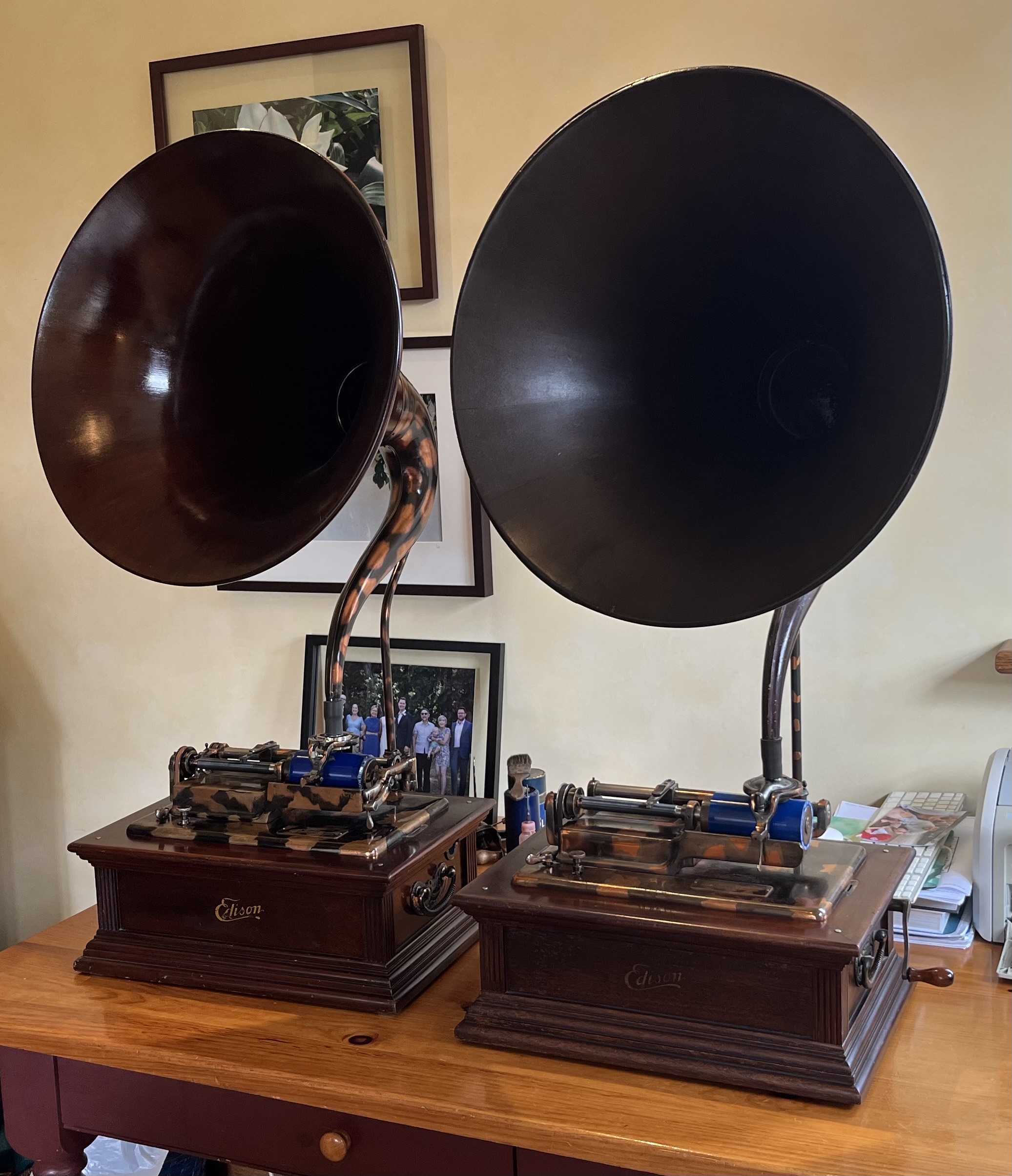 A great get together of friends from Canada and the USA for lunch and phonograph camaraderie. We had an opportunity to bring my Edison Idelia and a dear friend’s Edison Idelia for a rare photograph opportunity to get two of them sitting side by side. The left one is from 1906-07, and mine on the right is from 1910.
