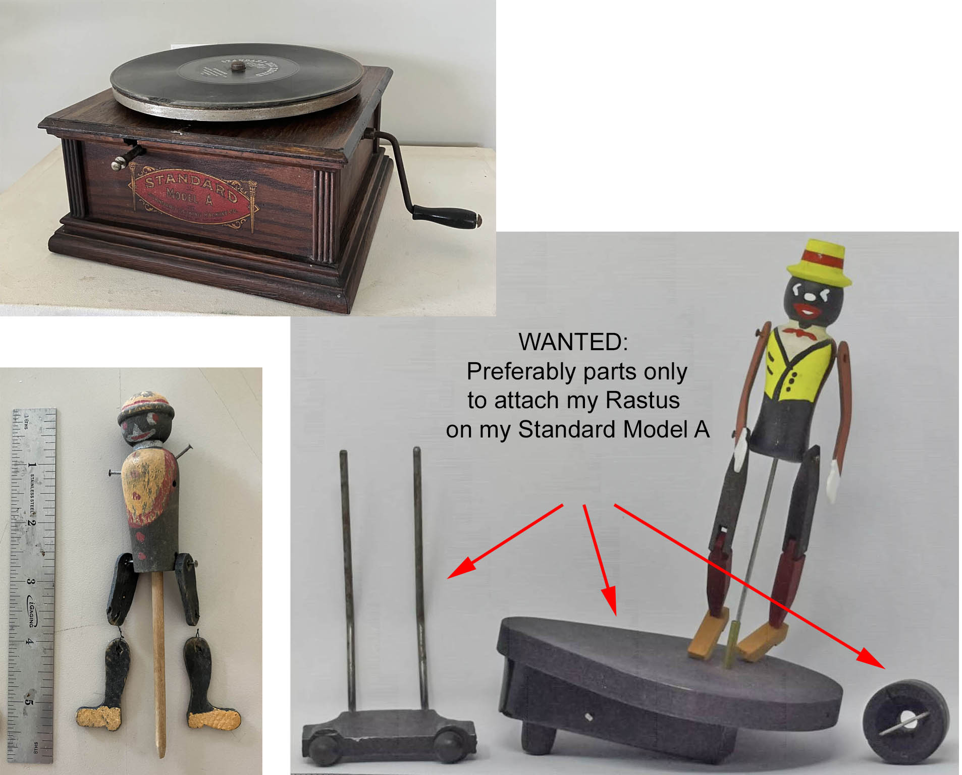 I wondered if it might have been a homemade figure as my searching hasn't turned up an exact match. I do remember seeing it "dance" on an old gramophone of some sort but don't remember how it was attached. As much as I would like to make it work, I might be okay with just having the pieces to make it look like it works. So I'll give some more thought to whether your pieces would do the job.
