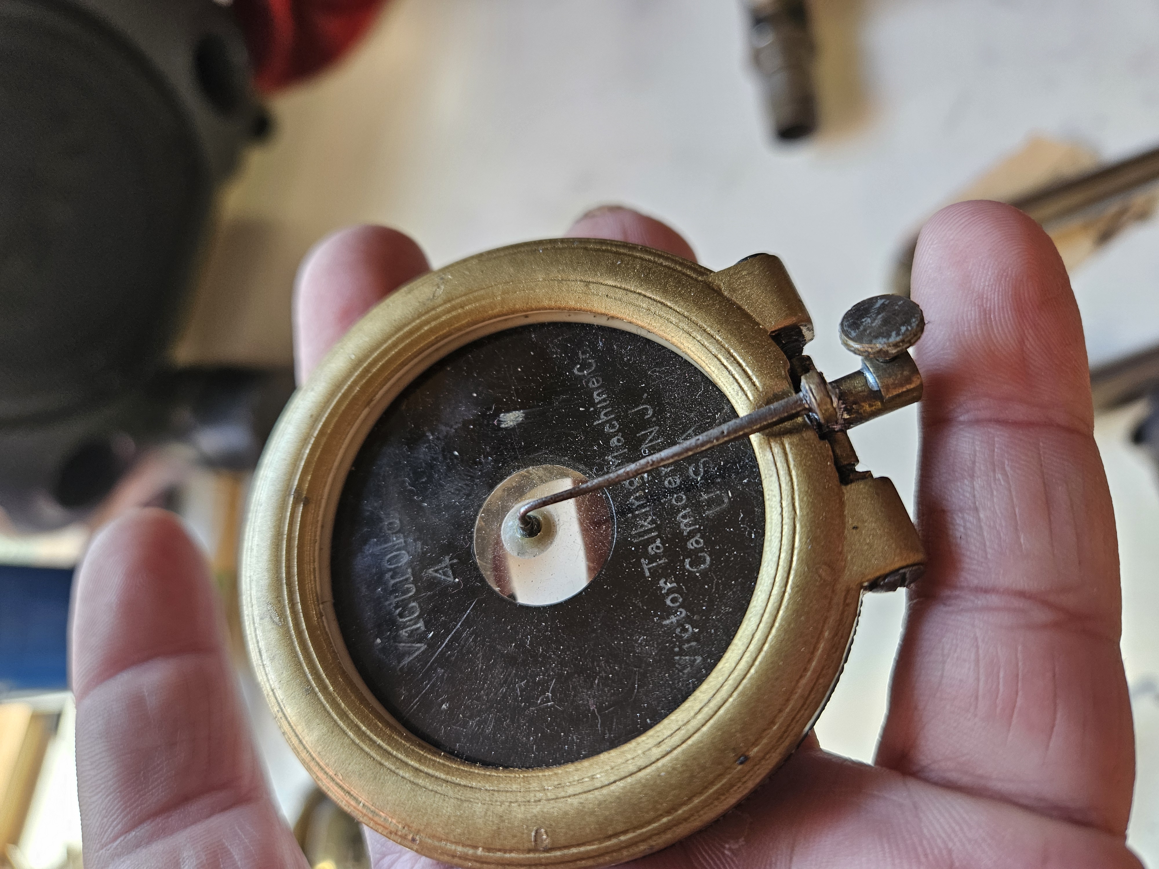 Pot metal Victrola #4 Soundbox, rebuilt as well as I could manage several years ago. It's not a great showpiece, and the needle bar is a bit loose but it performs decently. Painted, as plating was all but gone. Fitted with Orthophonic isolator. $65 plus shipping from metro Detroit. Make an offer if you'd like; I don't know what the market is for these currently, only what it was before Covid.
