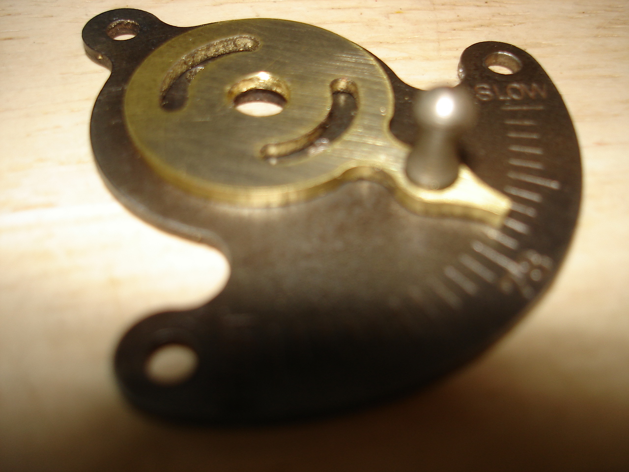 At this past weekend's Stanton auction I picked up an HMV Junior Monarch. From the start, I had questions about the speed control. Looking at images on the internet, there appears to be maybe 3 styles of controls. The first being the common HMV/Victor thumbscrew going through the oval plate. The next, is a control with a pointer that sweeps across a "quadrant" that's graduated from "Fast" to "Slow". The third appears to be a questionable variation of the second, with a thumbscrew, but still using the quadrant plate. Mine seems to resemble the third variant. I suspect that the quadrant plate is correct, but the thumbscrew is not.