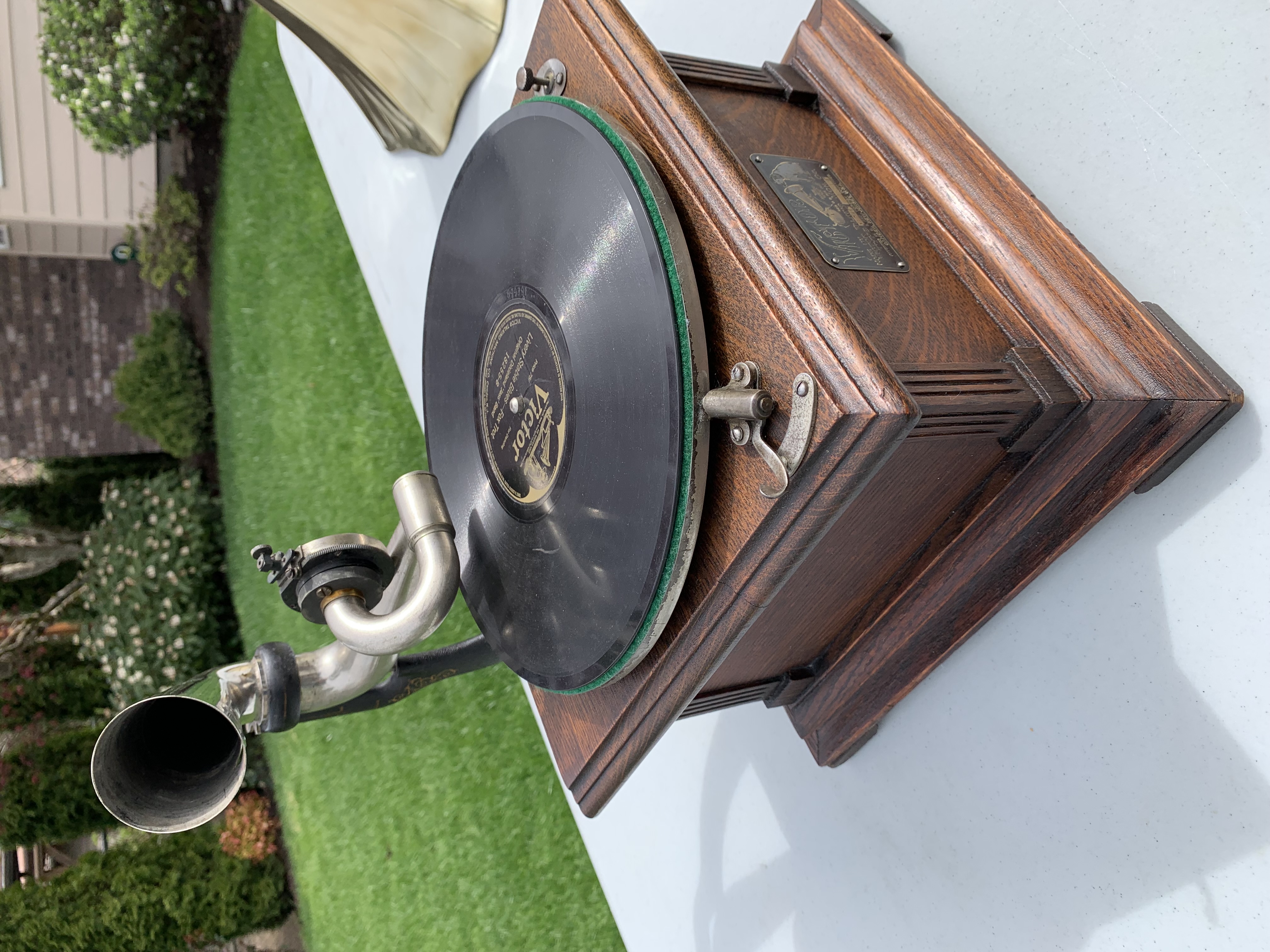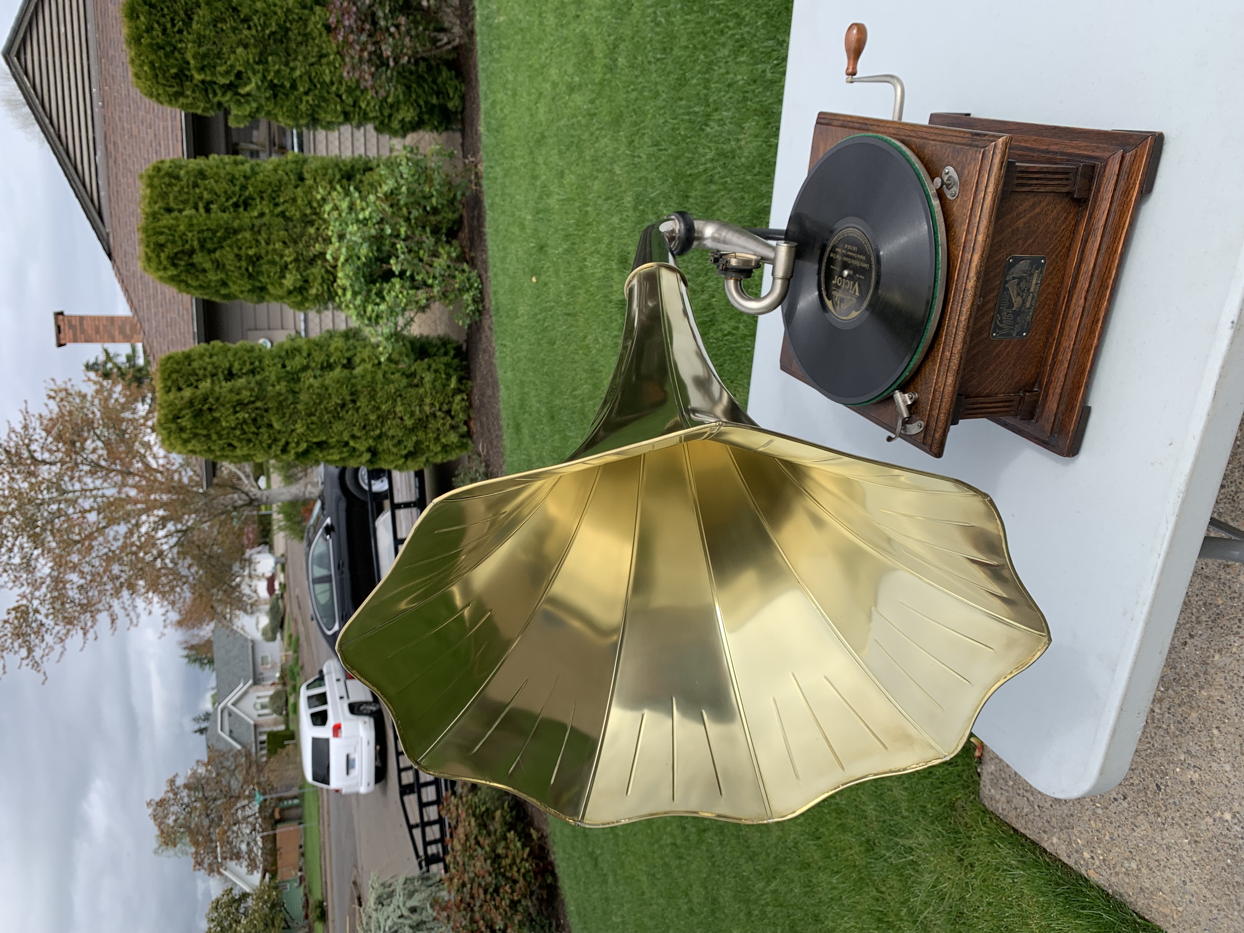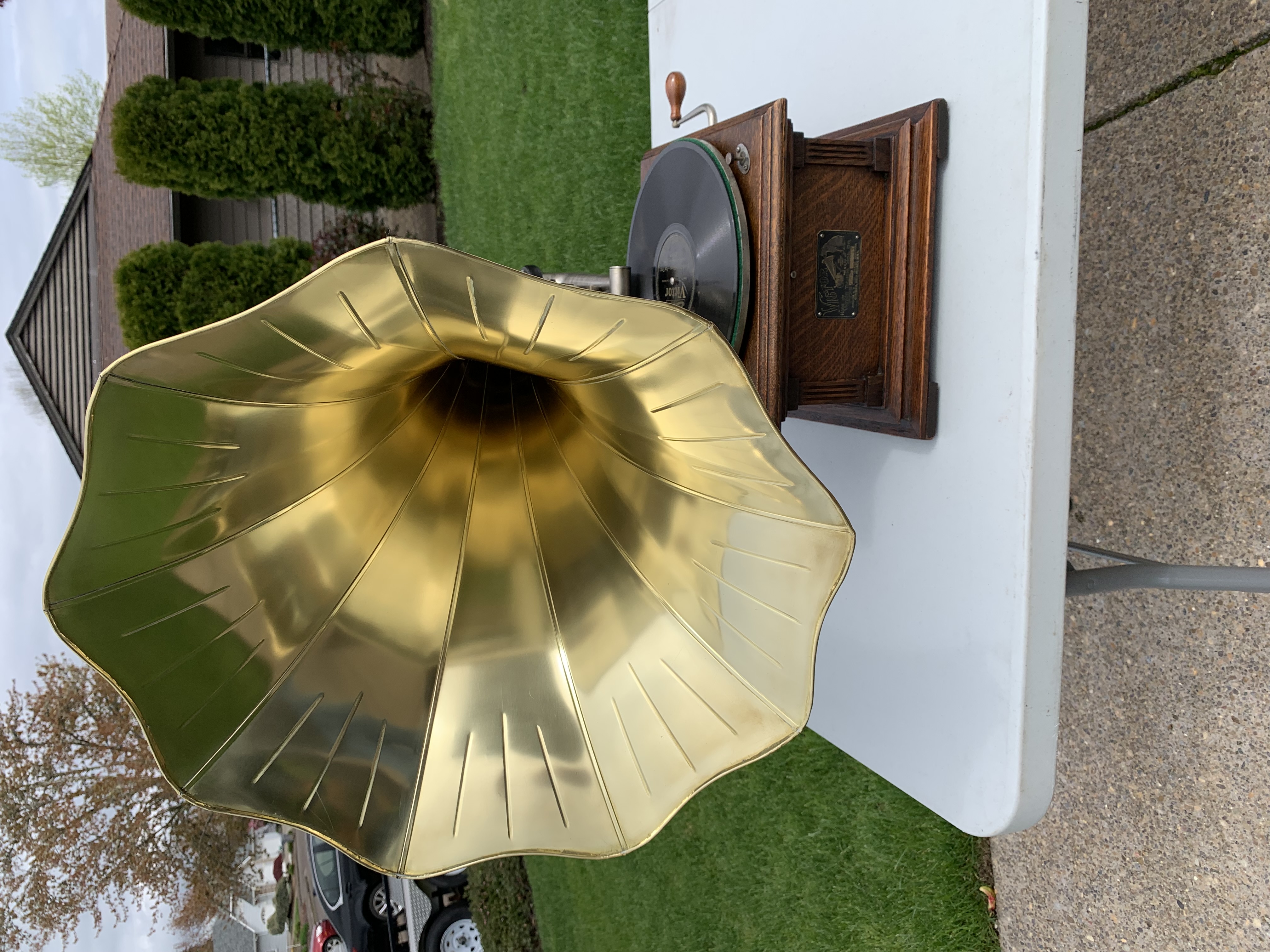 I'll have this amazing Victor II at the Midwest Expo in June. Yes, the horn is a reproduction. It is one of a very small run of all brass #19 horns made by a craftsman on the west coast. The price will be around $1200.