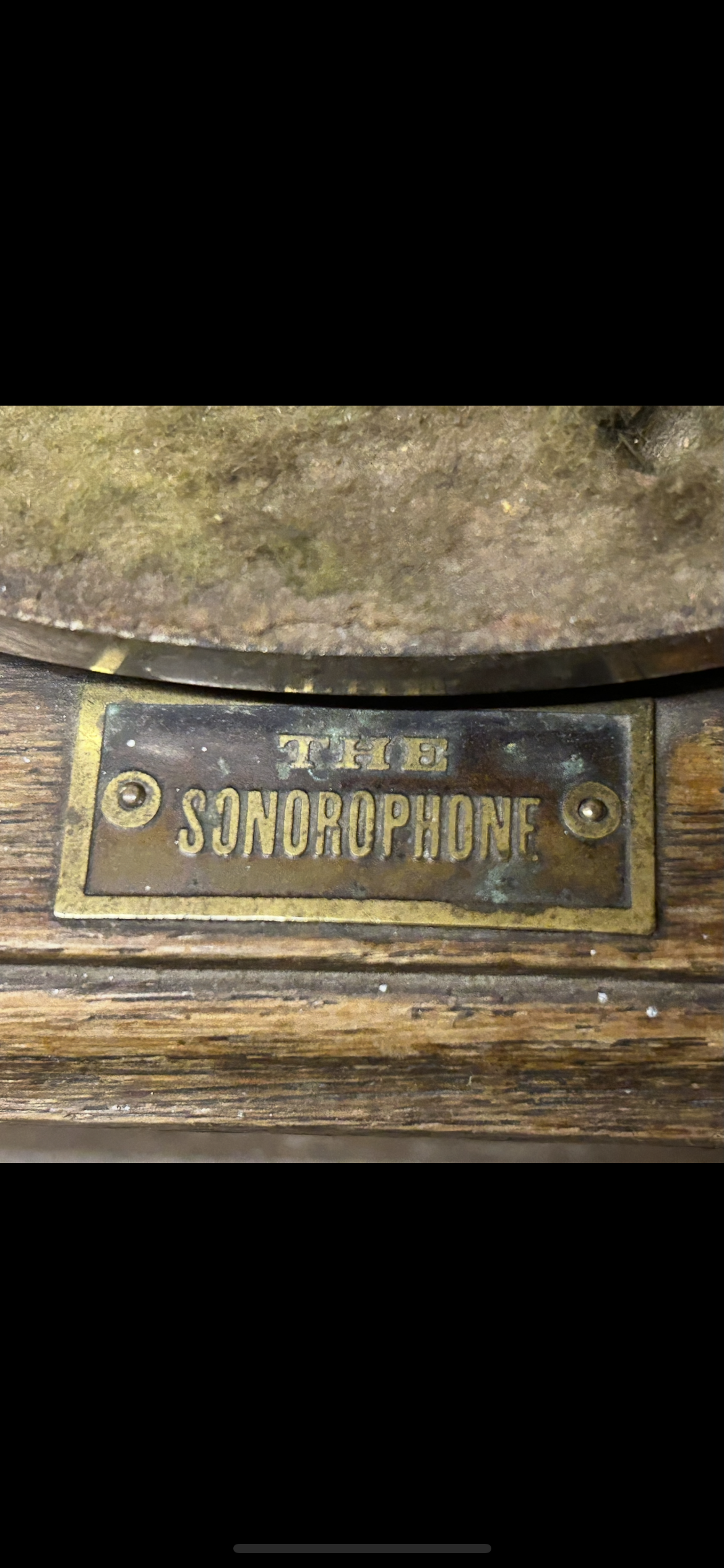 Mine shows marks where there used to be a medallion/wreath on the front. The base is quite wide compared to the top, though the sides of the base on mine were broken off. I replaced the base parts with something not exactly as original and am using a Pathé horn and elbow, which has the same 40mm small opening.